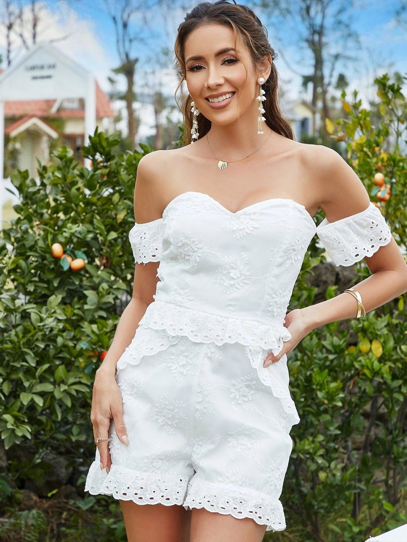 • Off Shoulder Ruffle Hem Schiffy Romper