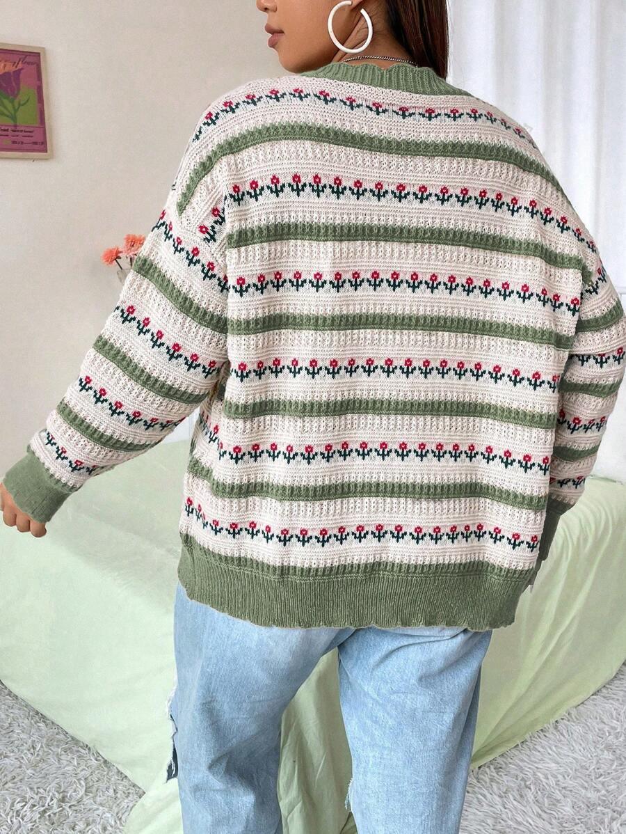 • Plus Floral Striped Pattern Cardigan