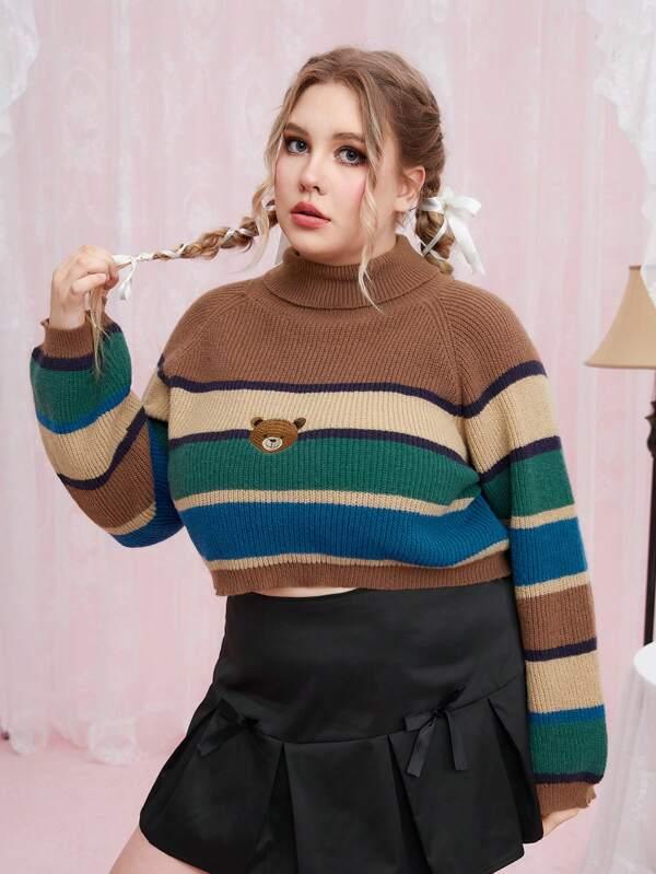 • Striped Pattern Bear Embroidery Raglan Sleeve Sweater
