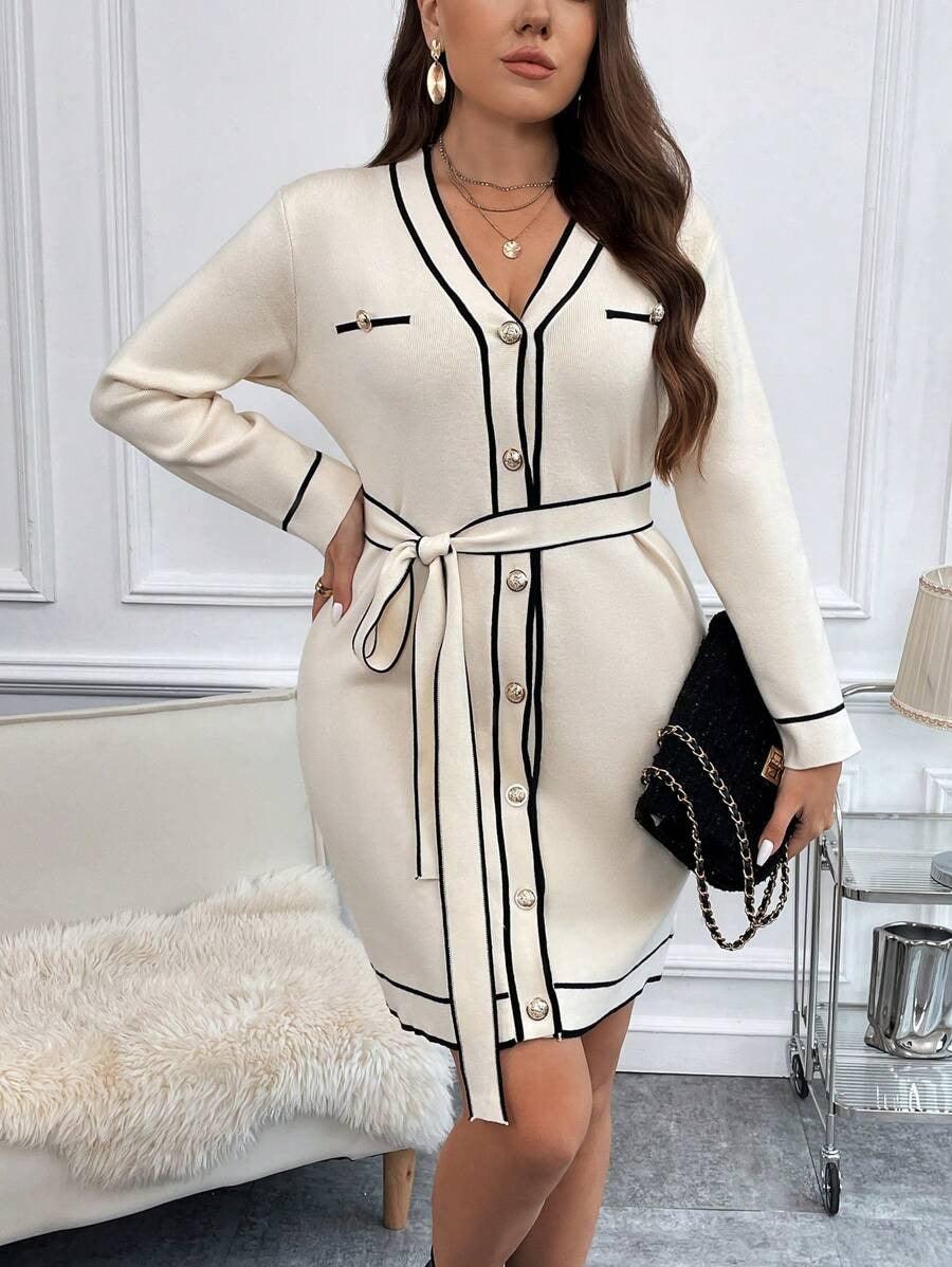 • Contrast Trim Button Front Belted Sweater Dress