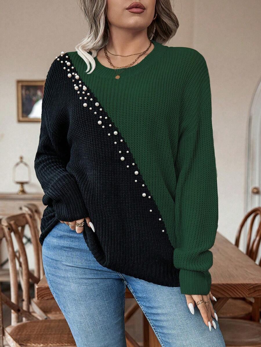• Plus Size Colorblock Sweater With Pearl Detail
