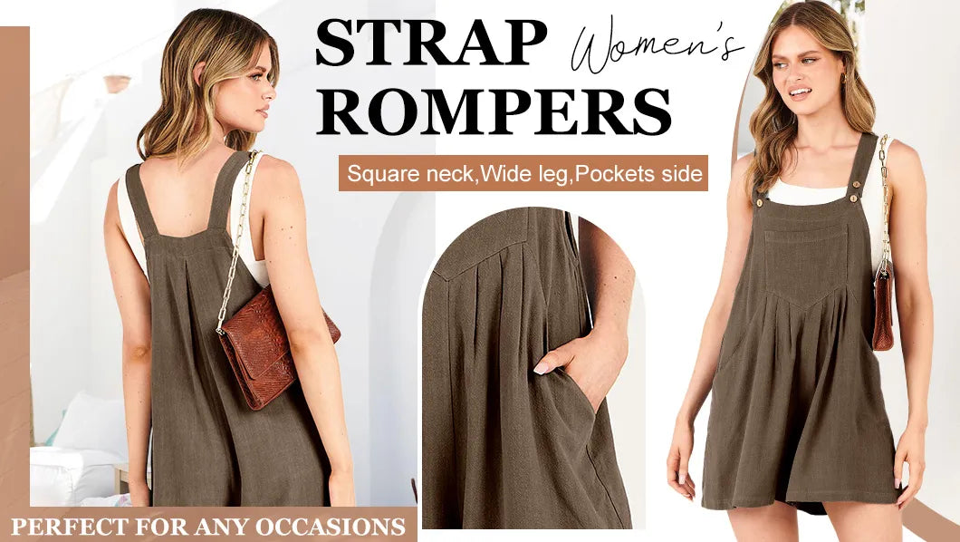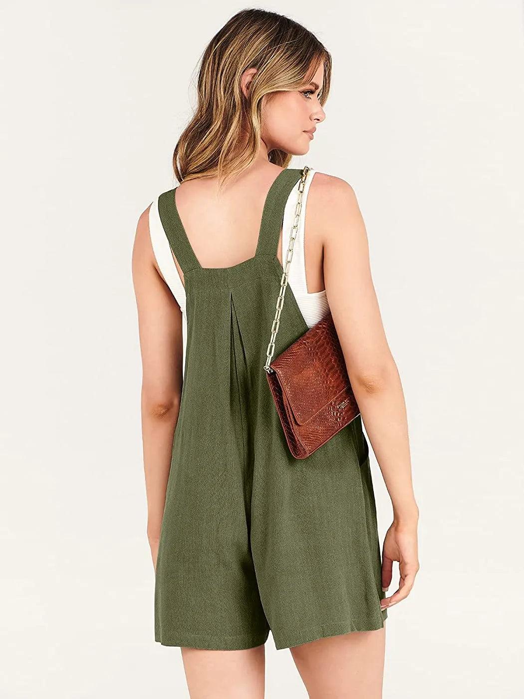 Crafted with adjustable shoulder straps featuring buttons, this jumpsuit offers you the flexibility to personalize the length and fit according to your preferences. It's sleeveless design and square neck grant your arms ample freedom and room to move. The wide-leg pants boast a short style that ensures a relaxed and comfortable fit without any tightness or constraints. Complete with convenient side pockets, it's perfect for effortlessly carrying your essentials while on the move.