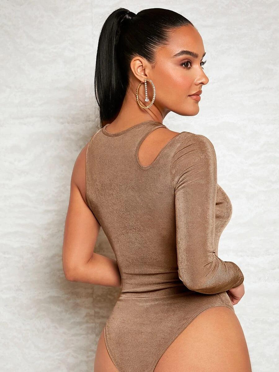 The Asymmetrical Neck Cut Out Slim Fit Bodysuit is a stylish and comfortable casual wear designed to enhance the natural curves of the body. This bodysuit features a plain pattern type with a tee design, a round neckline, and long sleeves with regular sleeves type. The highlight of this bodysuit is its asymmetrical neck cut-out detail, adding a touch of uniqueness to its overall design.