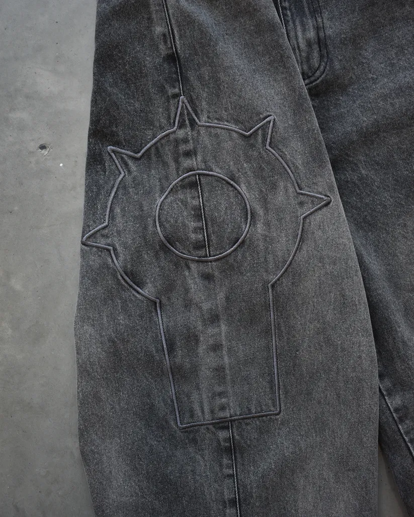 The Baggy Fit Embroidered Denim Jeans with Leather Patch present a bold combination of artwork, structure and modern streetwear influence. Designed with a washed grey tone, these jeans feature both front and back embroidery, creating a standout appearance from every angle. The baggy cut delivers a wide calf silhouette that pairs easily with many outfits, making these jeans suitable for daily wear or expressive styling.