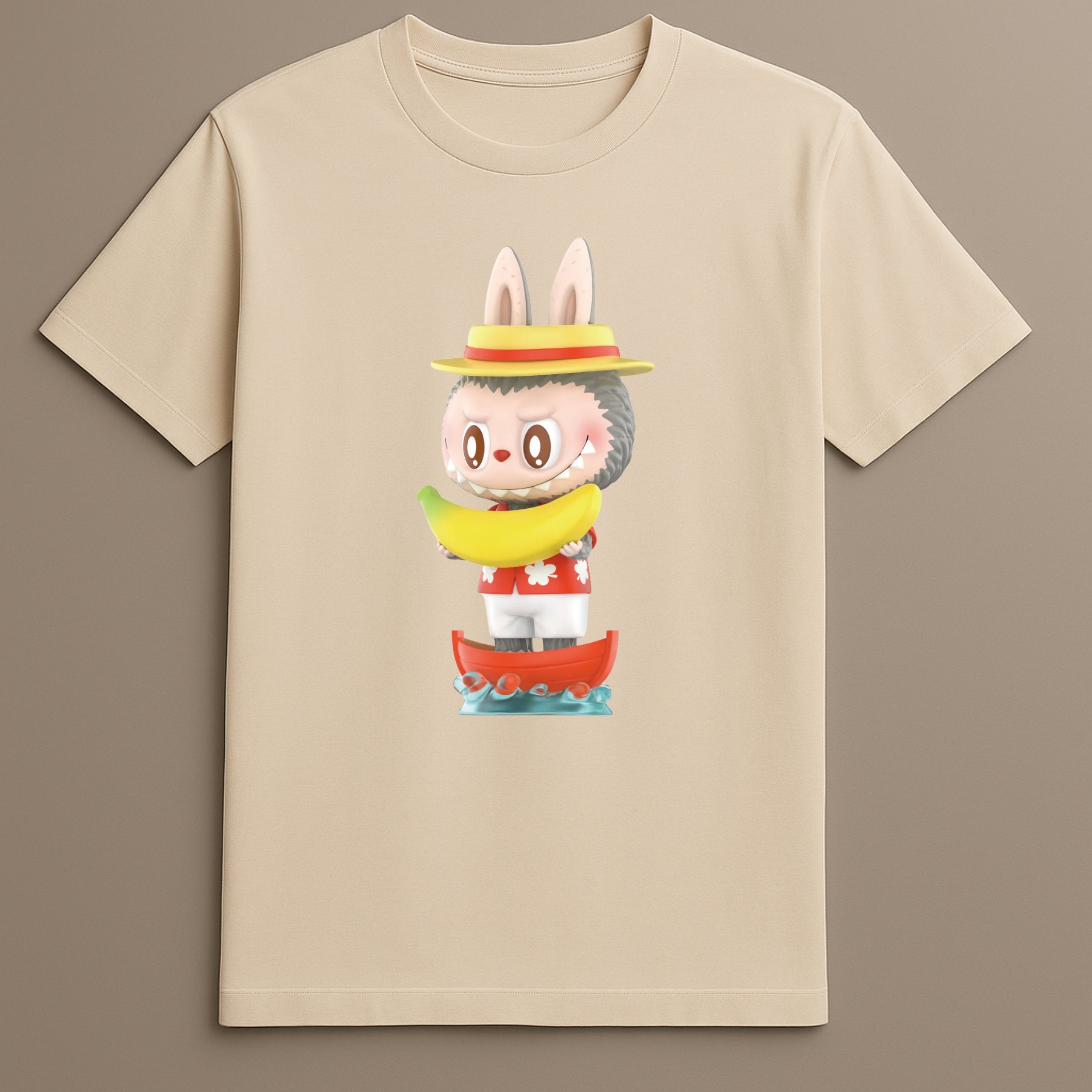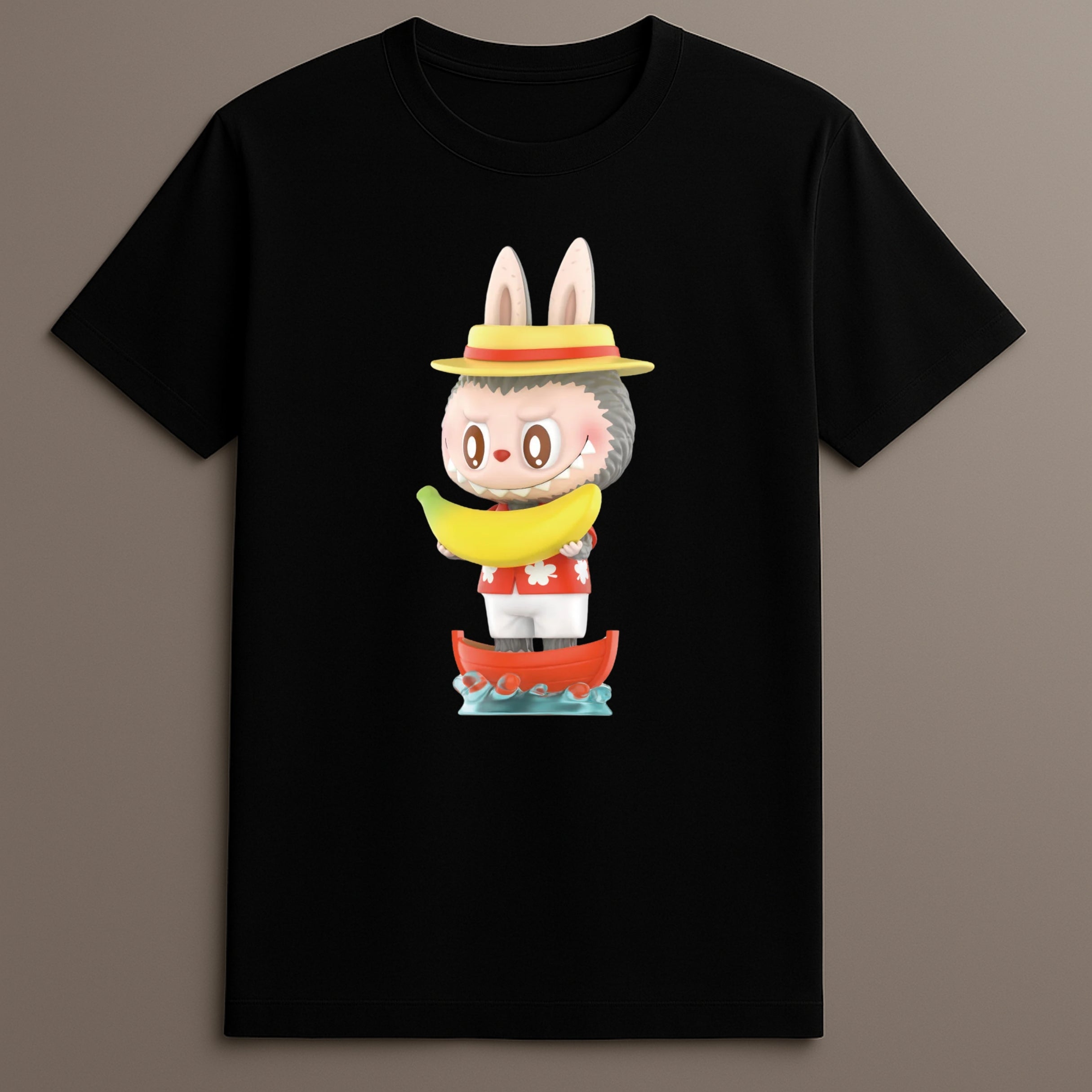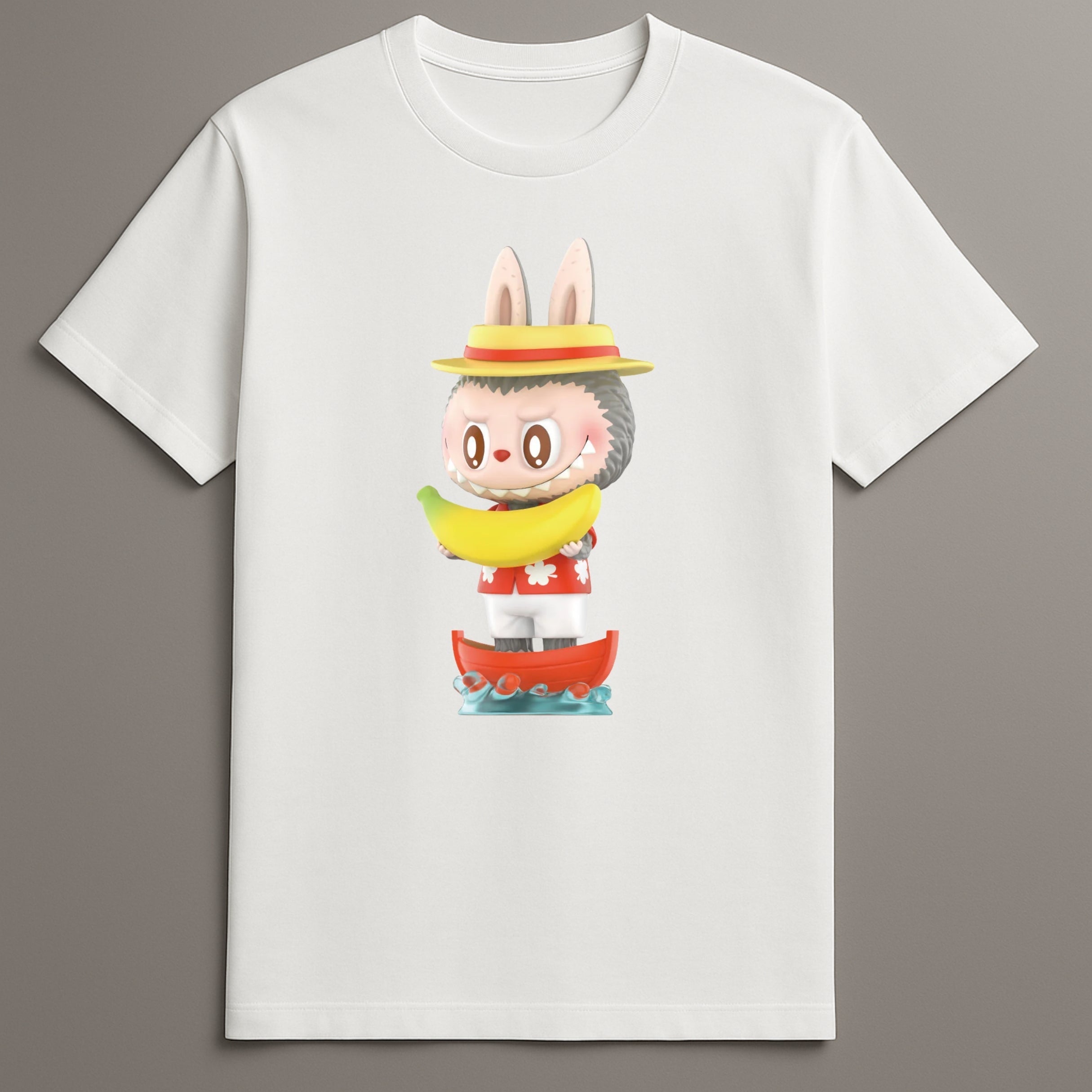 Banana Character Print Centerpiece: The banana character print shows Labubu holding a fruit in a joyful pose. It brings energy to a clean base.
