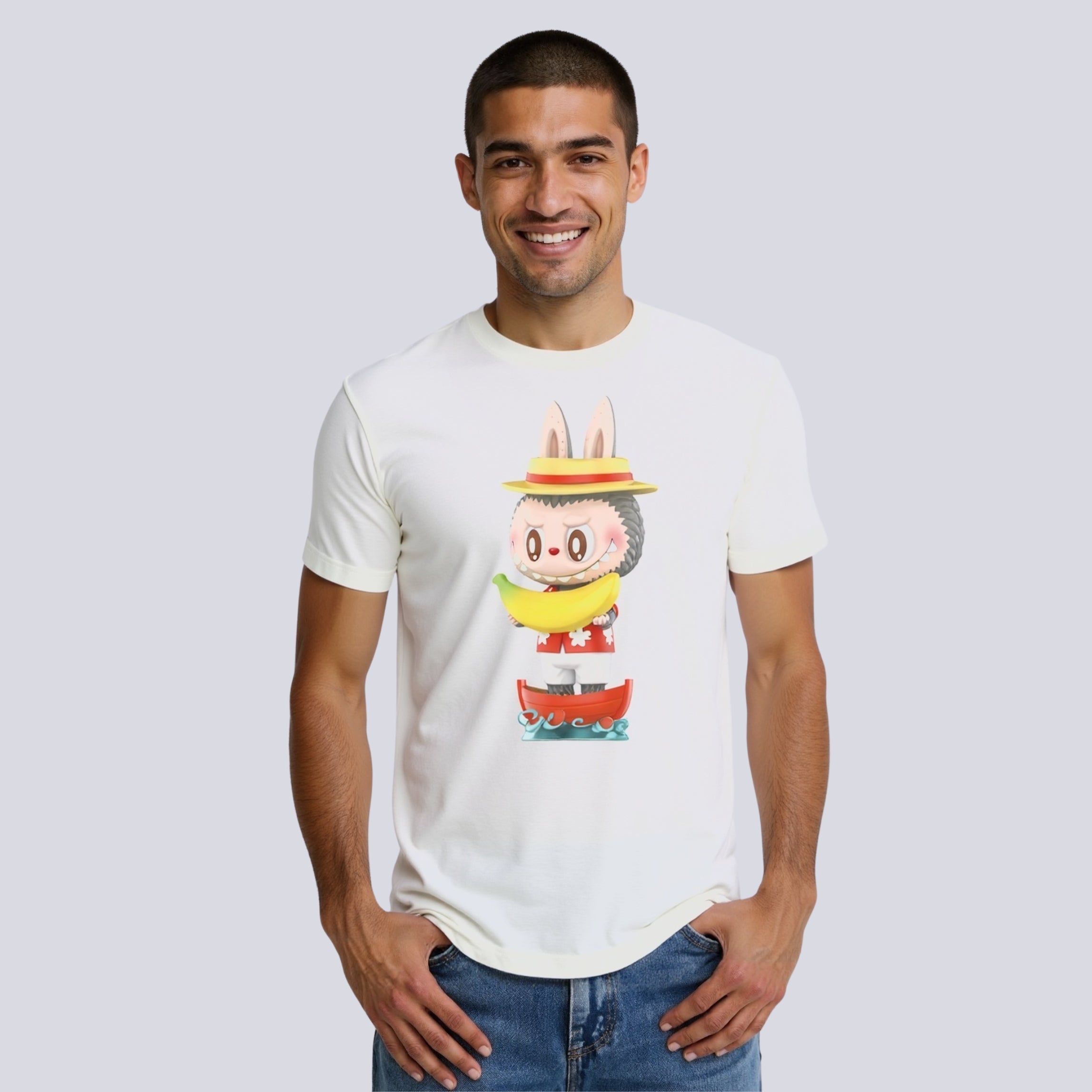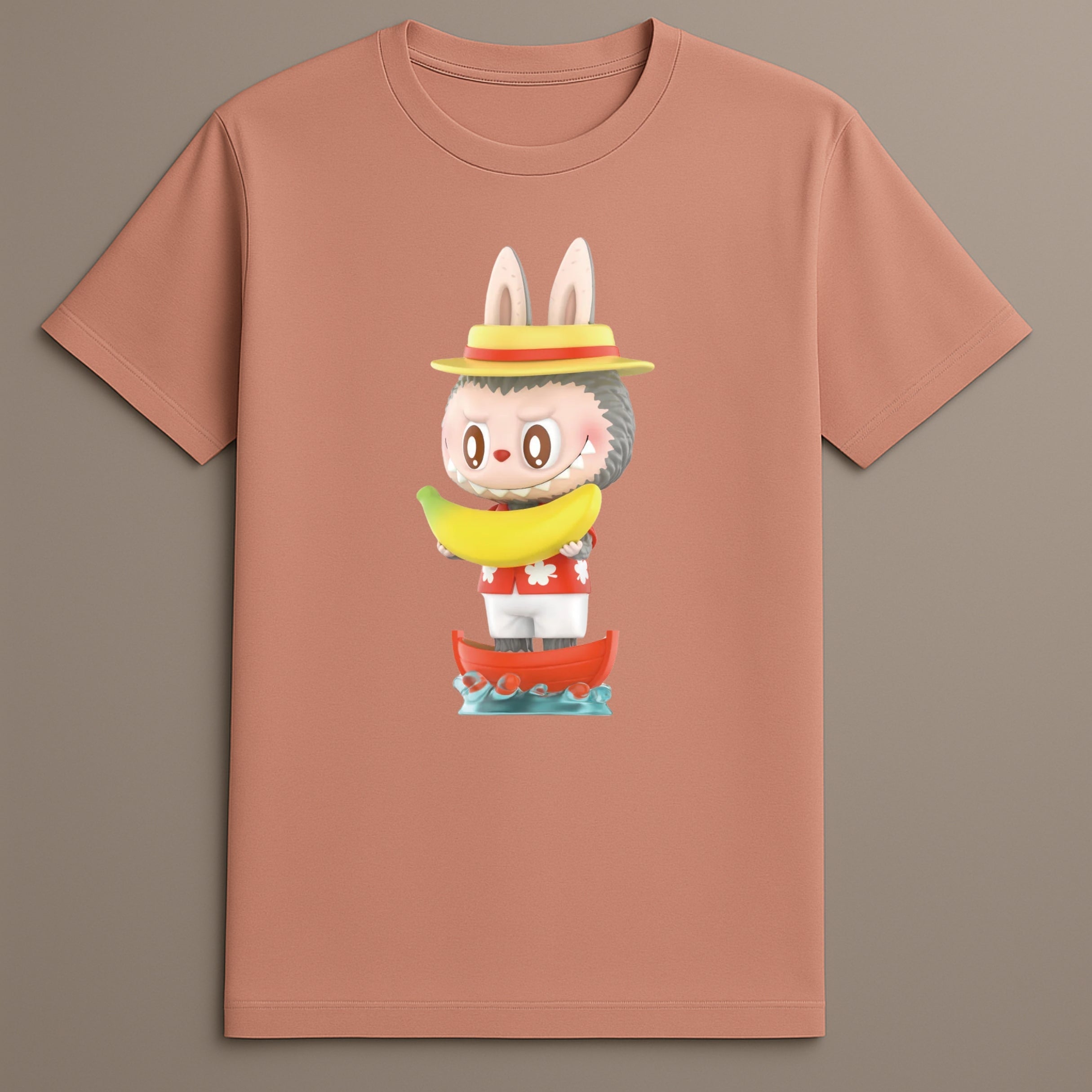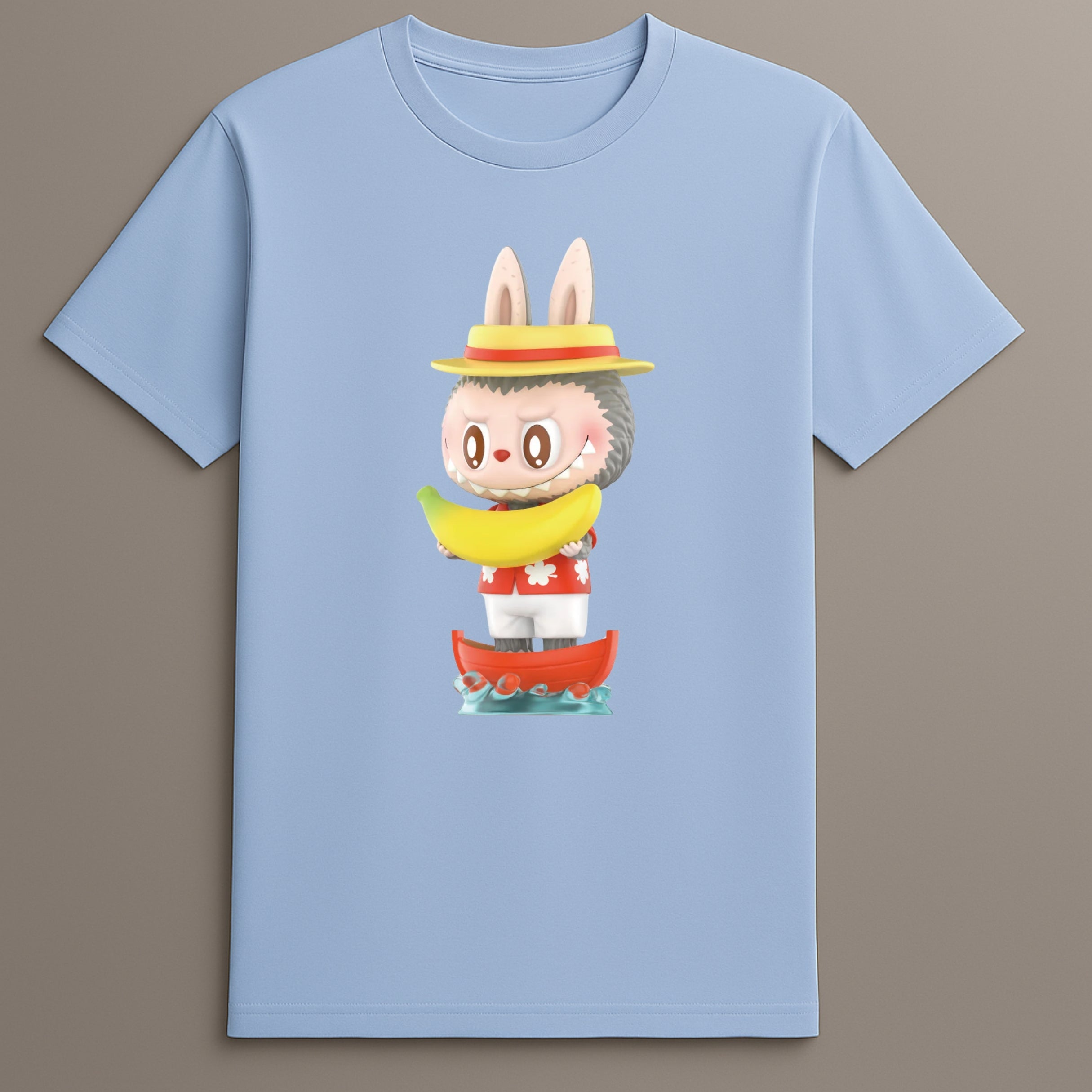 Banana Character Print Centerpiece: The banana character print shows Labubu holding a fruit in a joyful pose. It brings energy to a clean base.