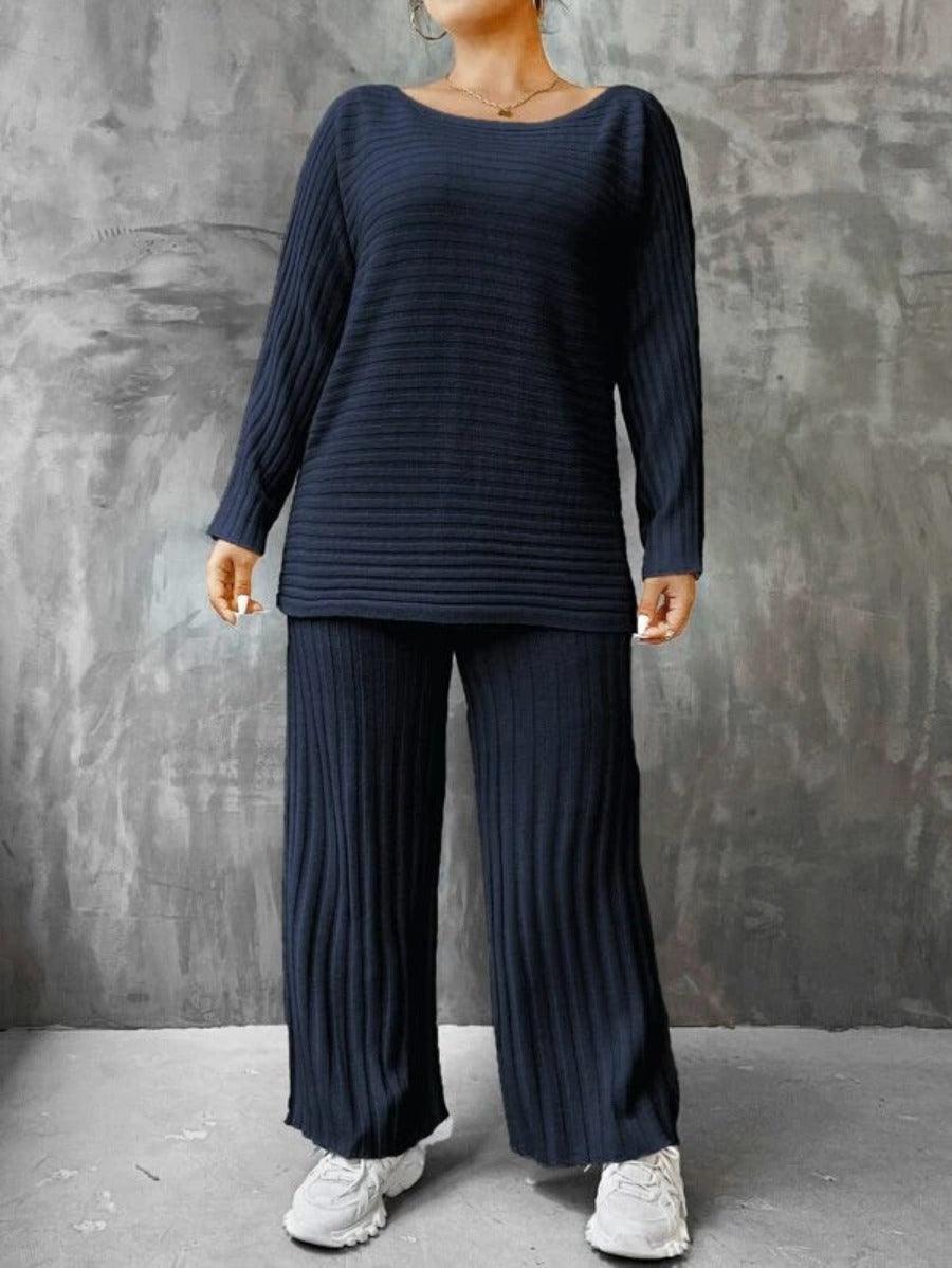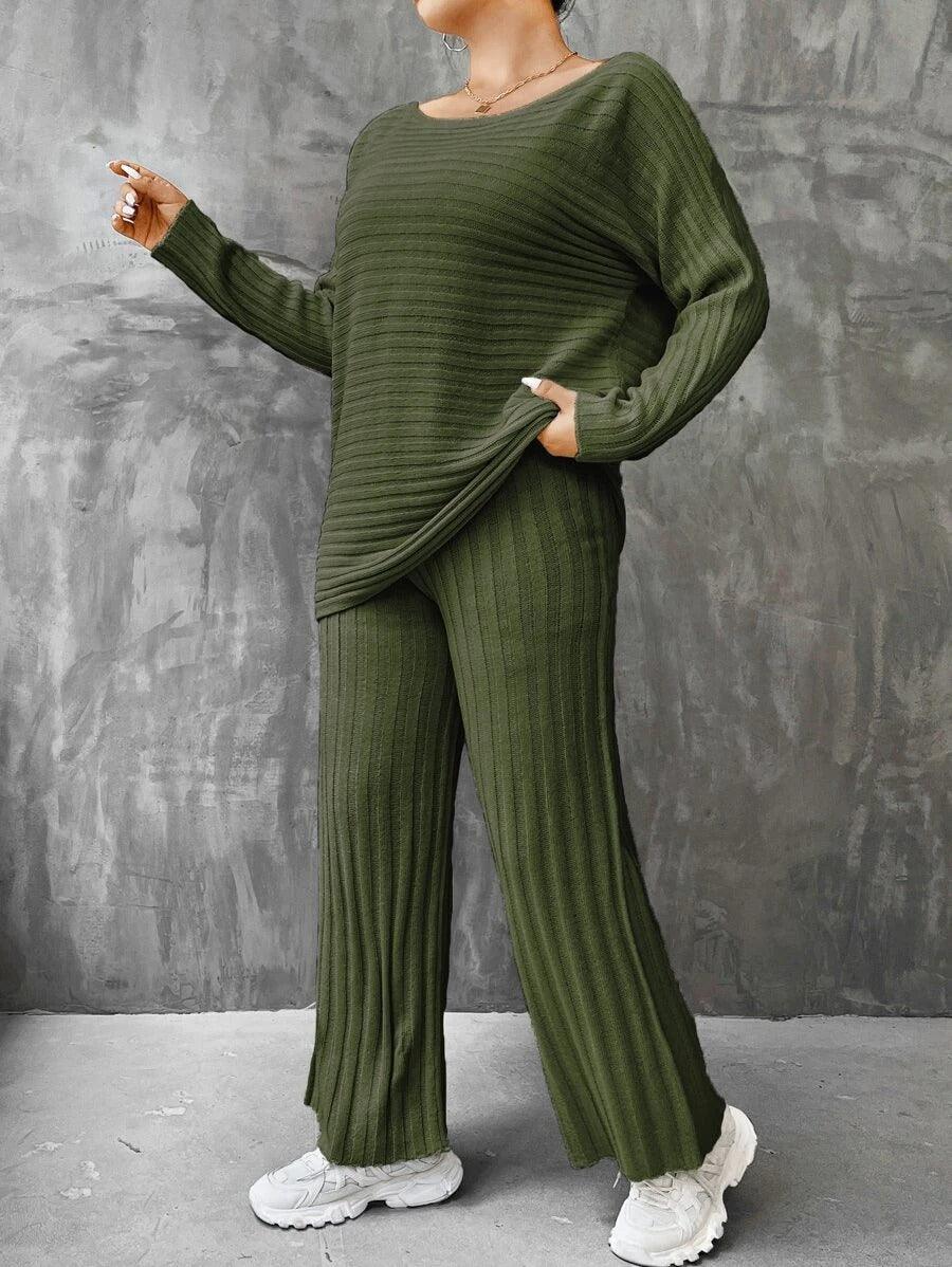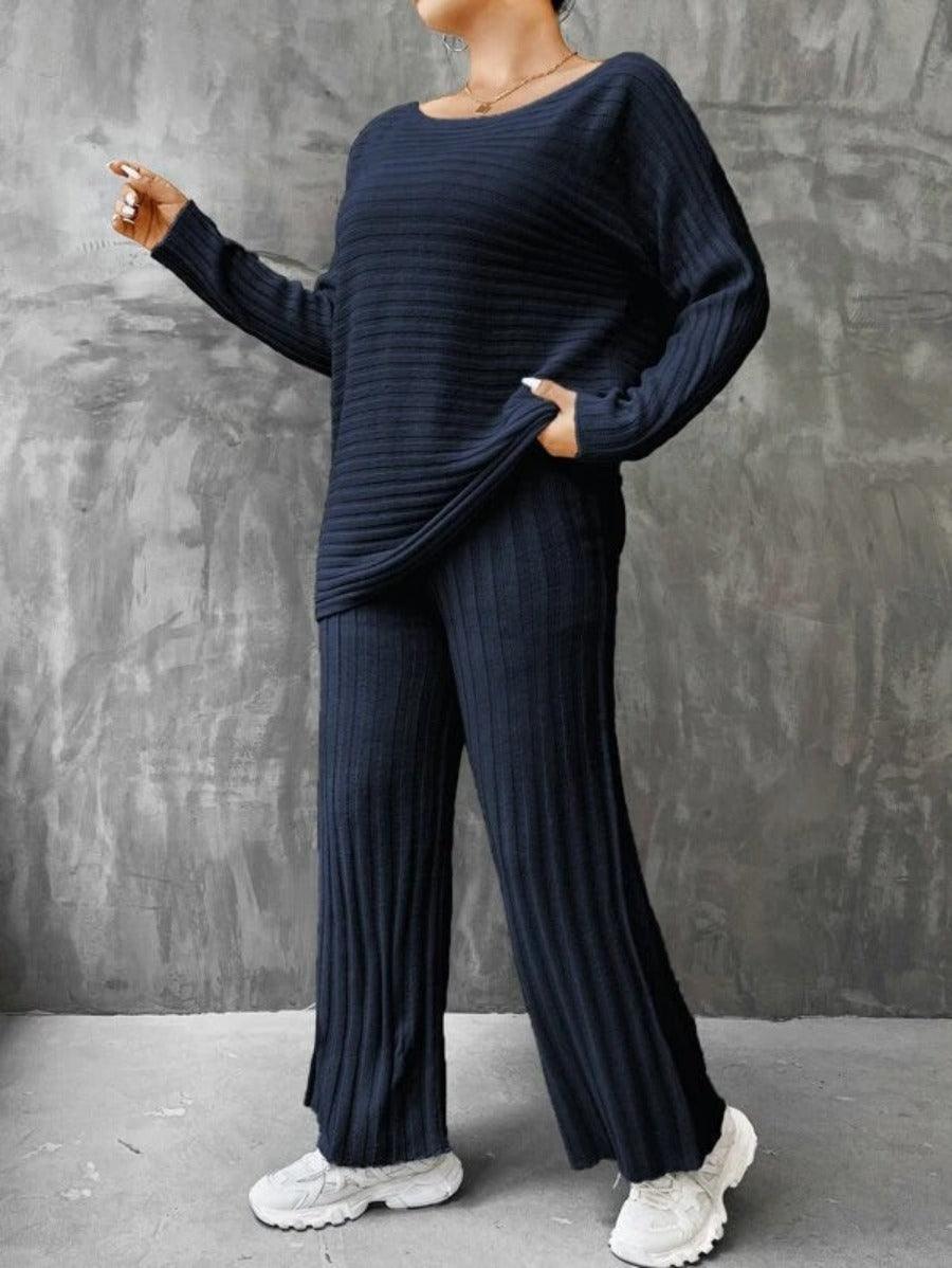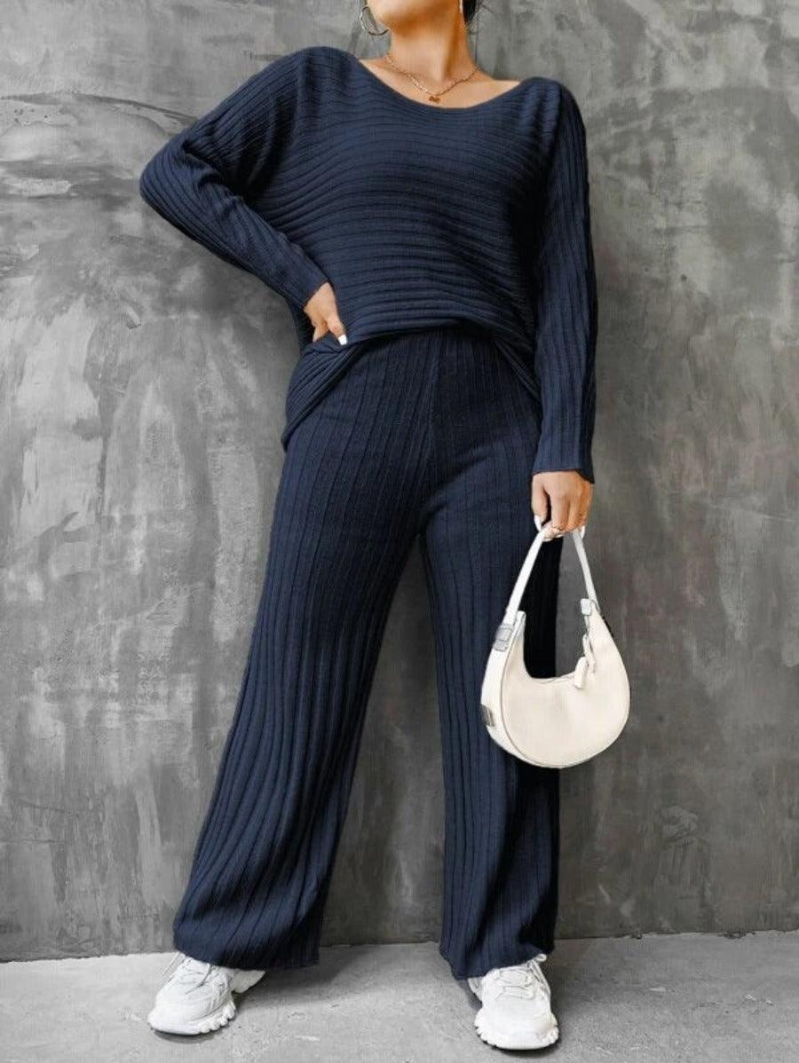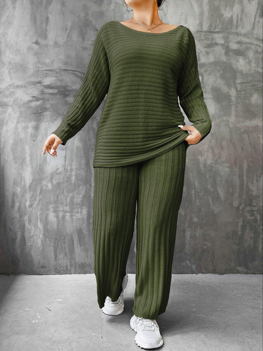 The rib-knit detail set adds dimension, complemented by the long sleeve sweater top and batwing sleeve design for consistent coverage and ease of movement. With slight stretch sweater fabric and everyday knitwear pullover construction, this set offers practical comfort and structured styling for mild seasons.