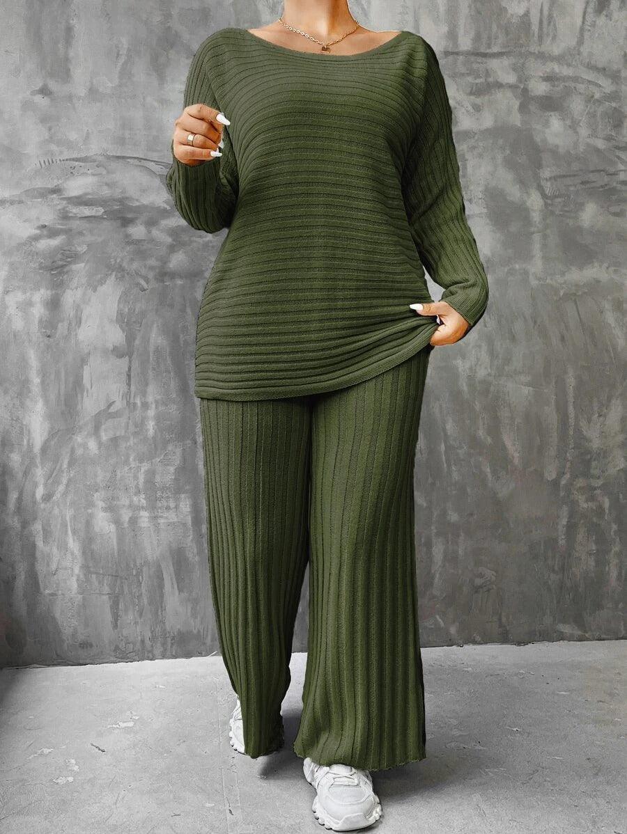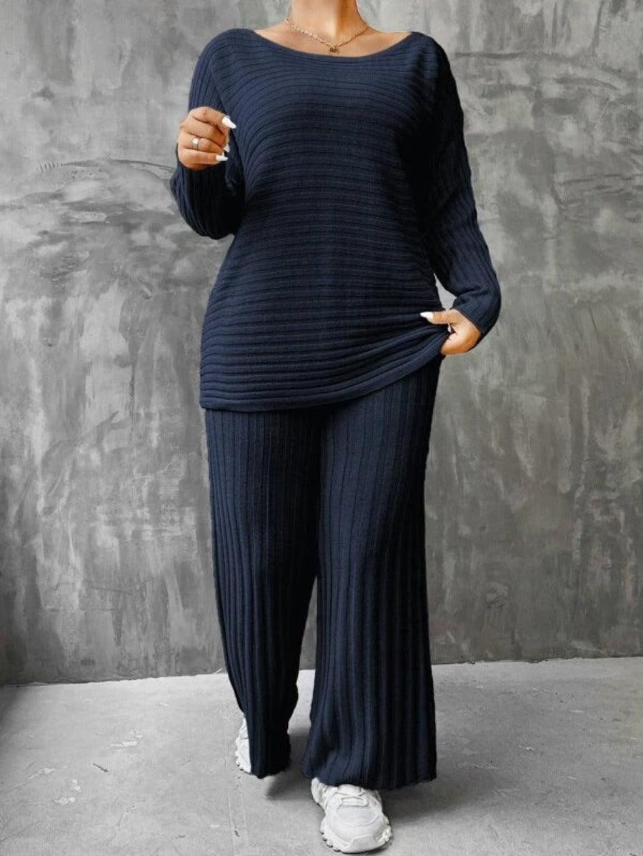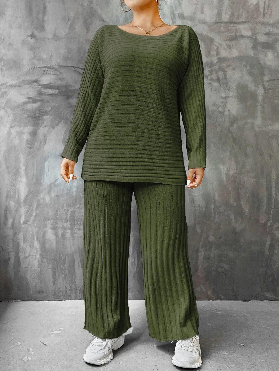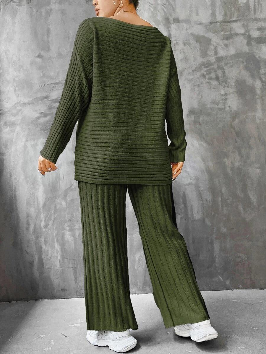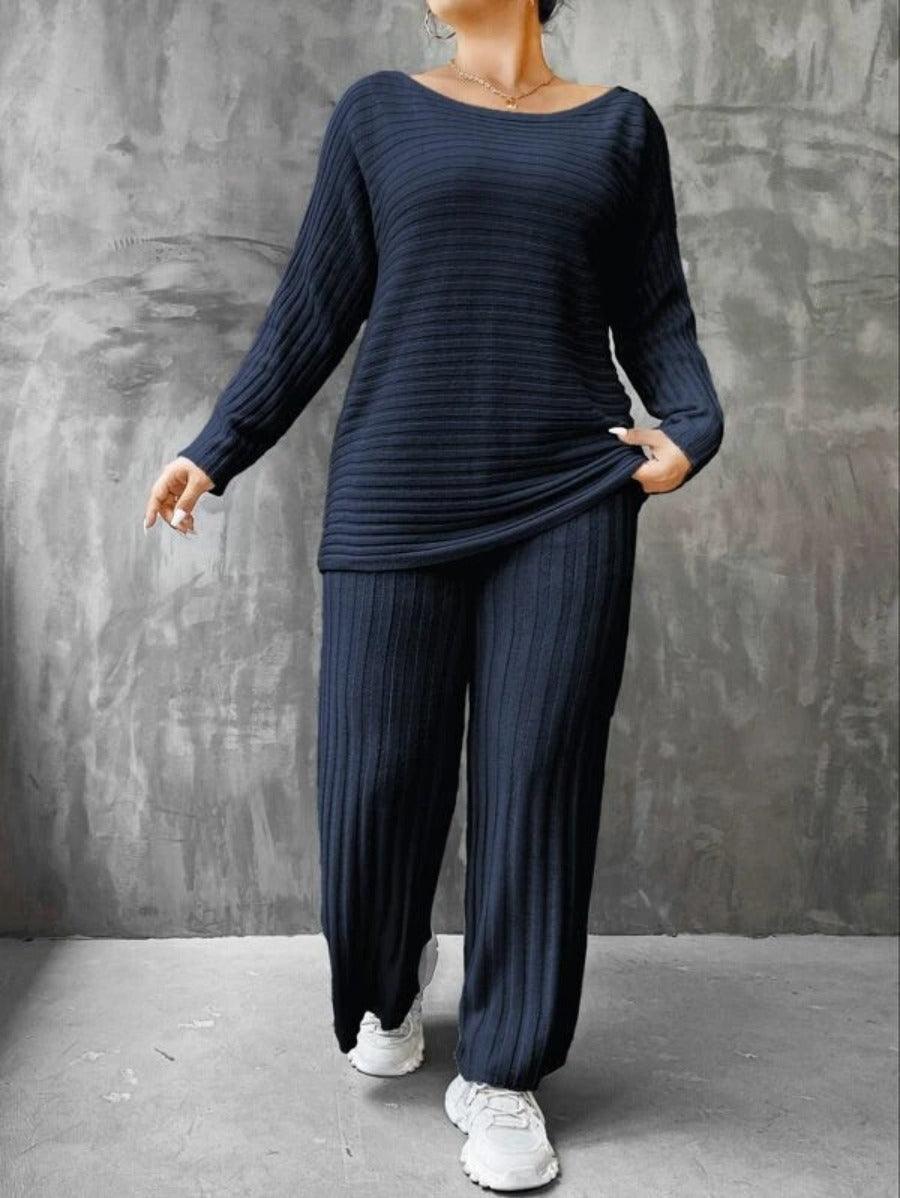 The rib-knit detail set adds dimension, complemented by the long sleeve sweater top and batwing sleeve design for consistent coverage and ease of movement. With slight stretch sweater fabric and everyday knitwear pullover construction, this set offers practical comfort and structured styling for mild seasons.