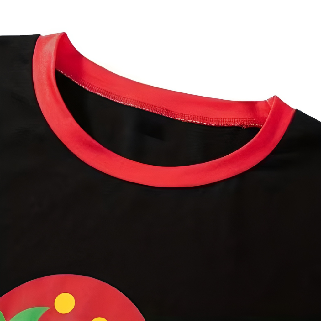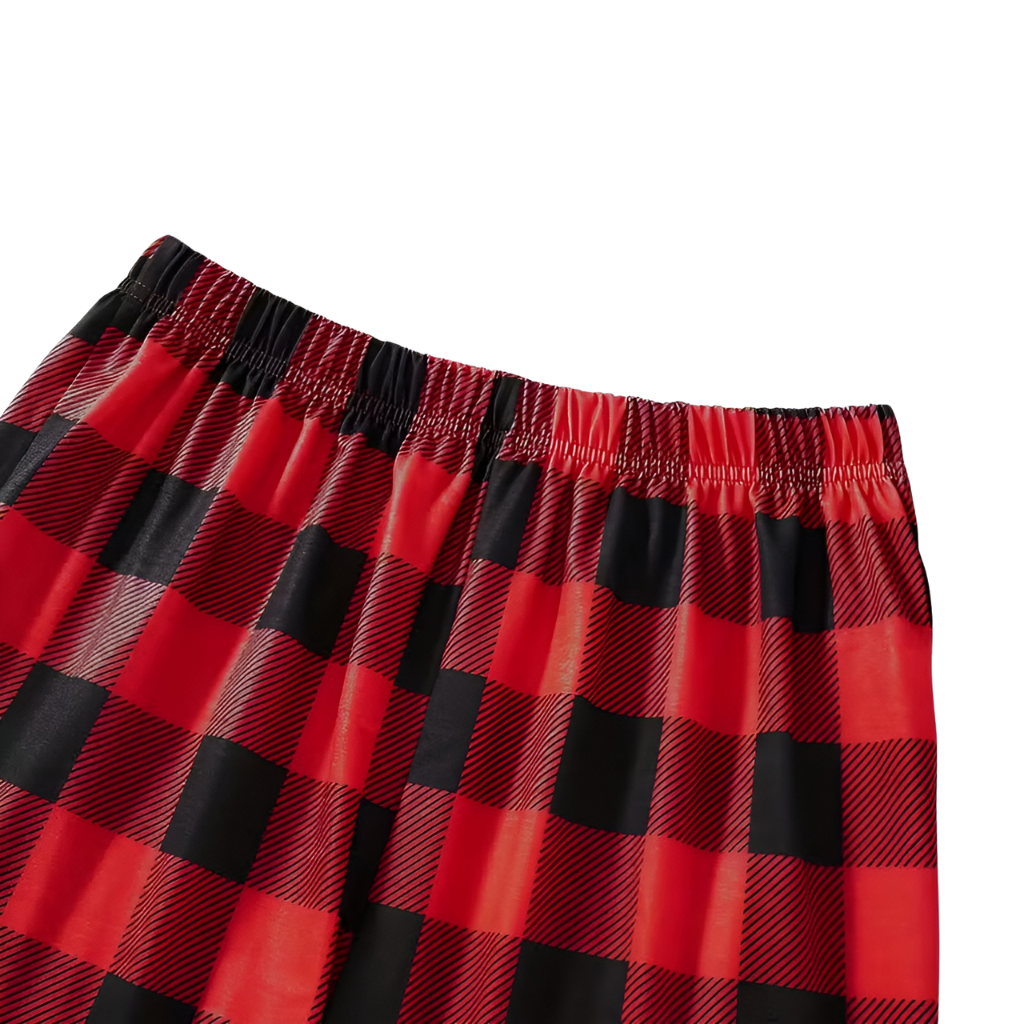 The Seasonal Plaid Pajamas use a classic grid layout in red and black. The pattern connects with the winter theme while staying suitable for indoor use year after year. The pants are cut with a profile, making them appropriate for extended wear.