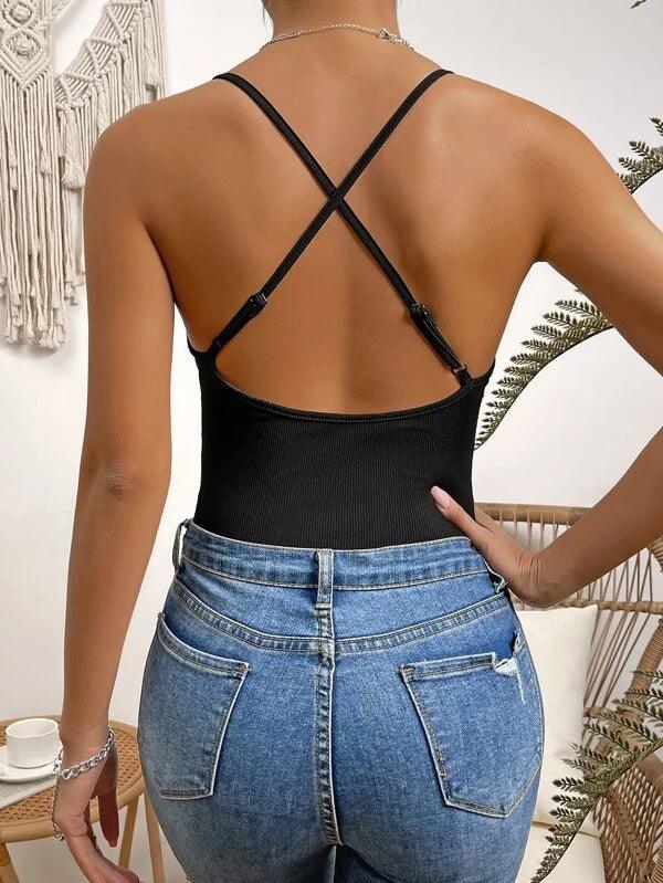 Black Sleeveless Crisscross Backless Bodysuit