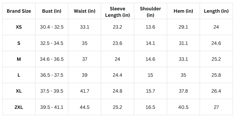Size chart (Inches):