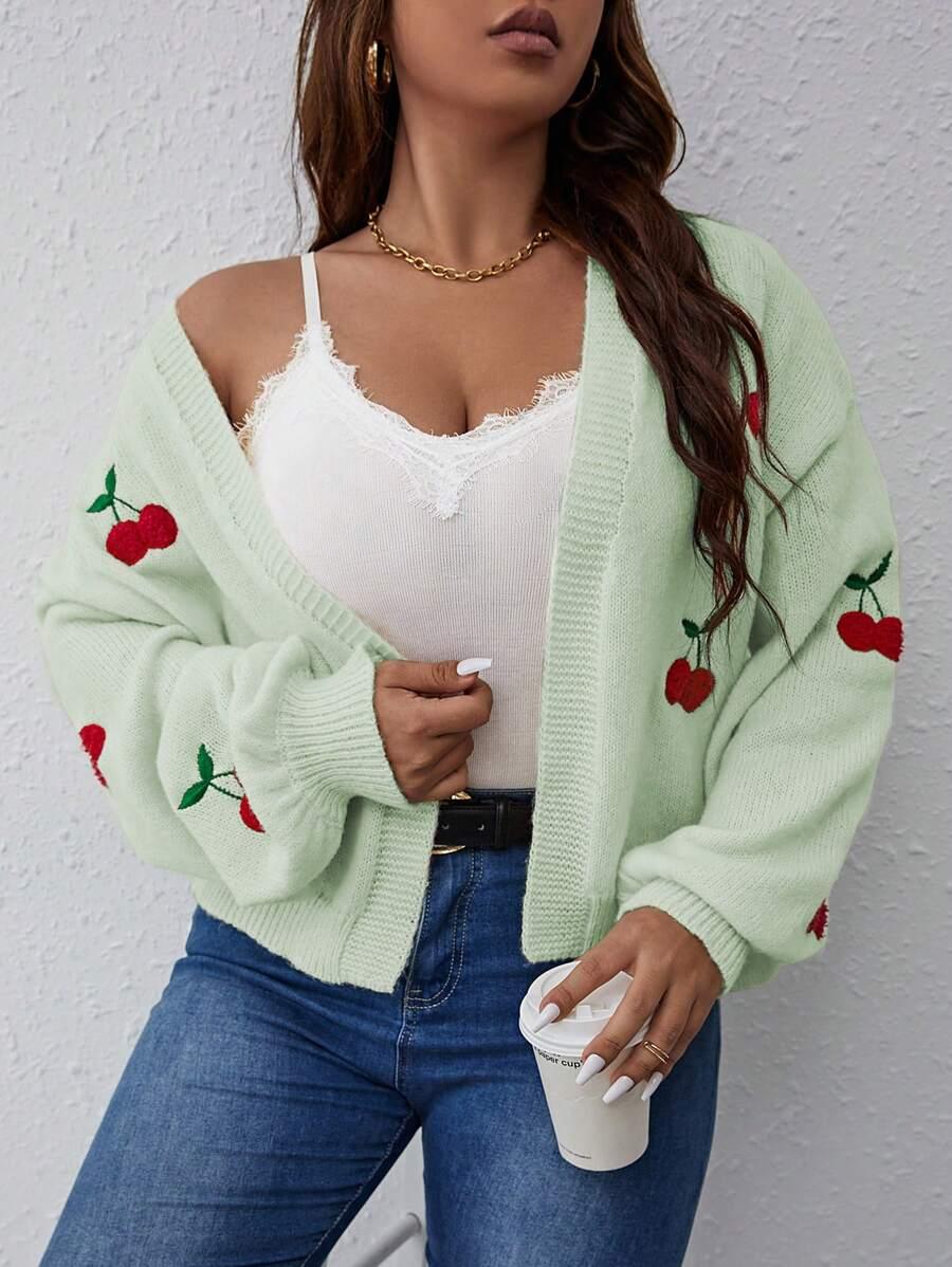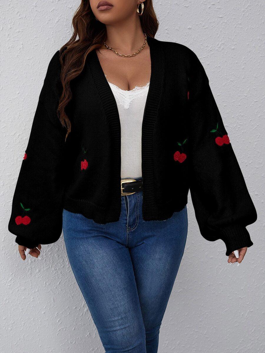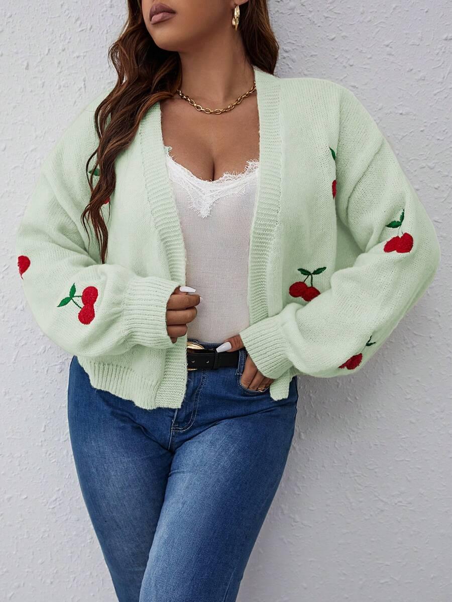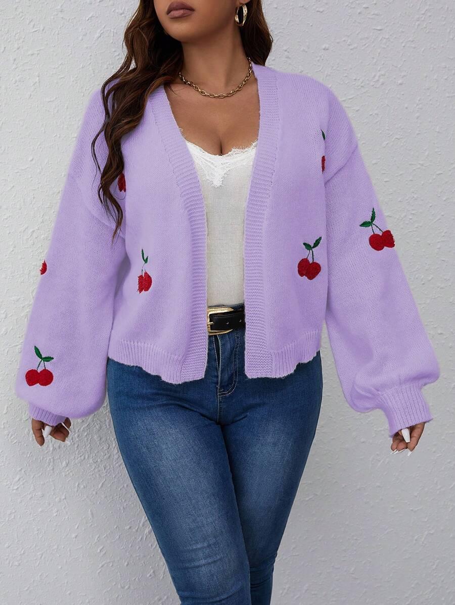 Step into a world of Cherry Pattern Balloon Sleeve Duster Cardigan whimsical style and effortless elegance with our Cherry Duster Cardigan. Designed for modern women who cozy layering without compromising on charm, this longline balloon sleeve cardigan brings a vibrant twist to your wardrobe with its adorable cherry embroidery and flowing silhouette.