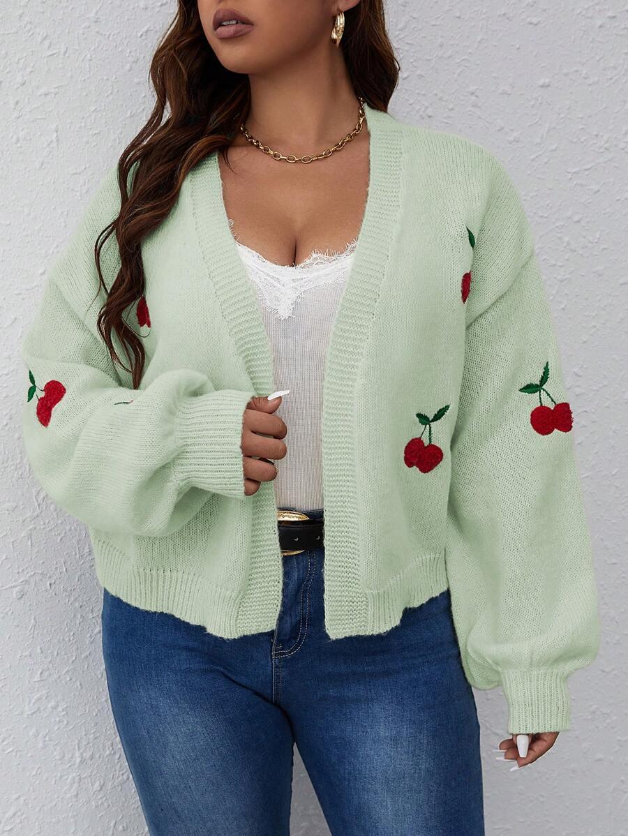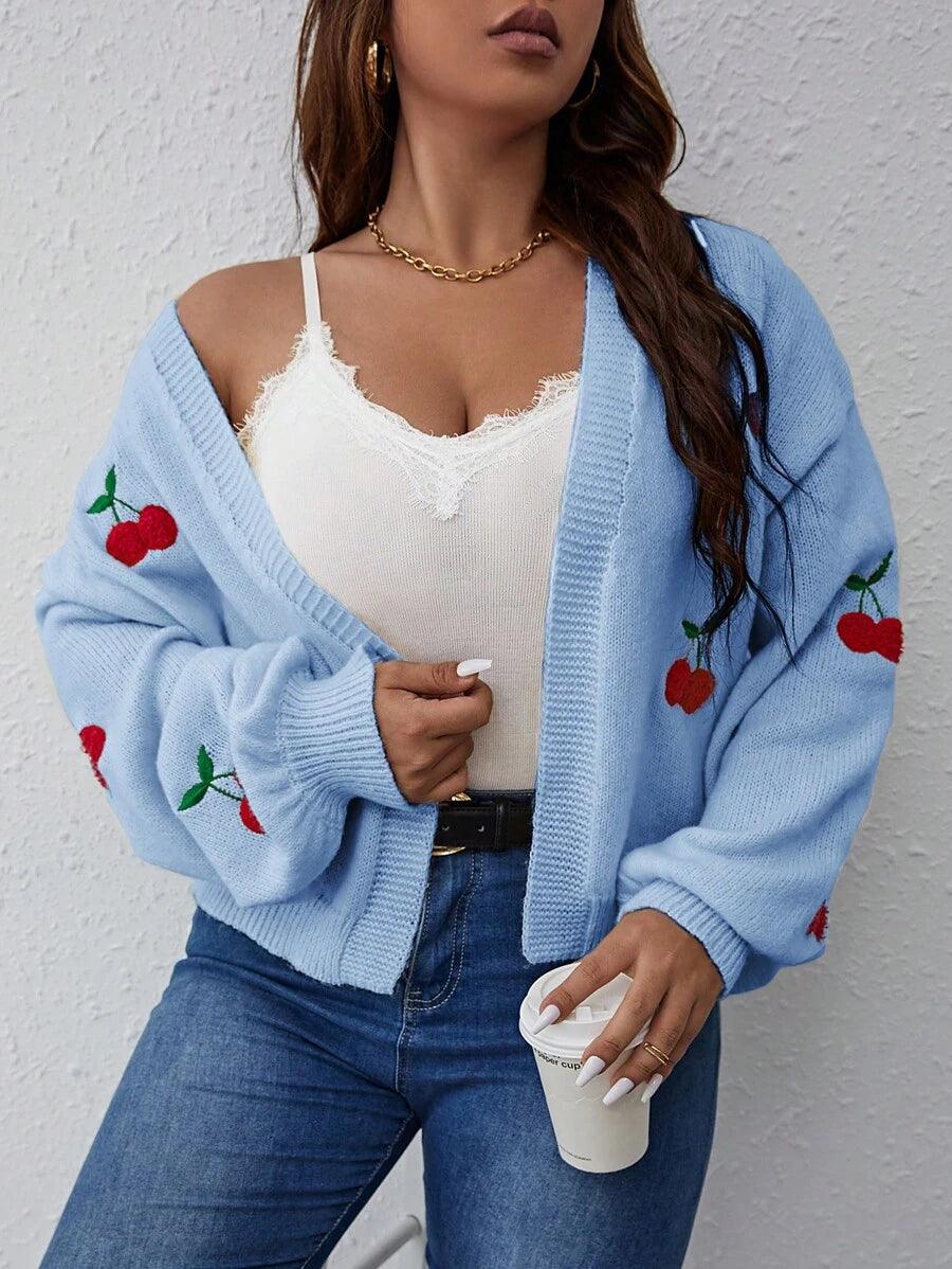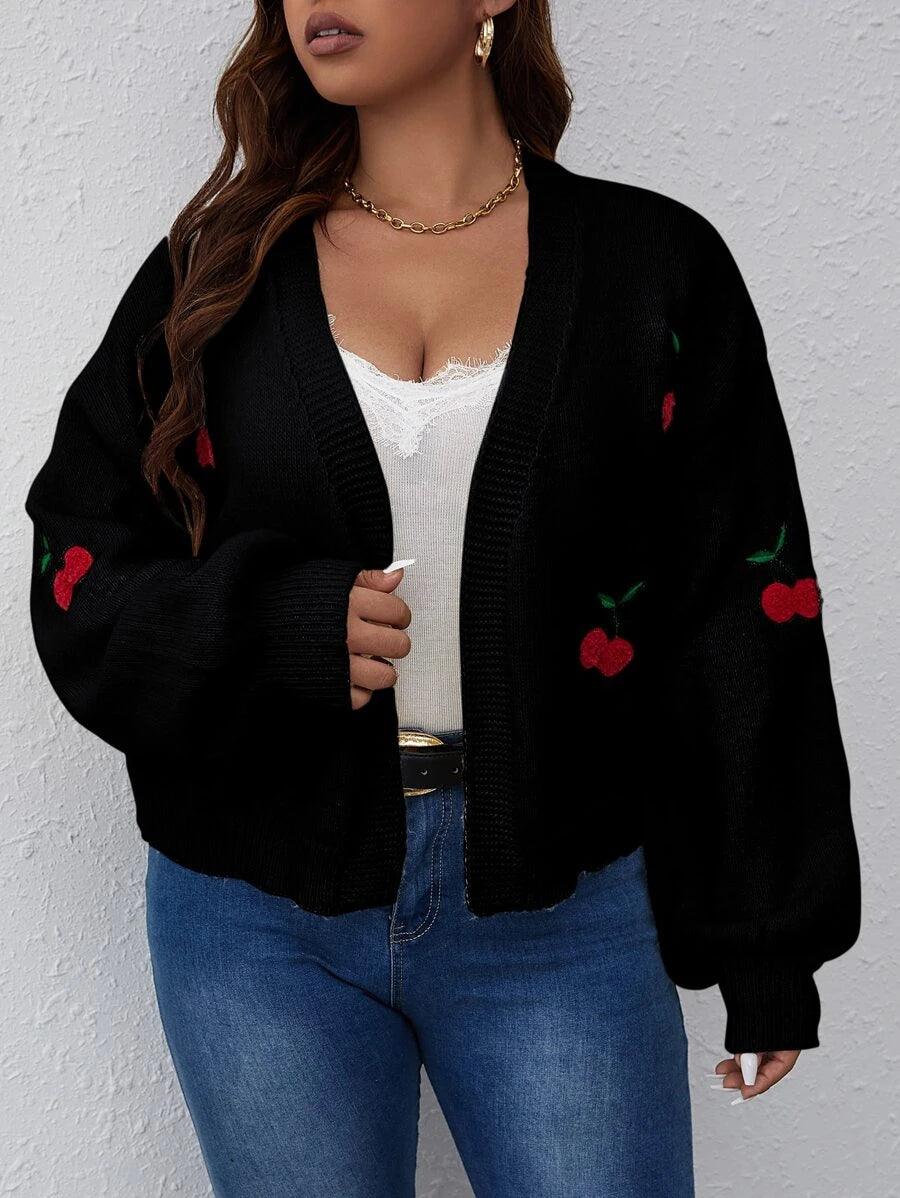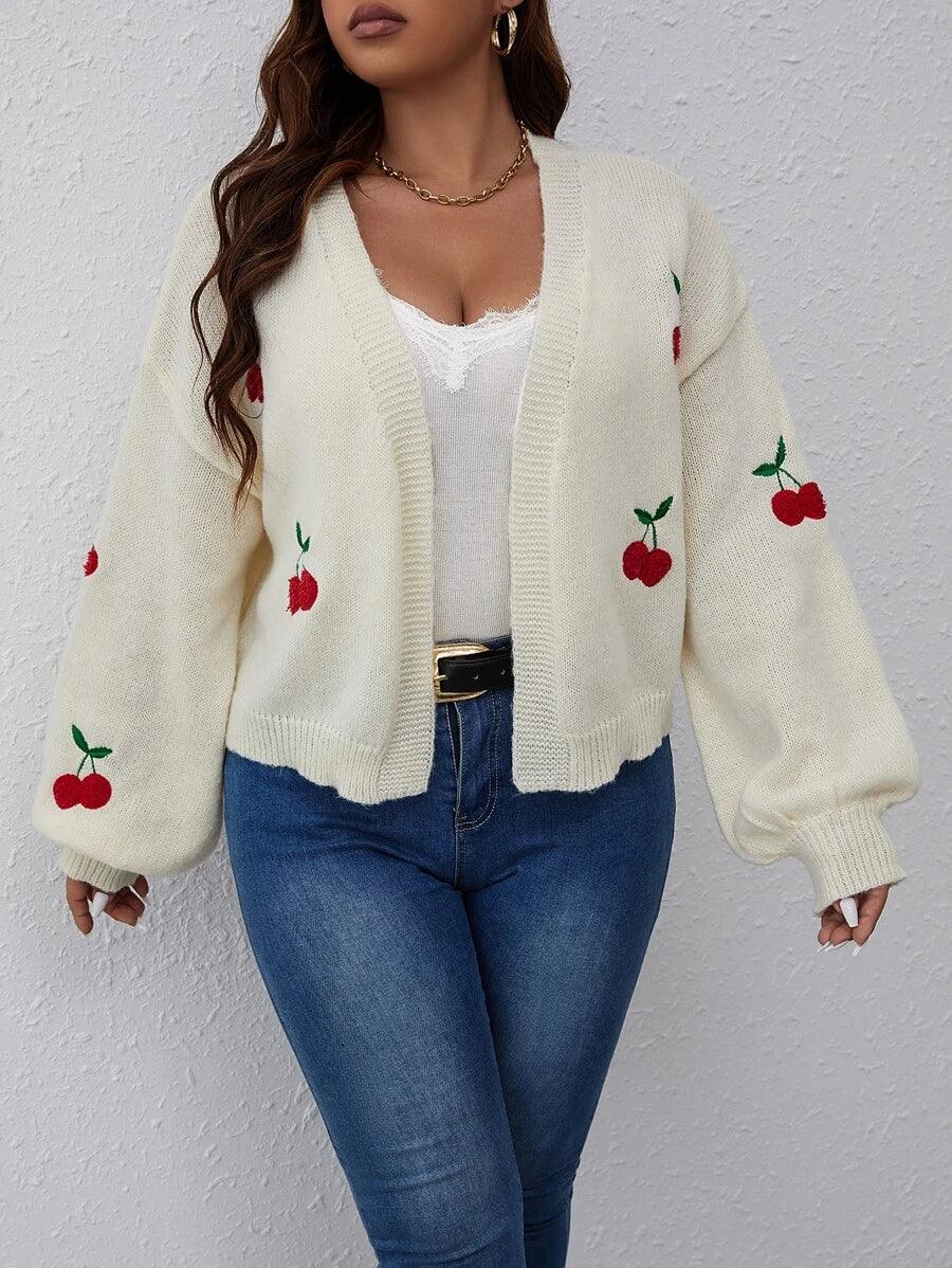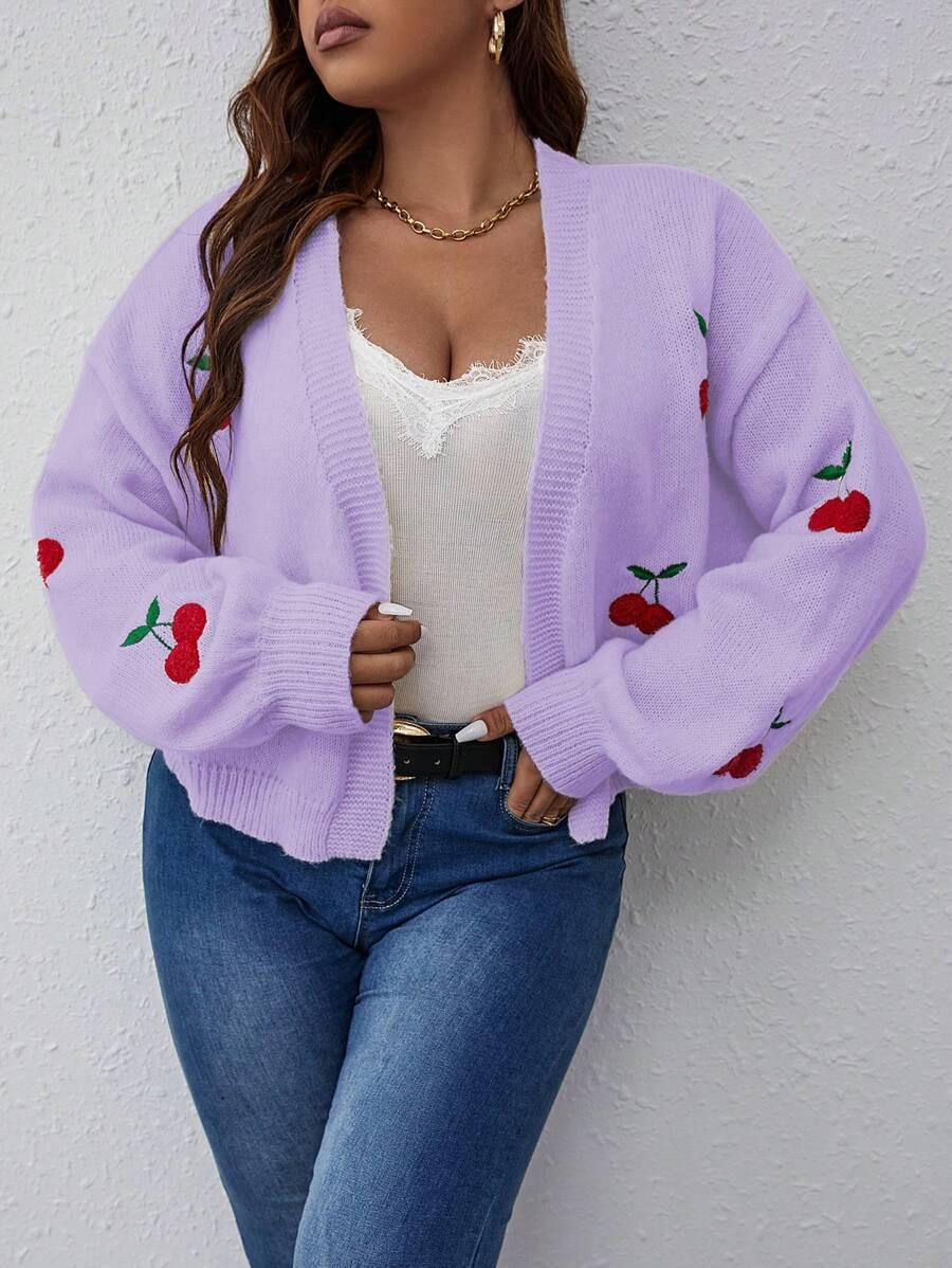 Step into a world of Cherry Pattern Balloon Sleeve Duster Cardigan whimsical style and effortless elegance with our Cherry Duster Cardigan. Designed for modern women who cozy layering without compromising on charm, this longline balloon sleeve cardigan brings a vibrant twist to your wardrobe with its adorable cherry embroidery and flowing silhouette.