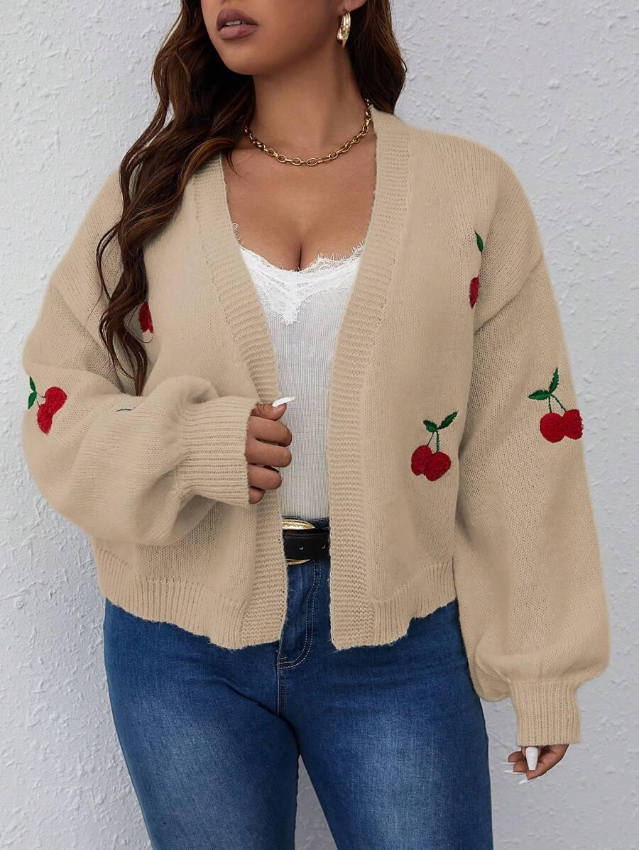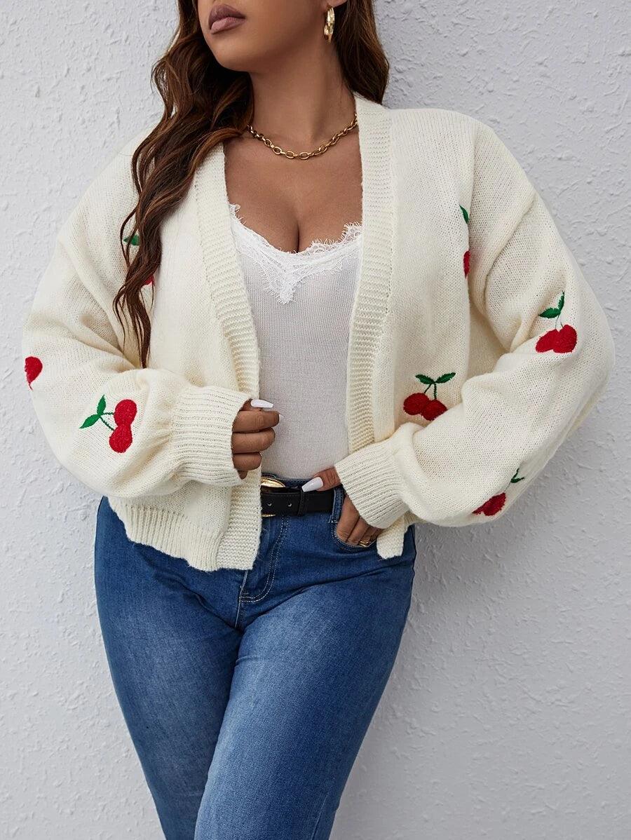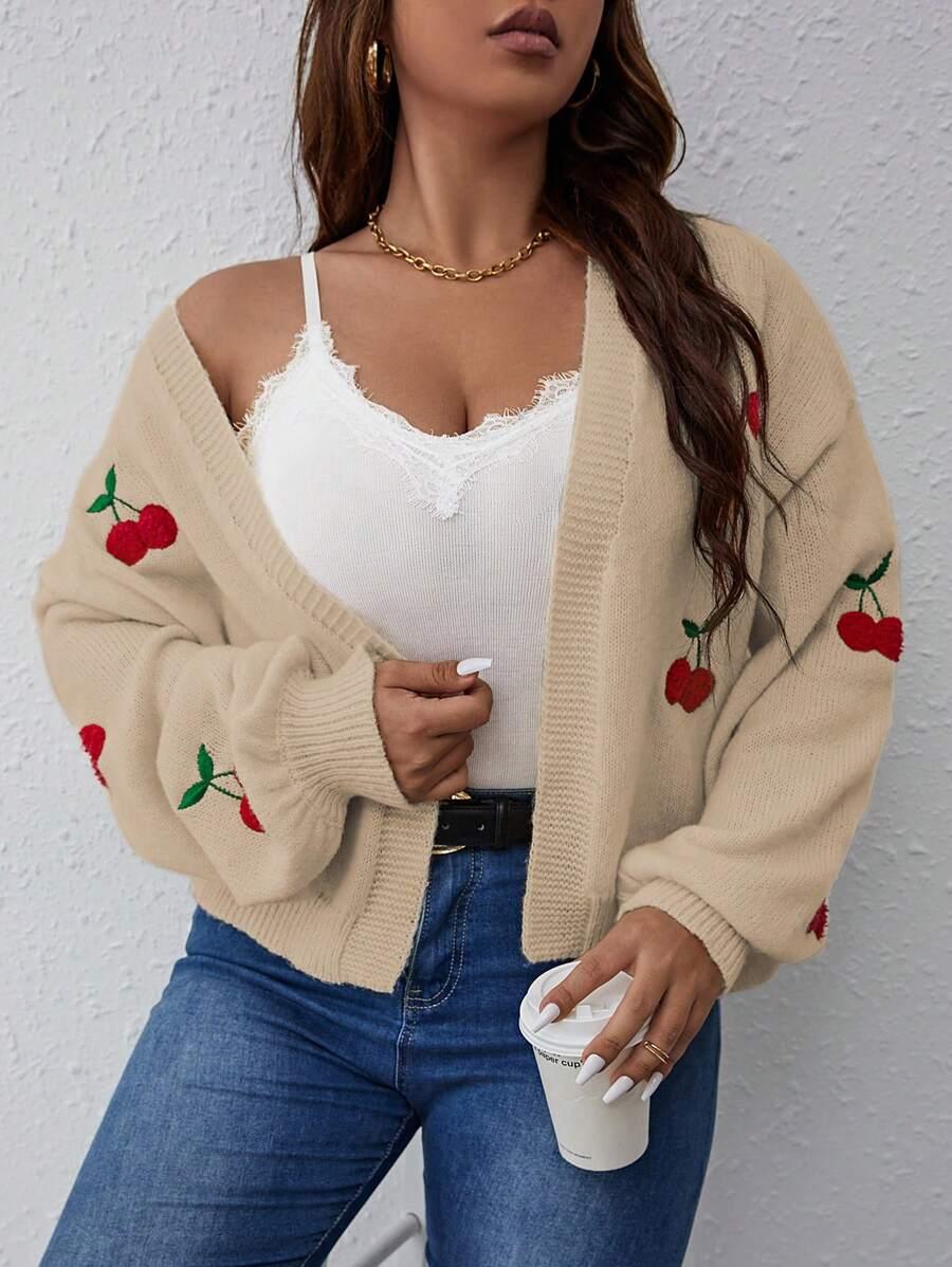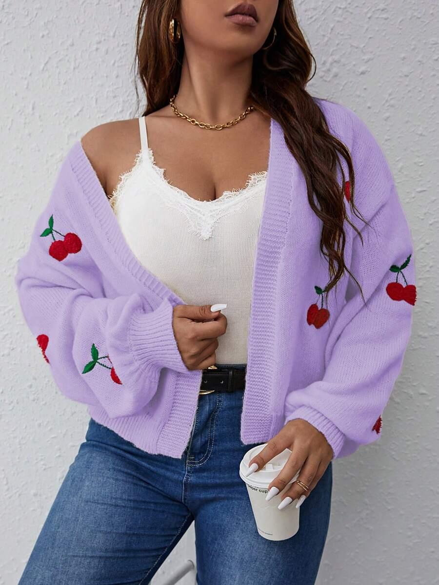 Step into a world of Cherry Pattern Balloon Sleeve Duster Cardigan whimsical style and effortless elegance with our Cherry Duster Cardigan. Designed for modern women who cozy layering without compromising on charm, this longline balloon sleeve cardigan brings a vibrant twist to your wardrobe with its adorable cherry embroidery and flowing silhouette.