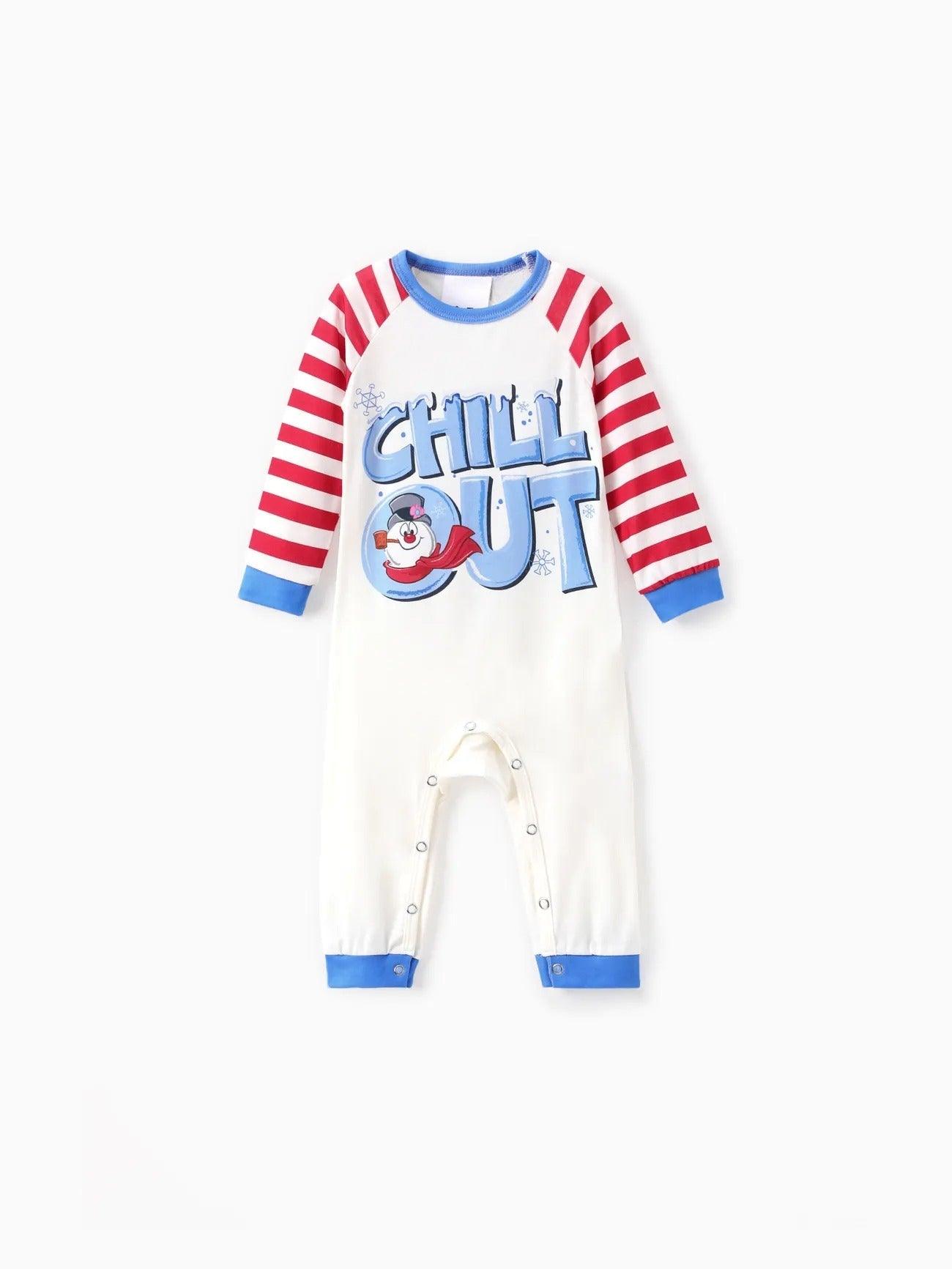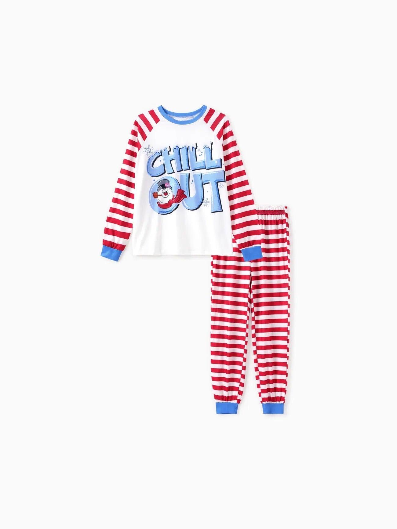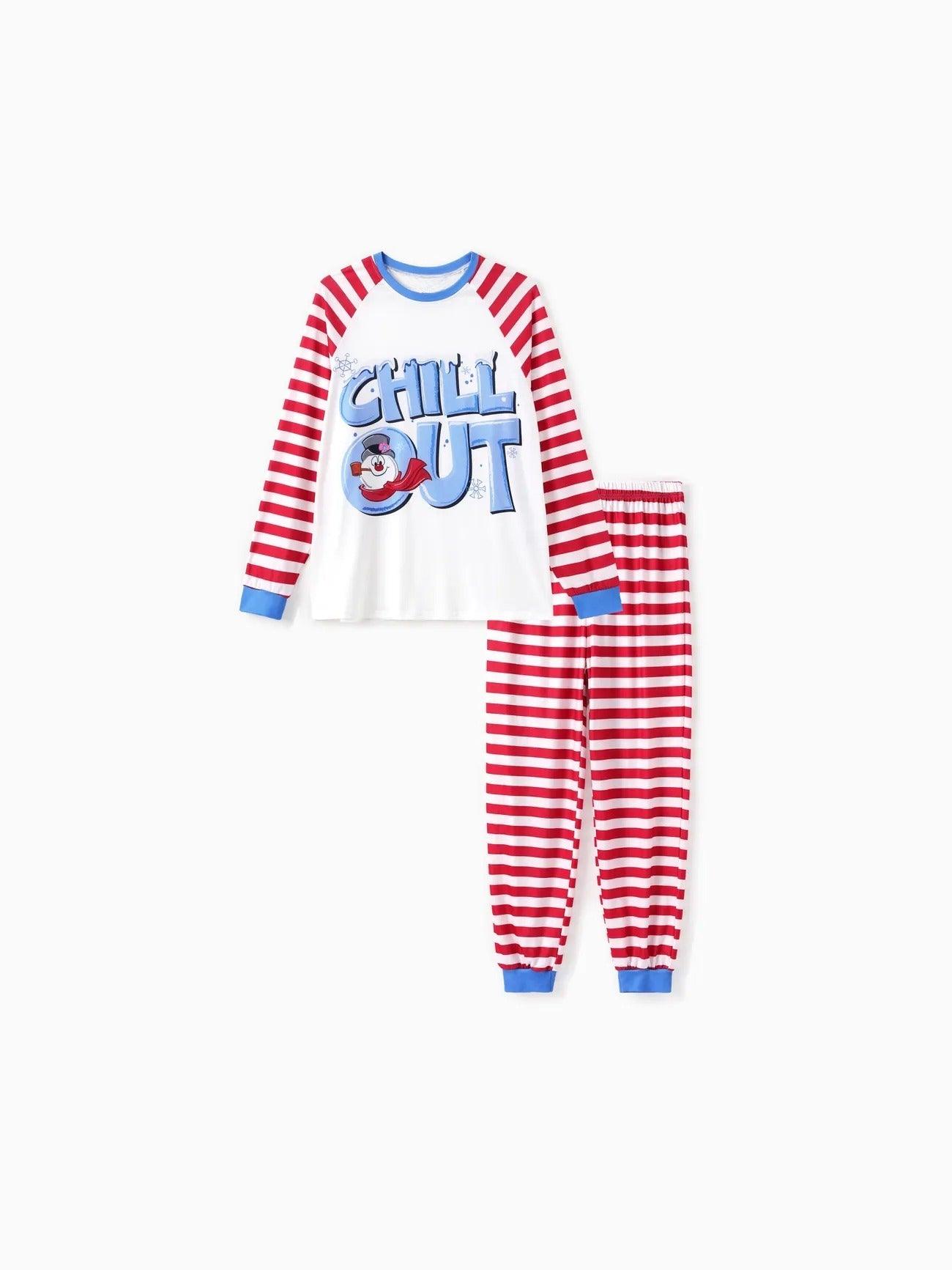 The chill printed family pajama set brings a light mood to group time. Each piece features soft fabric and clean print style. The snowman graphic and striped pants build a themed outfit. This set comes in adult and kid sizes. It makes cold nights more pleasant. Whether sitting for photos or resting after dinner, it adds comfort. The chill printed family pajama is built for wear during holidays or everyday time indoors.