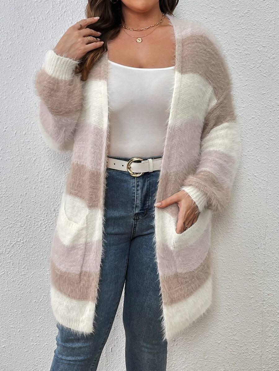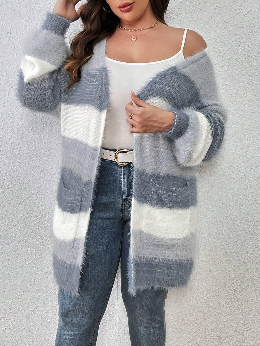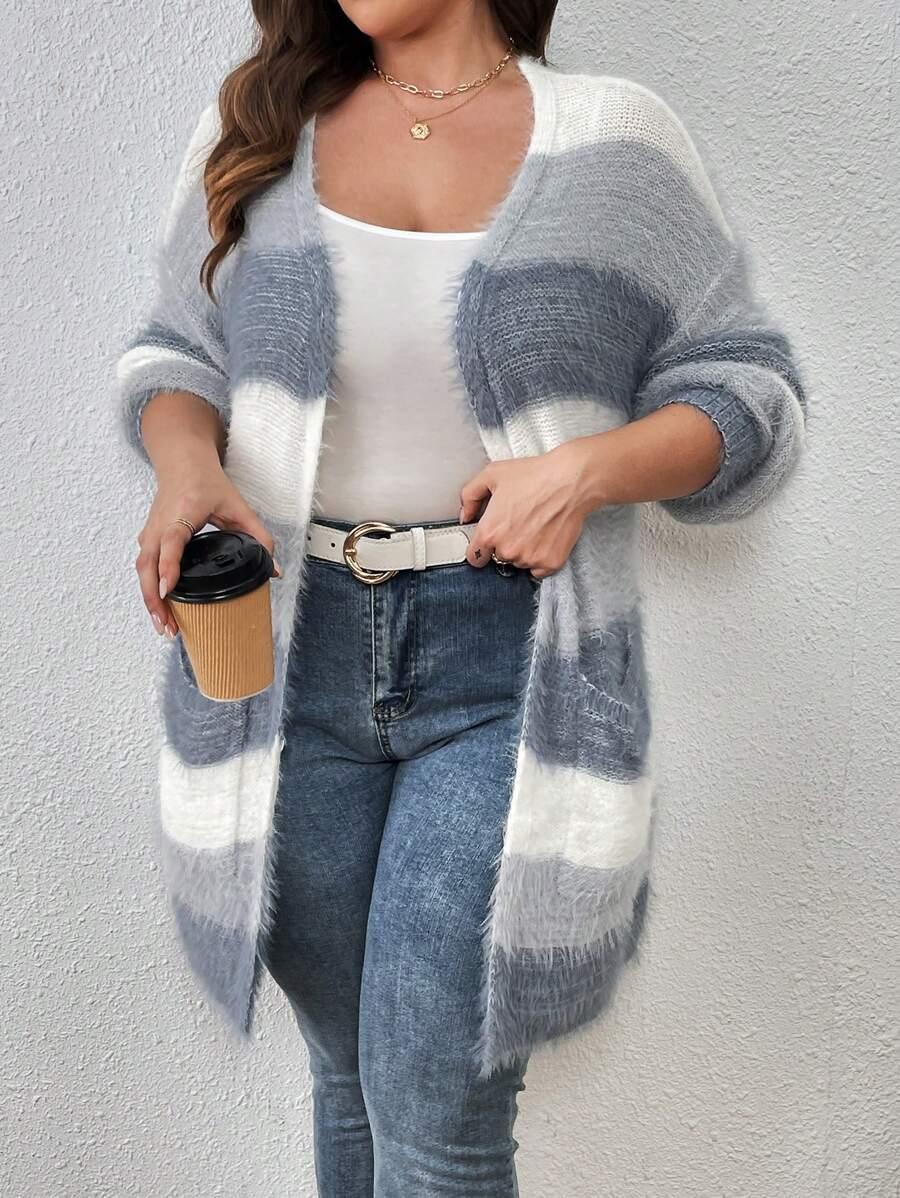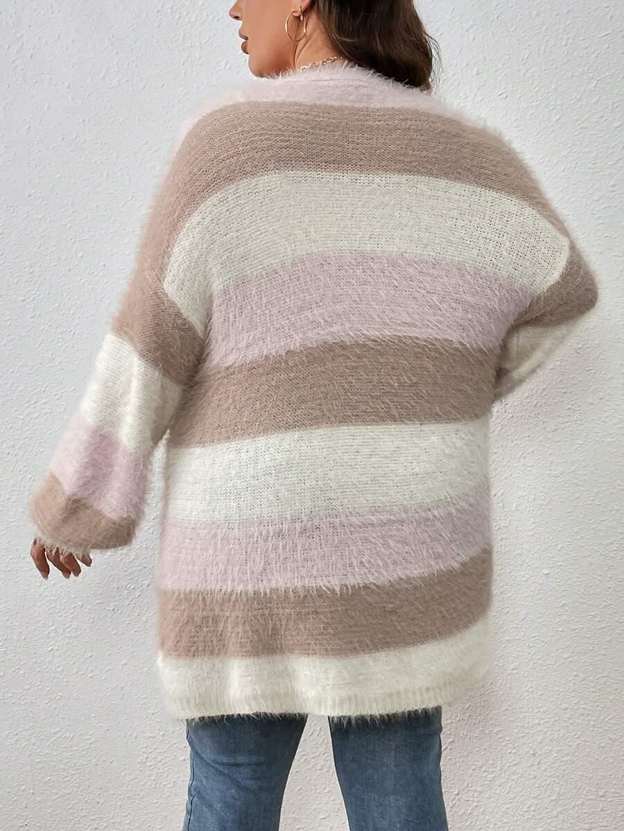 The Colorblock Fluffy Knit Cardigan works as an everyday piece during seasonal transitions. Its shape and color palette offer a versatile option for casual layering.