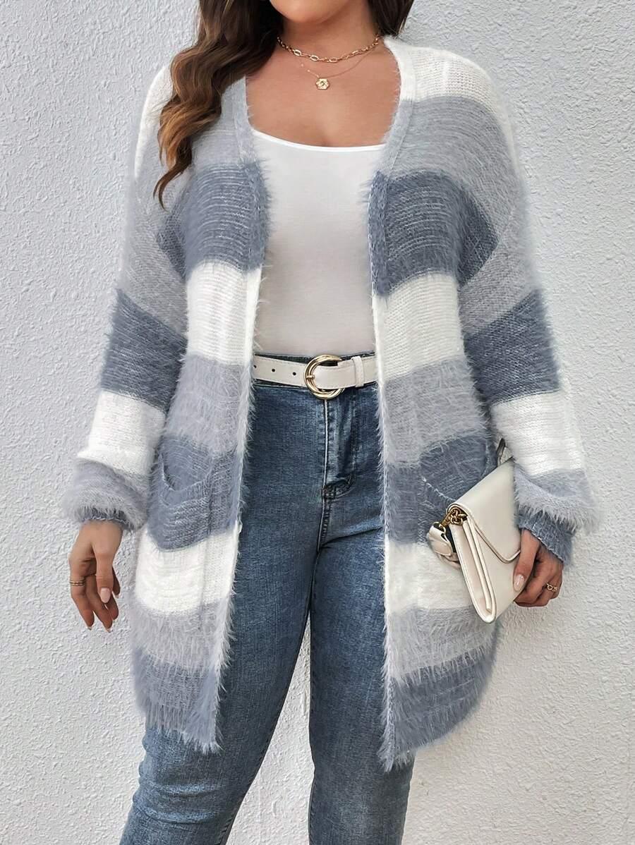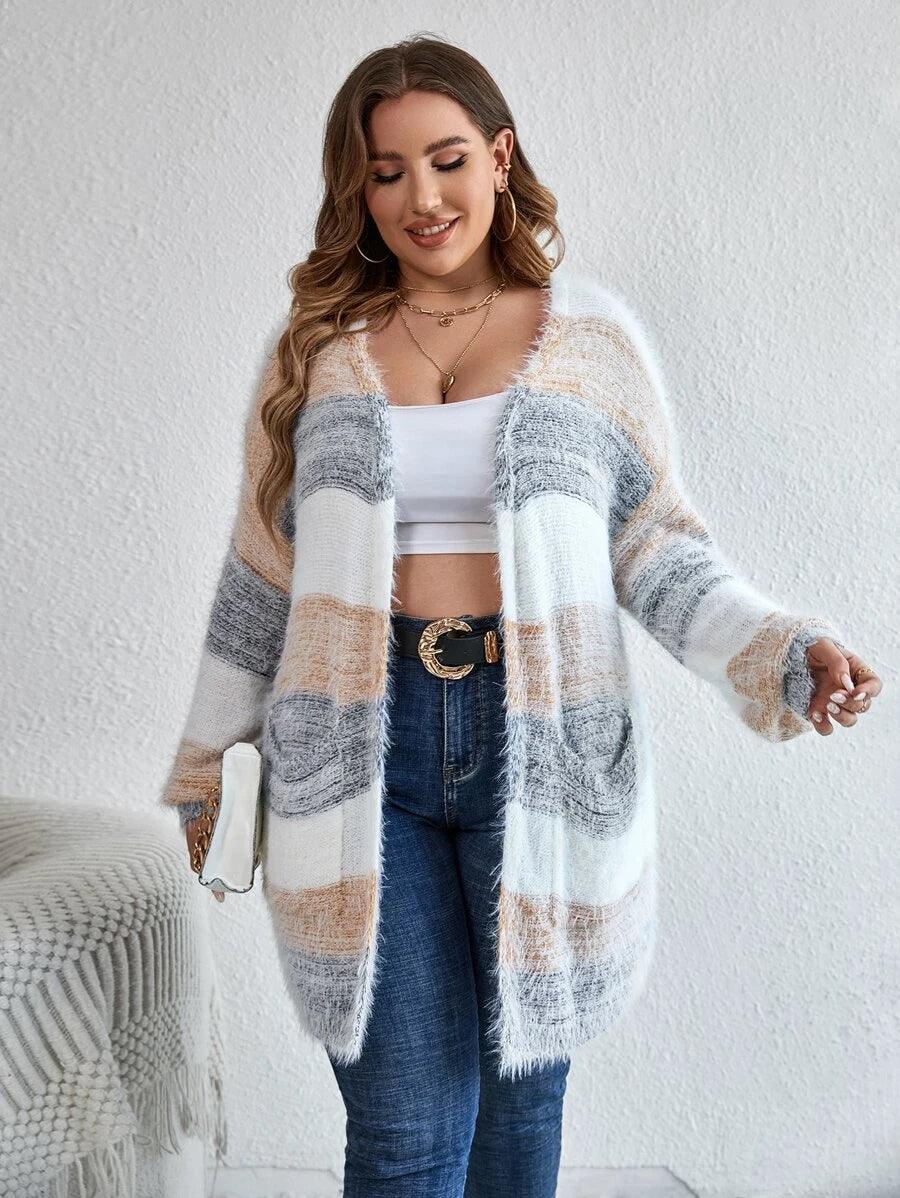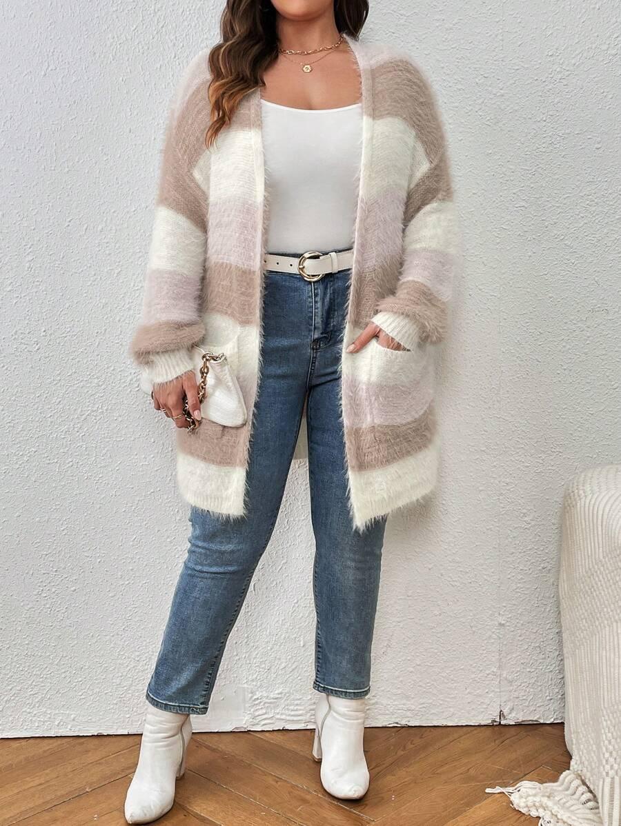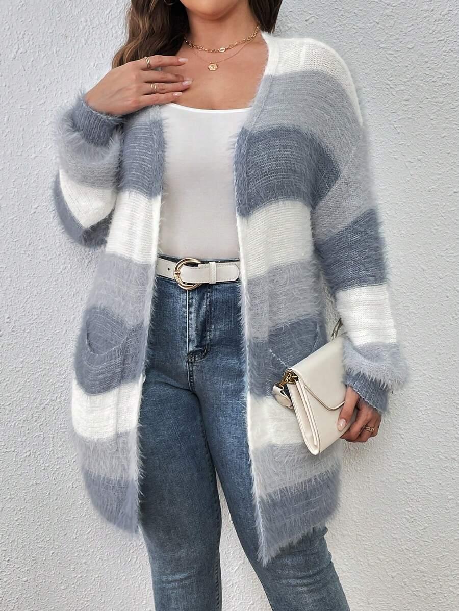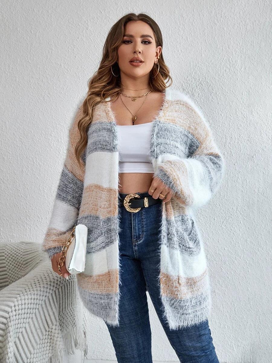 The Colorblock Fluffy Knit Cardigan works as an everyday piece during seasonal transitions. Its shape and color palette offer a versatile option for casual layering.