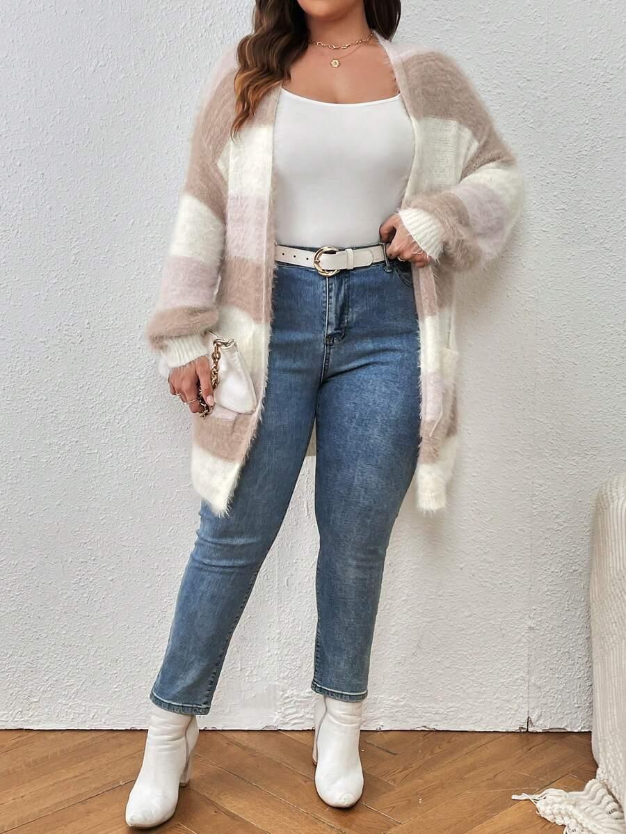 Colorblock Fluffy Knit Cardigan Pair with long trousers or structured skirts for a refined yet simple outfit. Add a thin underlayer for texture contrast and style depth.