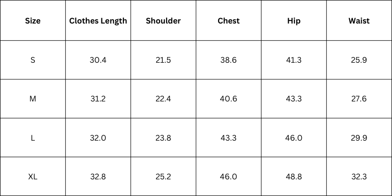 Size Chart (inches):