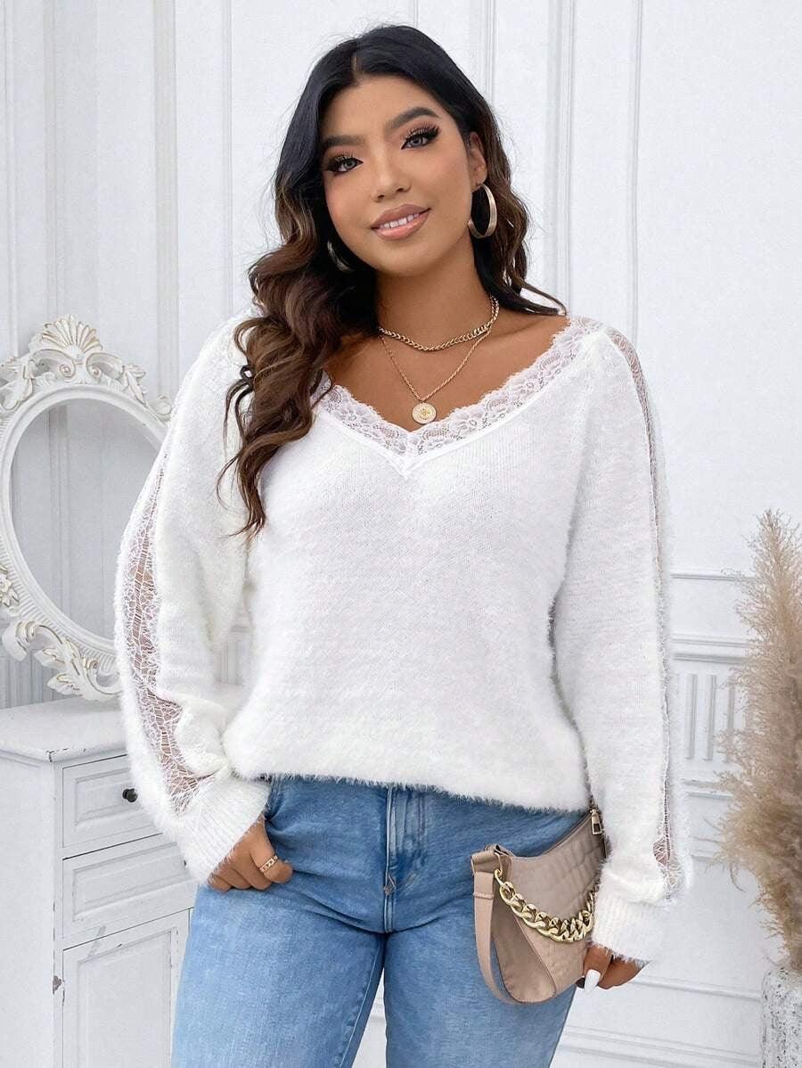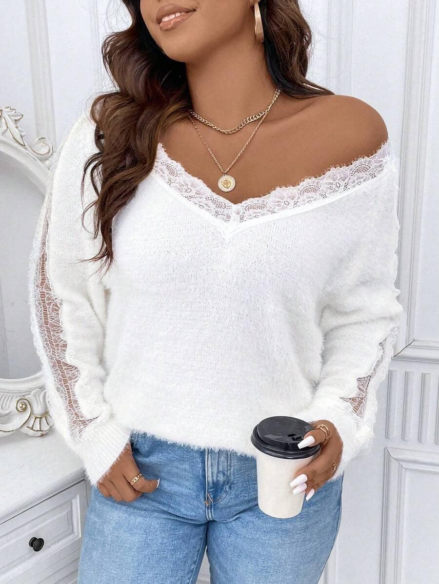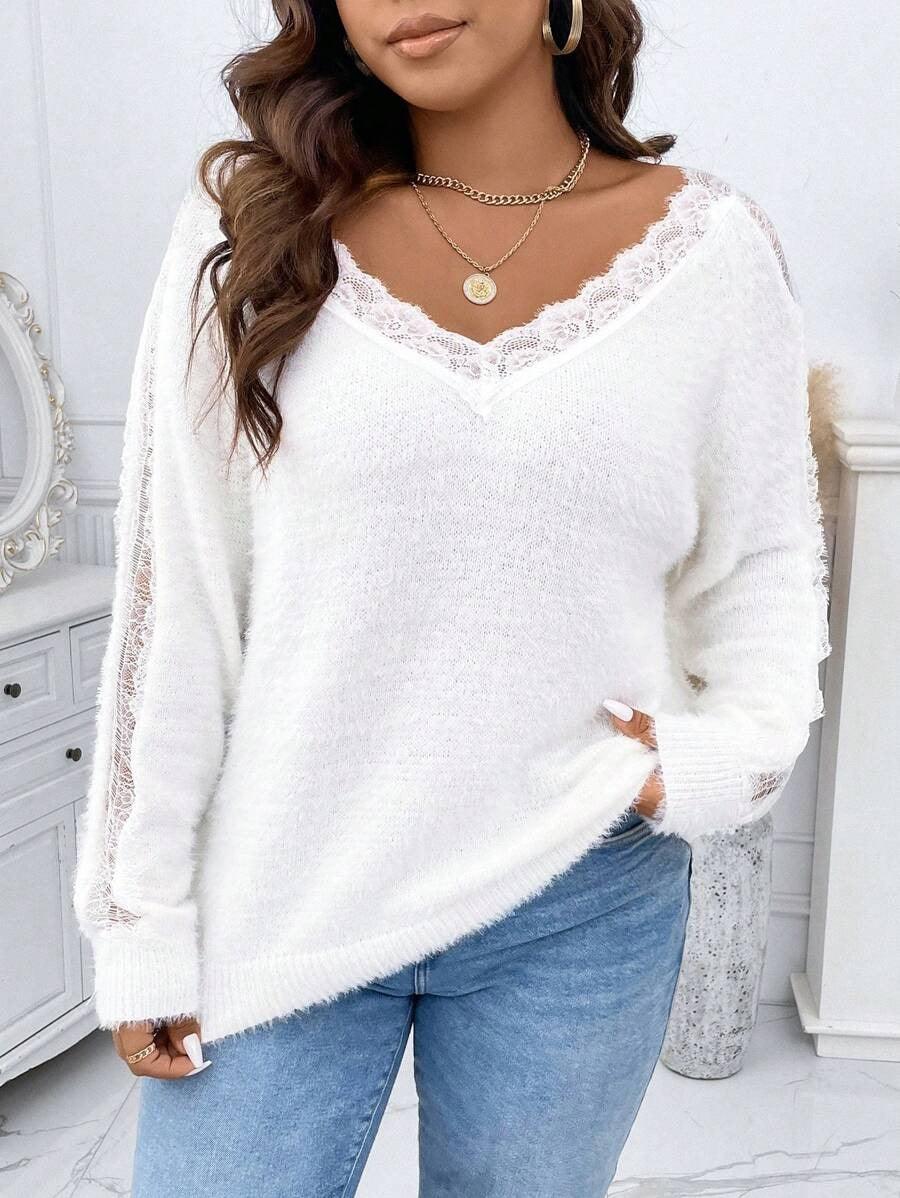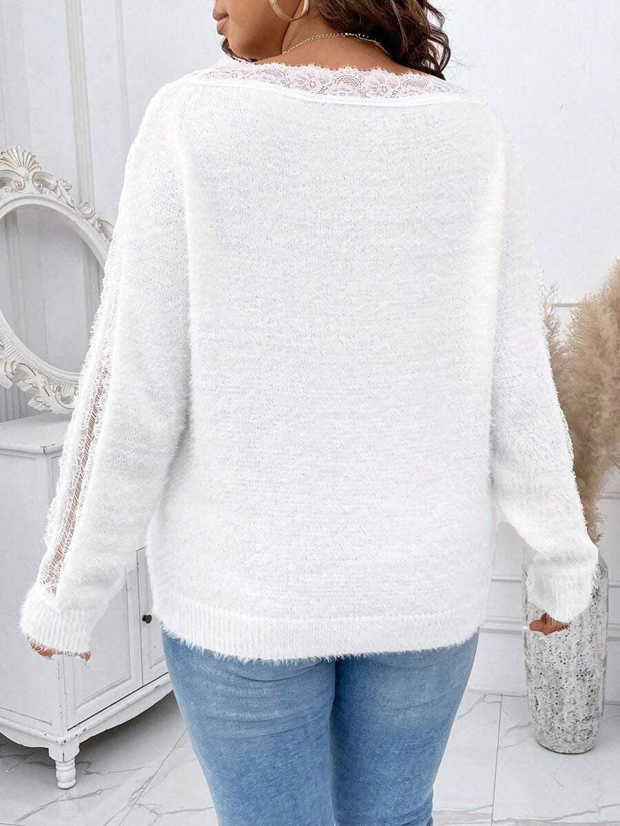 The lace knit sweater brings together softness and visual texture. Its acrylic build offers lasting structure. The lace accent adds character to the neckline. The drop shoulder and long sleeves help shape a loose outline. With fluffy texture and lace trim the pullover blends casual use with detail. Choose the lace knit sweater for comfort when daily wear meets light style needs.