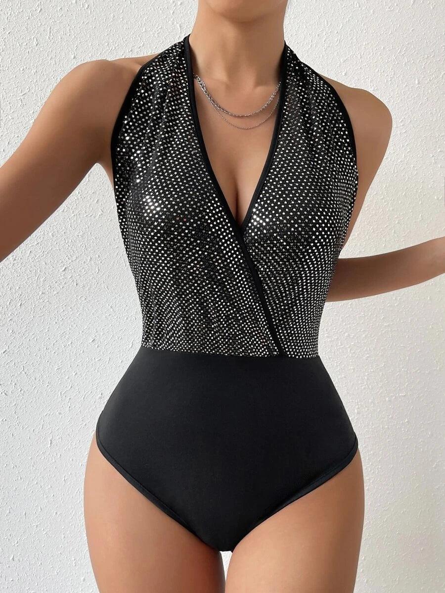 - Details: Backless, Contrast Sequin, Tie Back