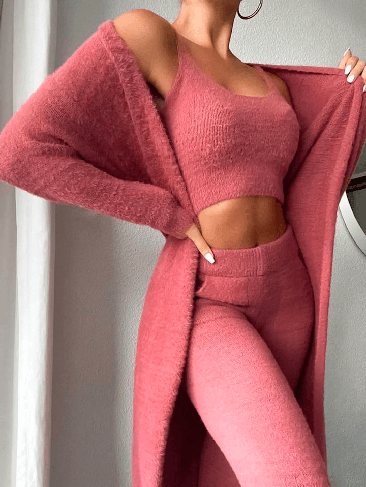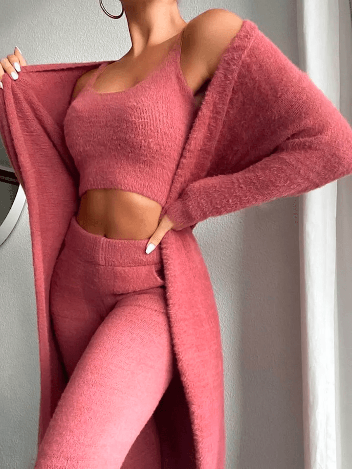 3-Piece Knitwear Set: Includes a cropped inner tank, skinny pants, and a long outer coat