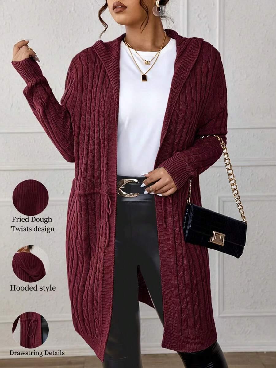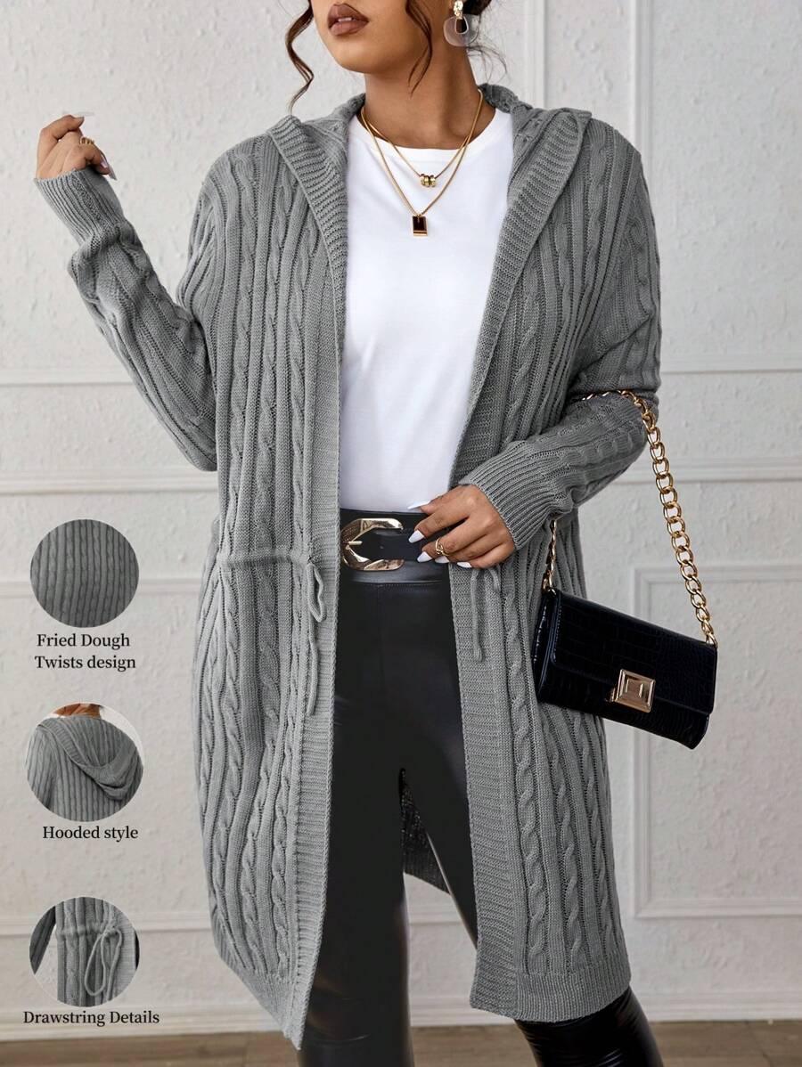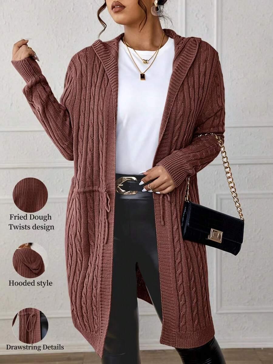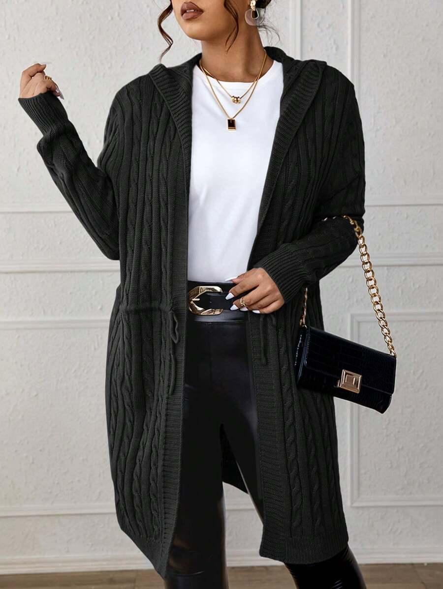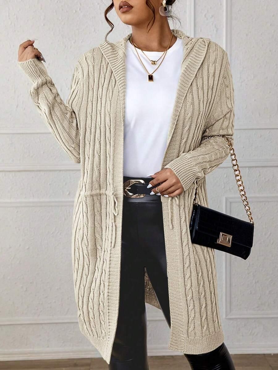 The drawstring cable knit cardigan gives structure and softness in one look. With a cable knit sweater design and hooded knit cardigan style this piece is functional year-round. From long sleeve cardigan shape to acrylic knit cardigan fabric the details support easy movement. Whether worn during outdoor strolls or indoor days it becomes a flexible wardrobe staple. Choose this regular fit jacket as your go-to during seasonal shifts. Pair it with everyday basics or style it with boots and scarves. Make comfort simple without losing clean structure.