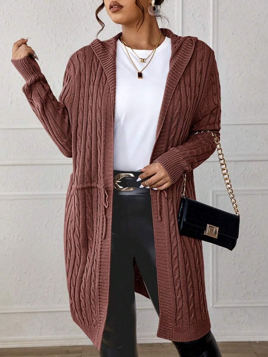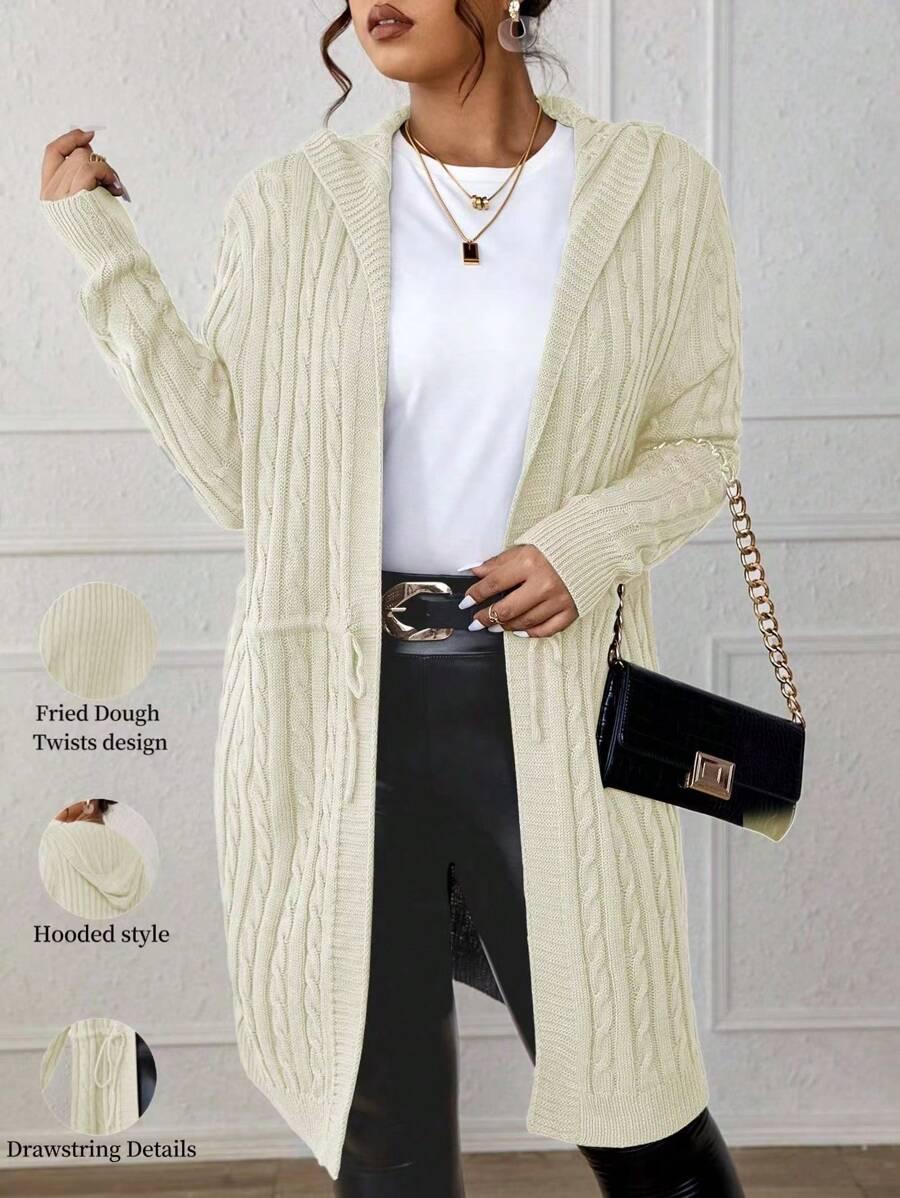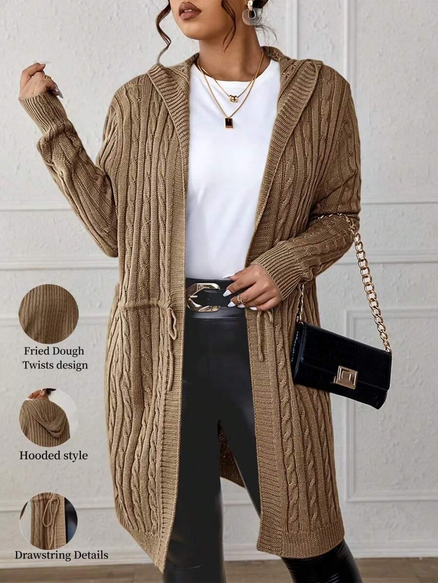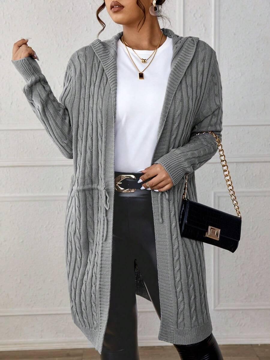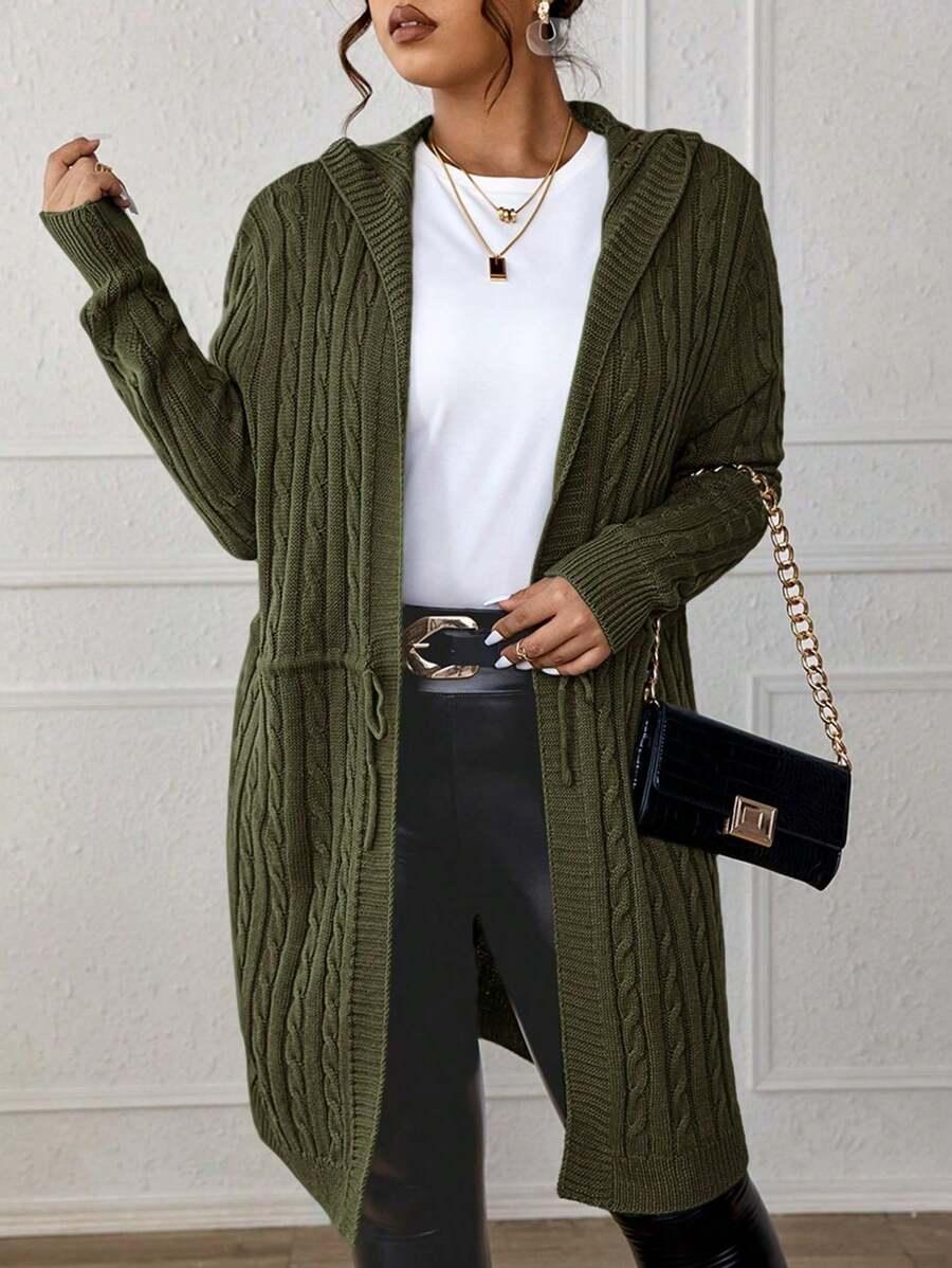 The drawstring cable knit cardigan gives structure and softness in one look. With a cable knit sweater design and hooded knit cardigan style this piece is functional year-round. From long sleeve cardigan shape to acrylic knit cardigan fabric the details support easy movement. Whether worn during outdoor strolls or indoor days it becomes a flexible wardrobe staple. Choose this regular fit jacket as your go-to during seasonal shifts. Pair it with everyday basics or style it with boots and scarves. Make comfort simple without losing clean structure.
