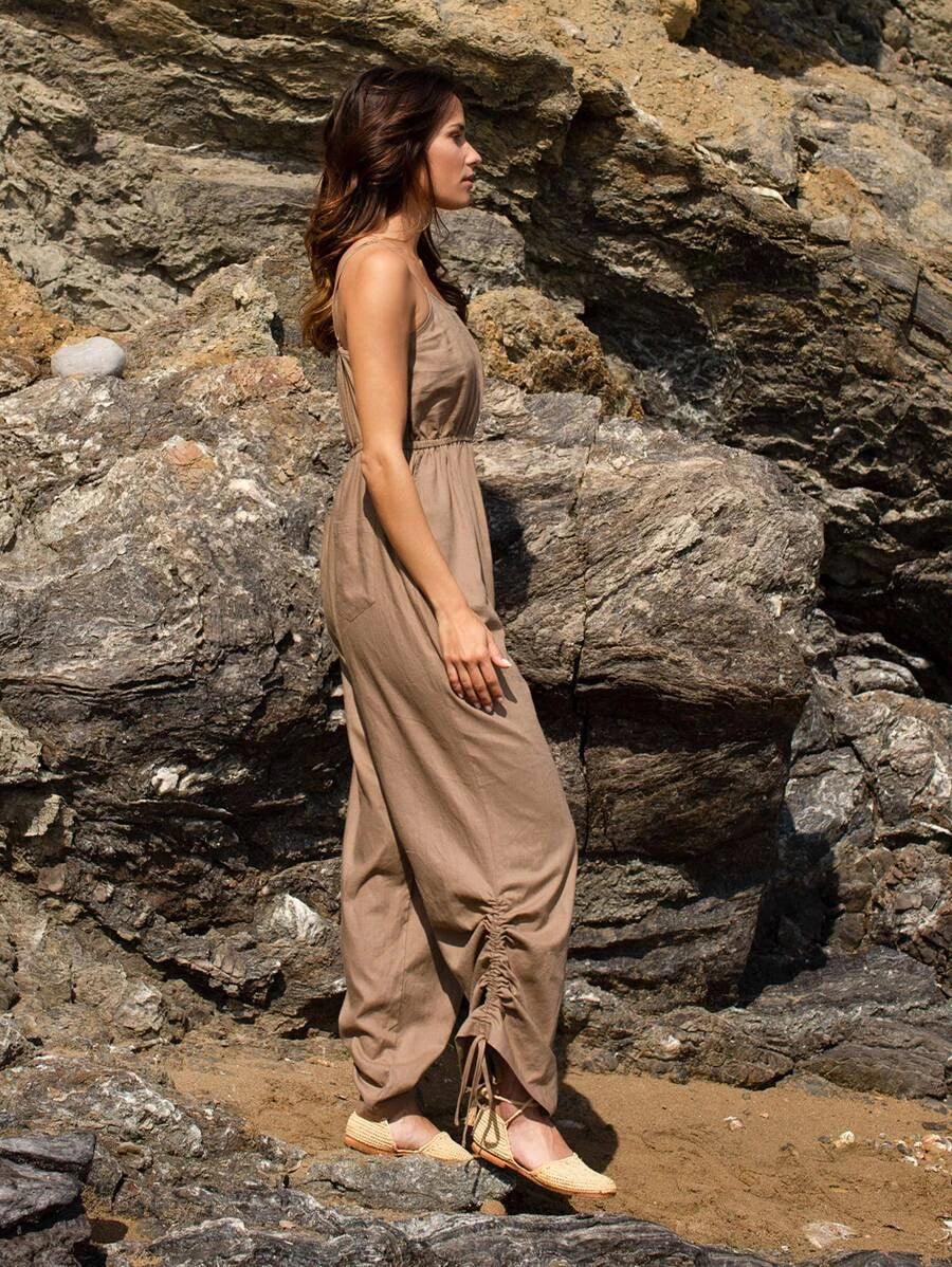 This Drawstring Detail Cami Jumpsuit is designed to provide you with timeless style and versatility. Crafted from lightweight, airy fabric, this jumpsuit features a drawstring detail cami and loose-fit pant silhouette with a brown hue, giving you the perfect summer look. Ideal for day-to-night wear, the adjustable drawstring detail allows for a custom comfortable fit and all-day wearability.