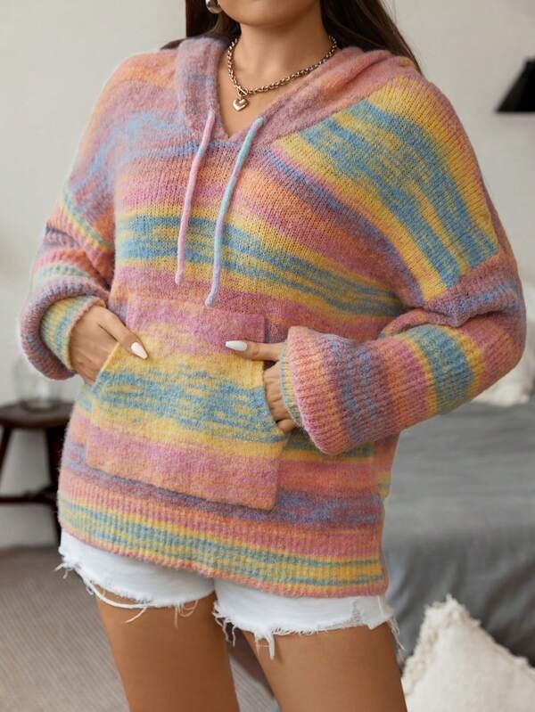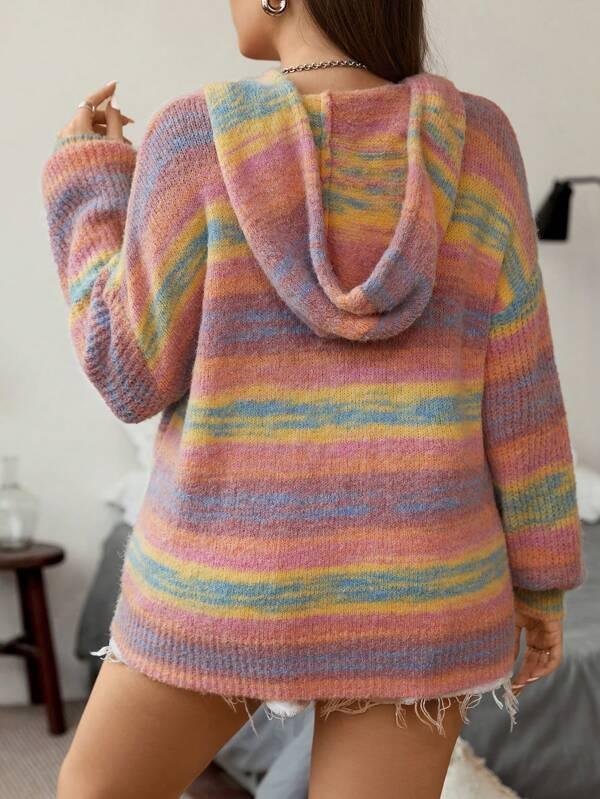 The drawstring hooded sweater brings a calm style for regular wear. It features soft knit fabric and stretch fabric knitwear for flexibility. The striped pullover design offers a fresh casual look. With a drop shoulder sweater shape and a neckline this pullover fits many daily plans. This drawstring hooded sweater pairs with casual bottoms like jeans or skirts. Its knitwear sweater pullover texture stays steady. Whether for outdoor walks or indoor days this piece gives ease through a clean structure.