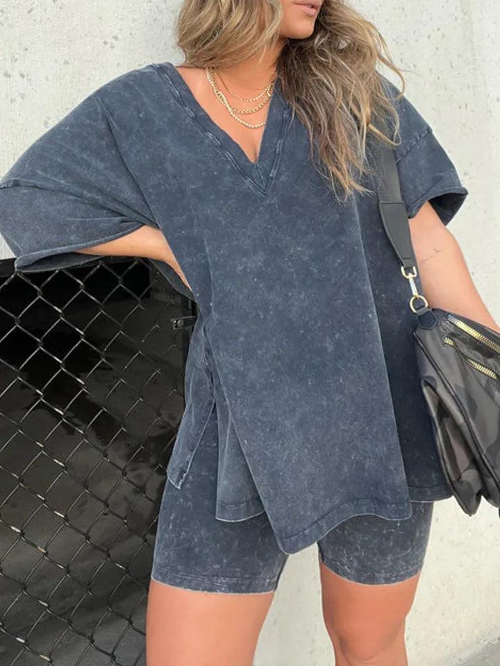 Upgrade your warm-weather wardrobe with the Effortless Stylish Washed Set, a two-piece lounge essential that blends function, comfort, and modern streetwear style. This relaxed outfit includes a textured oversized boyfriend tee and elastic-waist biker shorts, offering a flattering and flexible fit. Whether you're out for errands, traveling, or simply relaxing, this matching lounge outfit ensures you stay cool, comfy, and stylish.