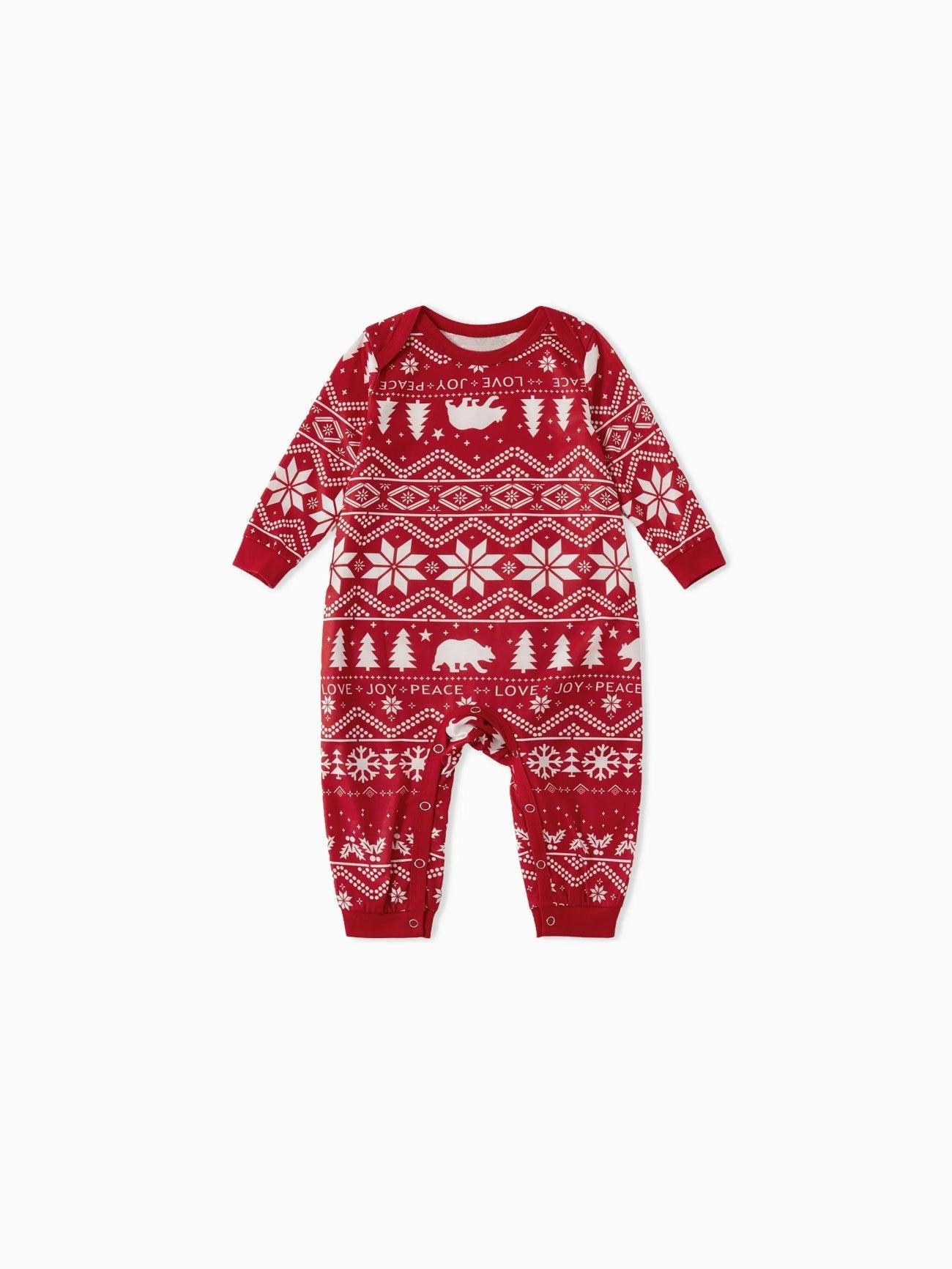 Each piece in the set includes a long-sleeve top and matching full-length bottoms in red pattern. The arrangement of snowflakes and seasonal motifs within the design reflects familiar seasonal visuals. The geometric layout contributes to a unified appearance that photographs well and complements indoor backdrops.