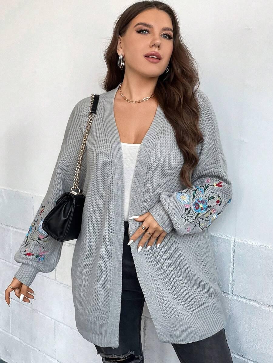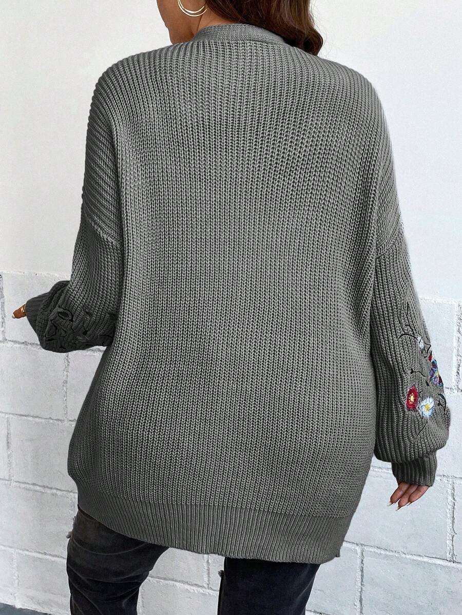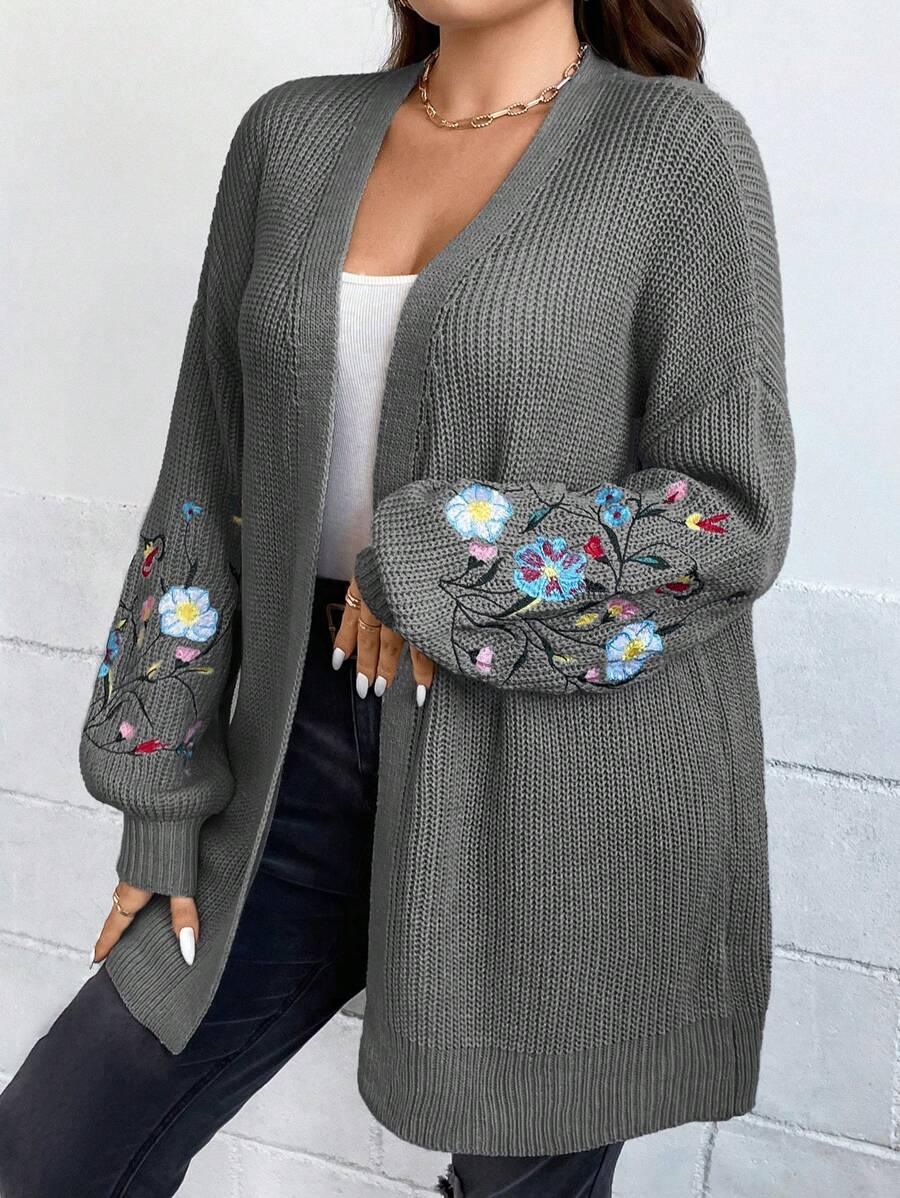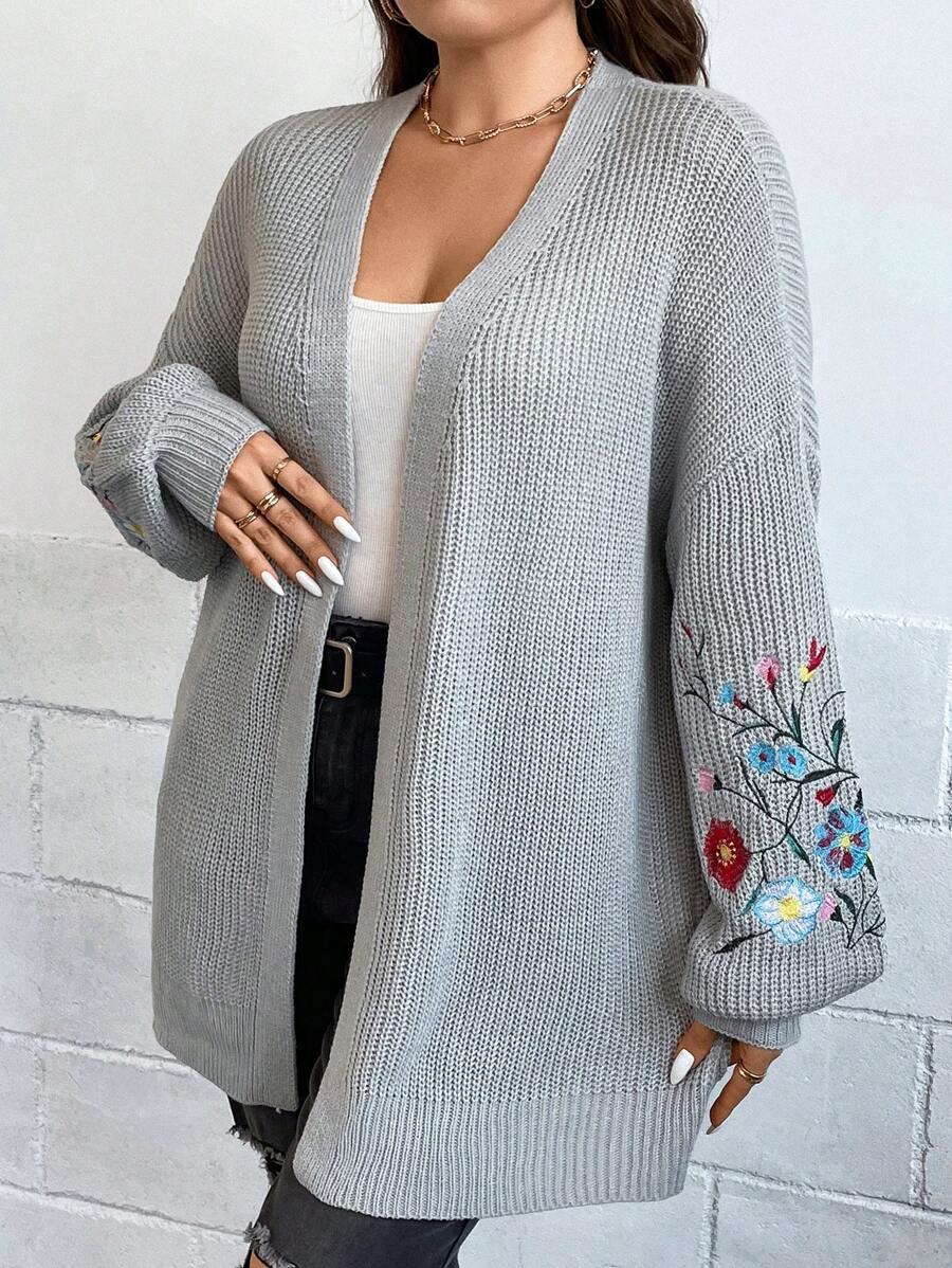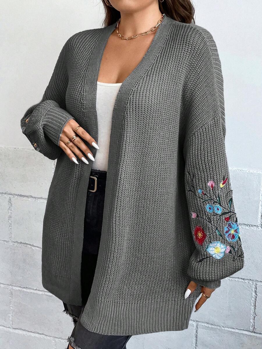 Floral Embroidery Duster Plus Cardigan floral accents are stitched into the fabric rather than printed, creating visual dimension. The stitching style stands out without overwhelming the surface. Combined with the subtle texture of the knitwear, it delivers a clean design suitable for casual and transitional wear.