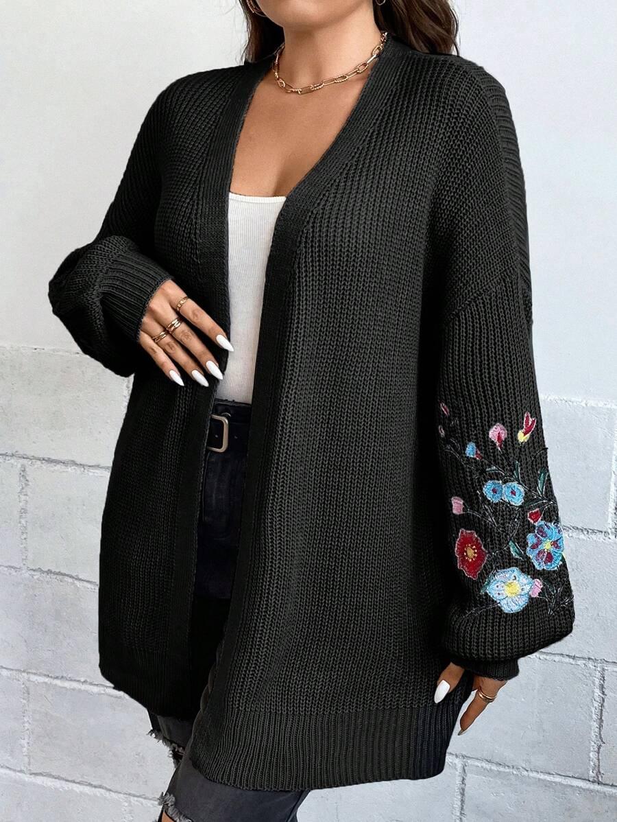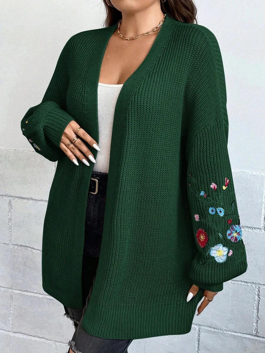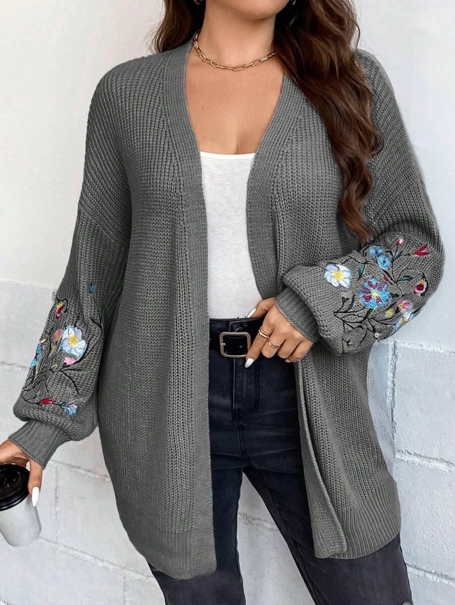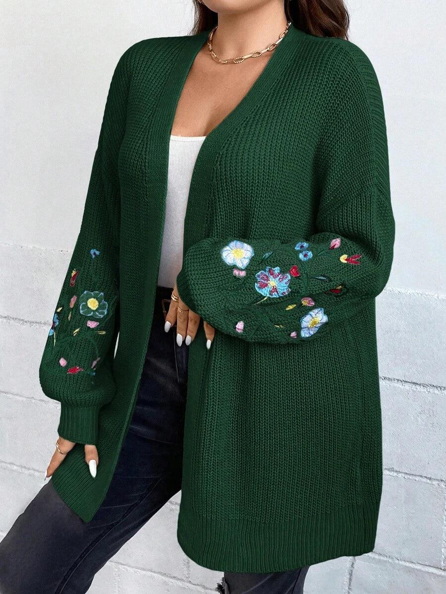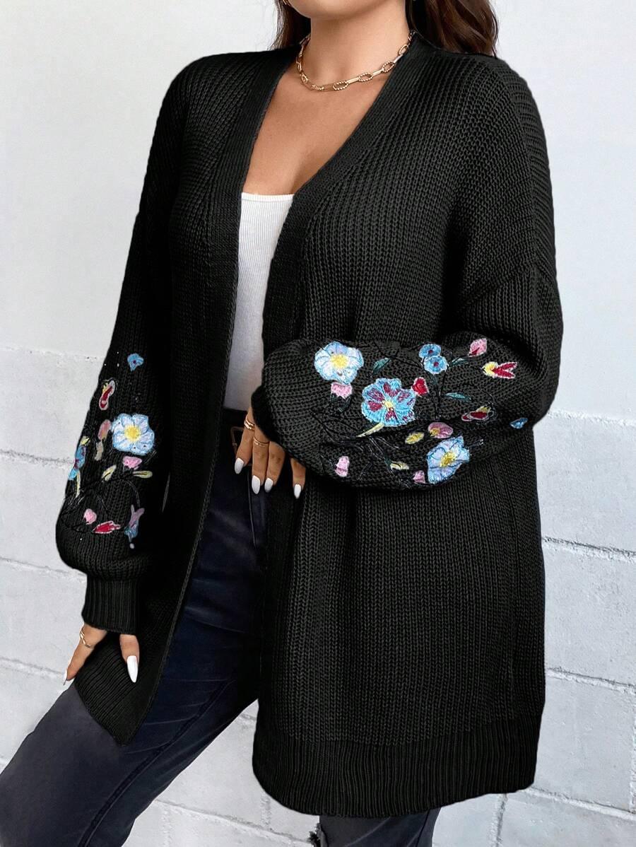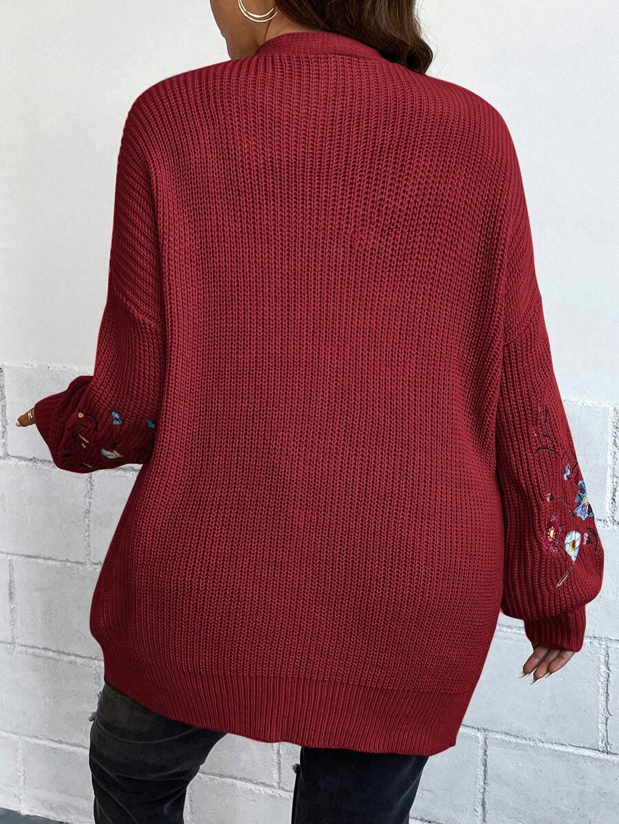 Floral Embroidery Duster Plus Cardigan floral accents are stitched into the fabric rather than printed, creating visual dimension. The stitching style stands out without overwhelming the surface. Combined with the subtle texture of the knitwear, it delivers a clean design suitable for casual and transitional wear.