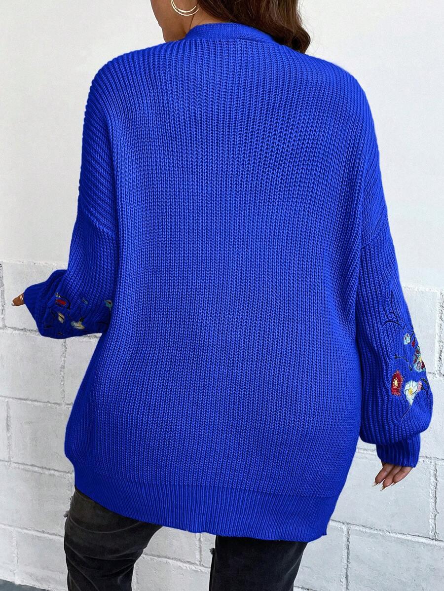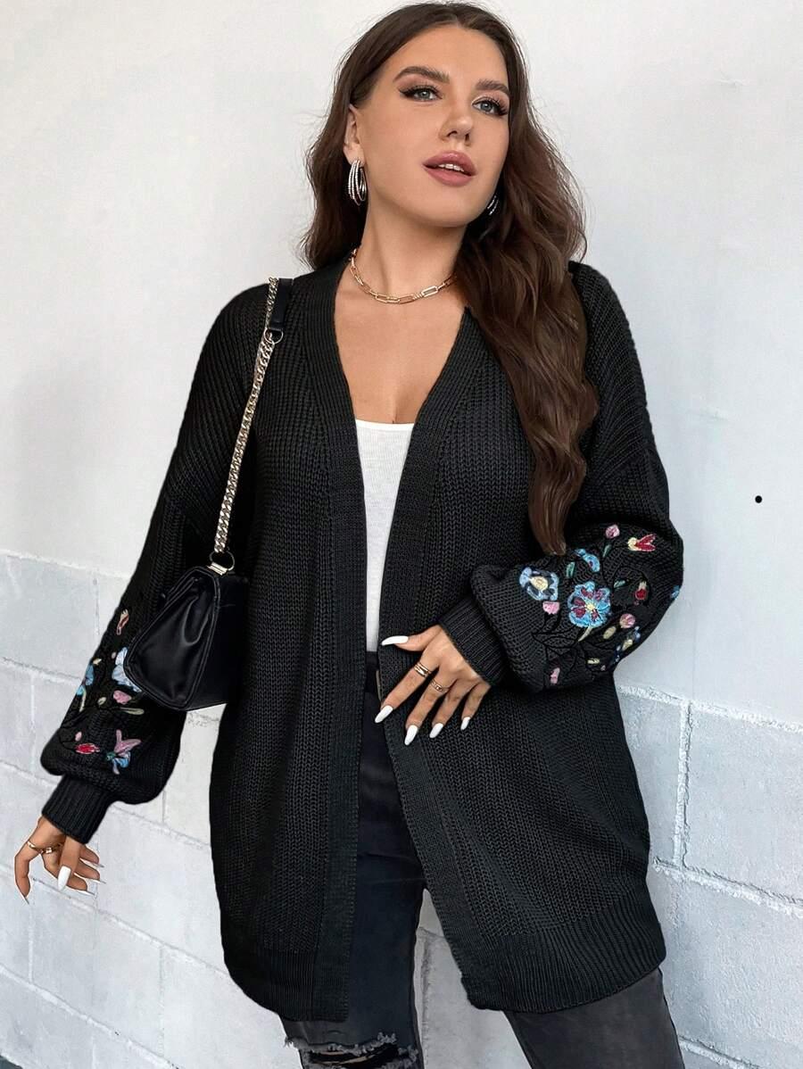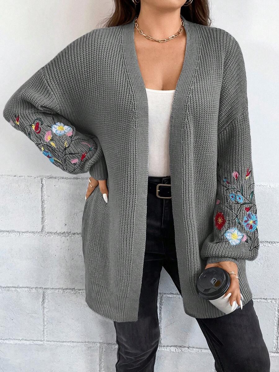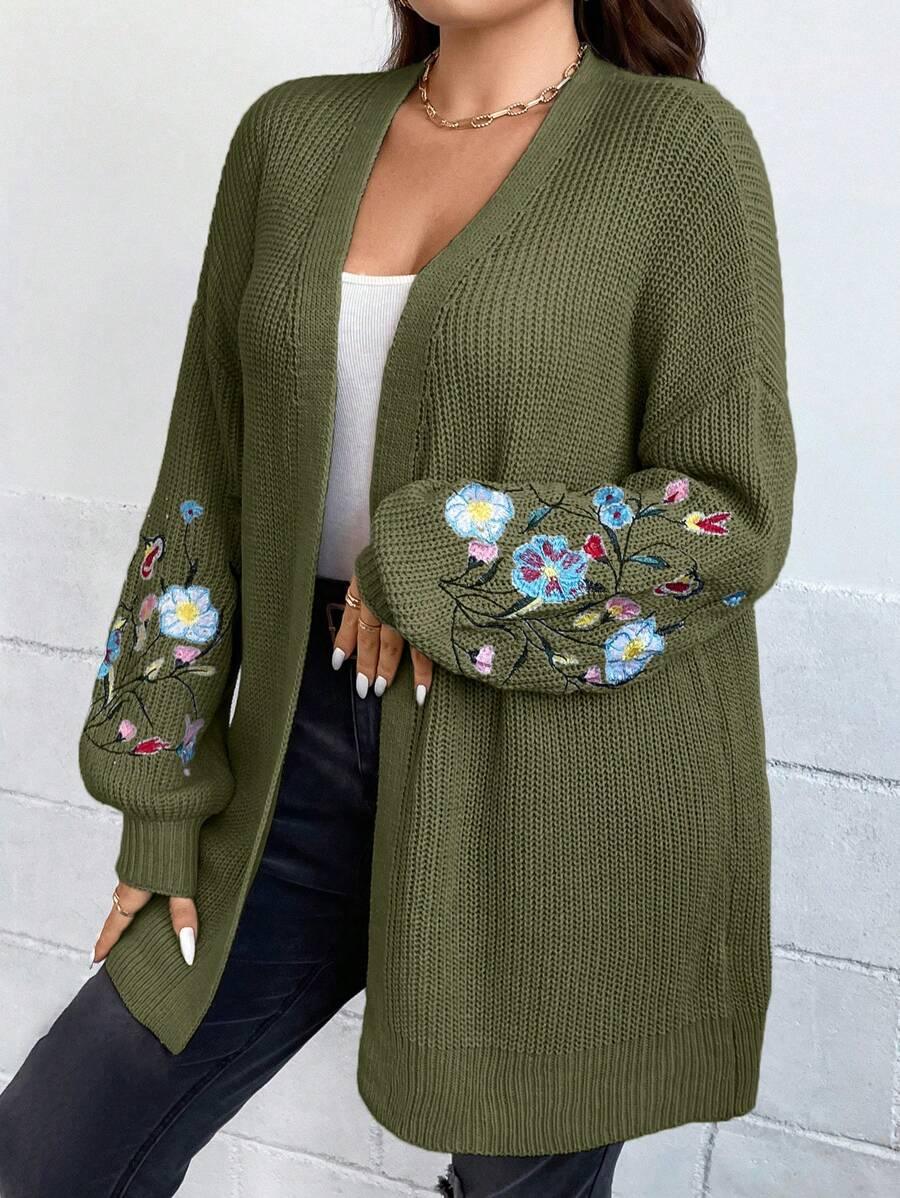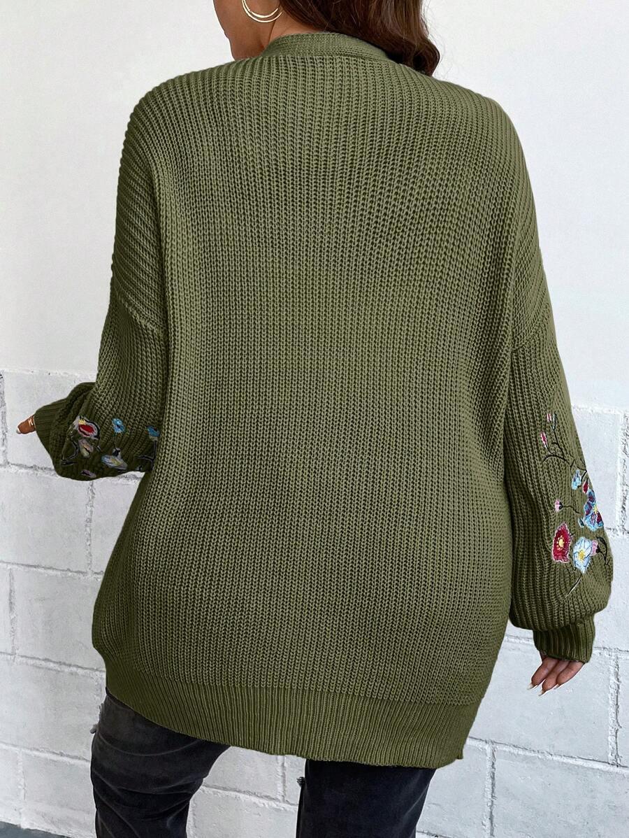 Floral Embroidery Duster Plus Cardigan floral accents are stitched into the fabric rather than printed, creating visual dimension. The stitching style stands out without overwhelming the surface. Combined with the subtle texture of the knitwear, it delivers a clean design suitable for casual and transitional wear.