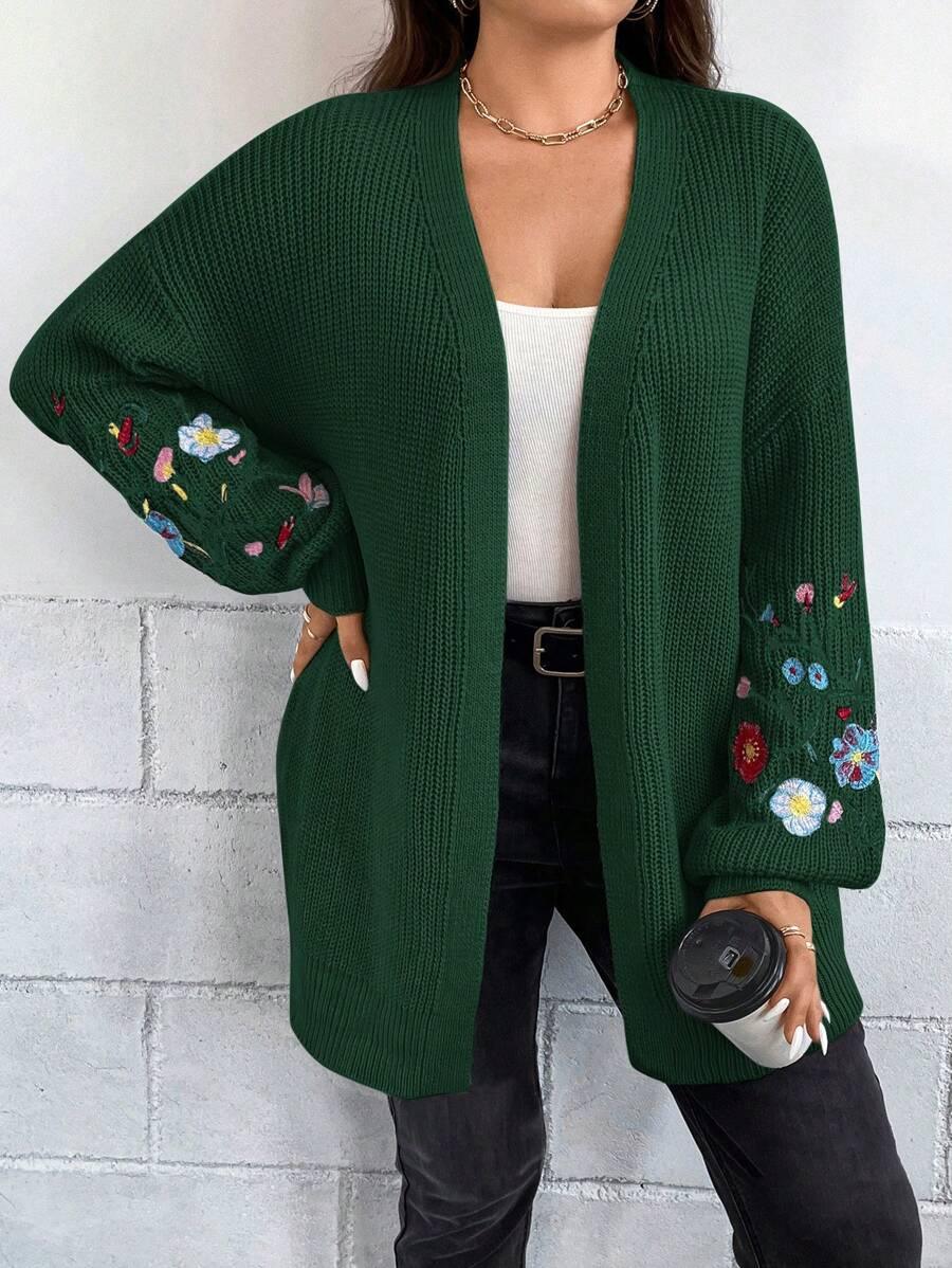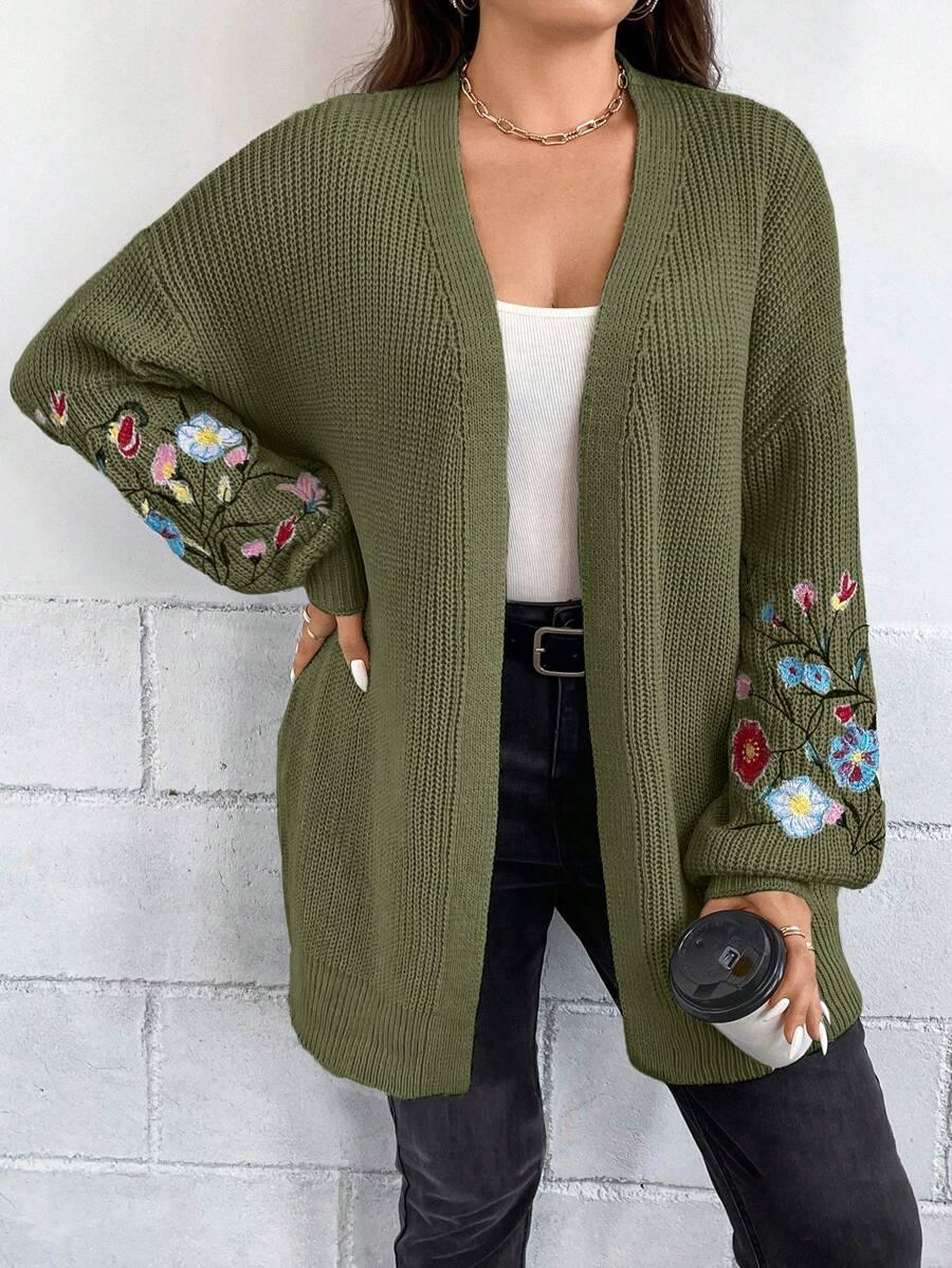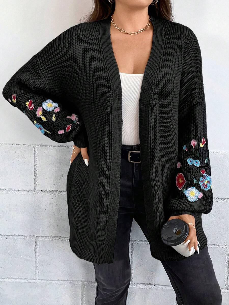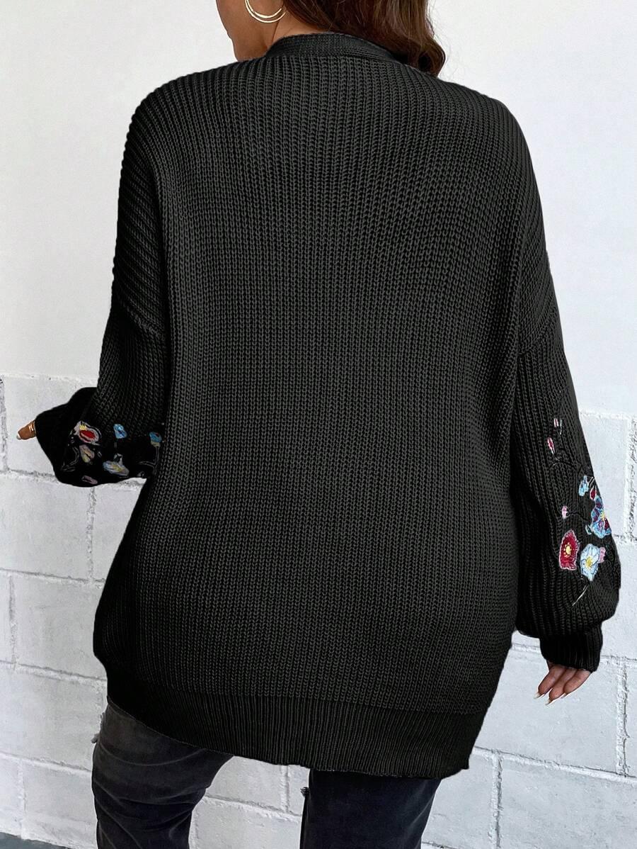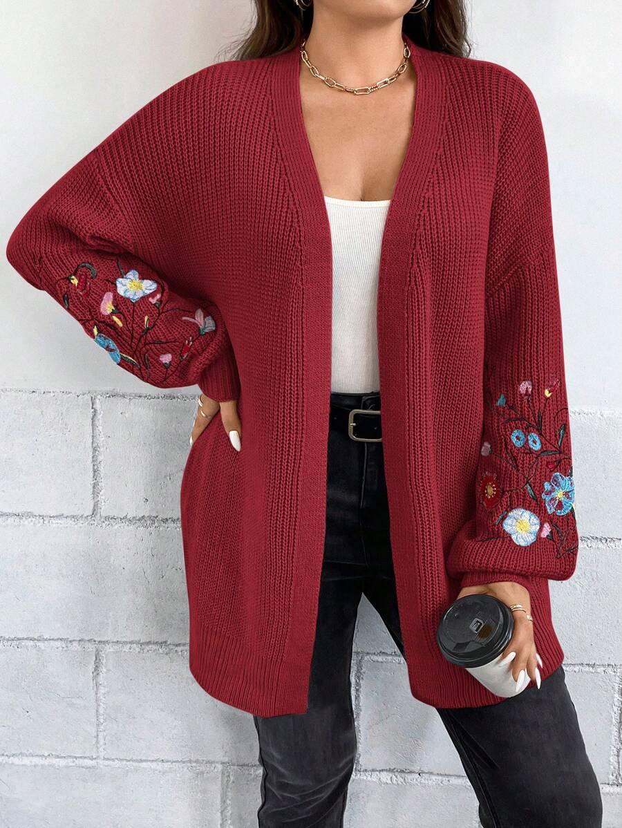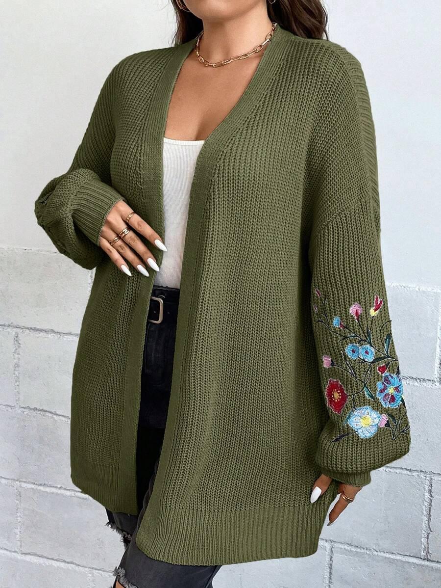 Floral Embroidery Duster Plus Cardigan floral accents are stitched into the fabric rather than printed, creating visual dimension. The stitching style stands out without overwhelming the surface. Combined with the subtle texture of the knitwear, it delivers a clean design suitable for casual and transitional wear.