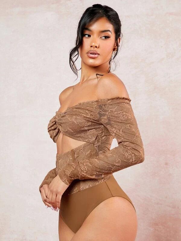 Stunning Floral Lace Cut-Out Bodysuit This gorgeous bodysuit features an off-the-shoulder neckline with a cut-out detail that adds a touch of playful flair to your outfit. The floral lace fabric is sheer and delicate, while the twist detail at the front adds a unique and elegant touch. The long sleeves and natural waistline create a slimming effect, and the slight stretch fabric ensures a comfortable and flattering fit.