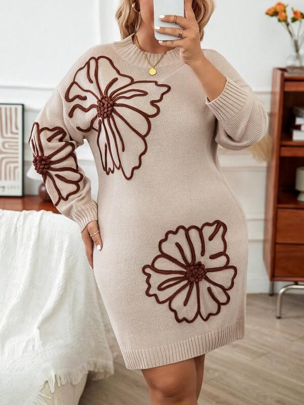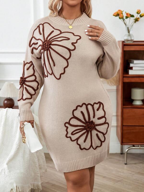 The Elegant Floral Pattern Sweater Dress blends simple structure with detailed design, providing a practical option for those seeking comfort with understated pattern accents. Designed with floral appliques, this knitwear dress combines a clean outline with subtle character, ideal for casual outfits during mild weather.
