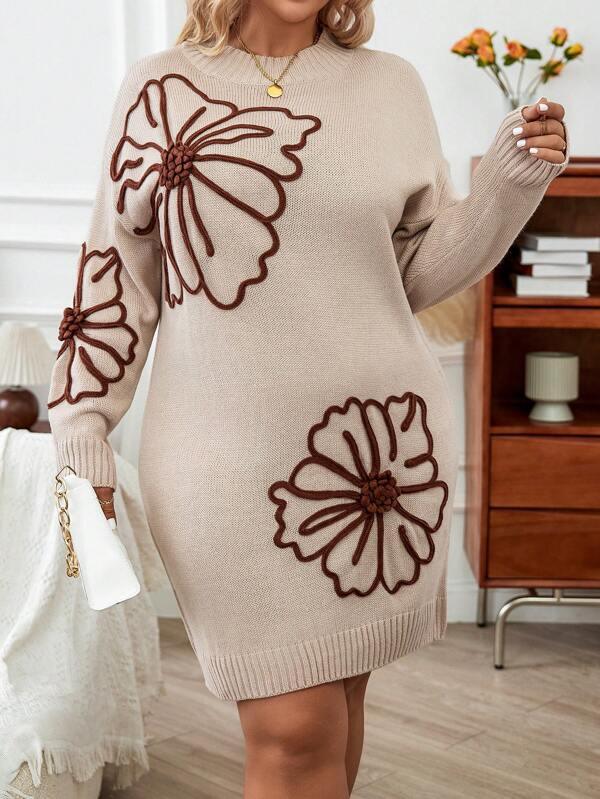 The floral applique accents and knitwear structure provide comfort and visual interest, while the simple outline keeps the look balanced. Whether worn alone or styled with footwear and accessories, the Floral Pattern Sweater Dress adds comfort and subtle pattern to casual outfits for mild weather.