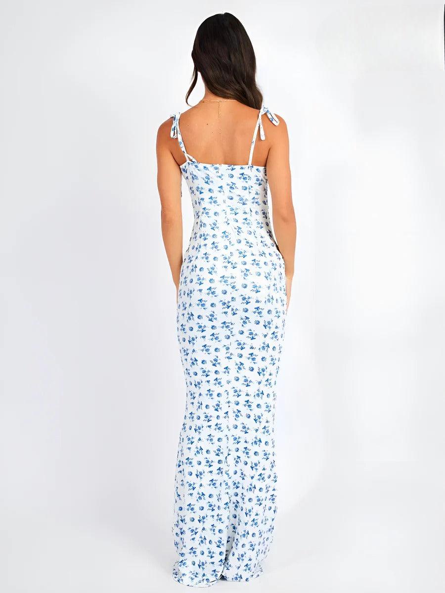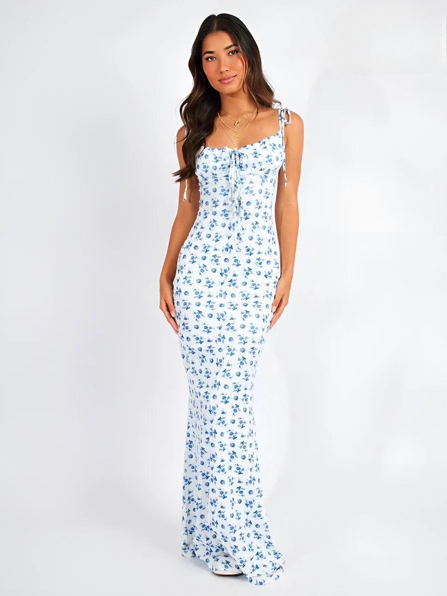 The shoulder straps are tied for a custom fit, allowing you to adjust the neckline and overall length based on your preference. These ties also add a subtle decorative element that complements the floral design.