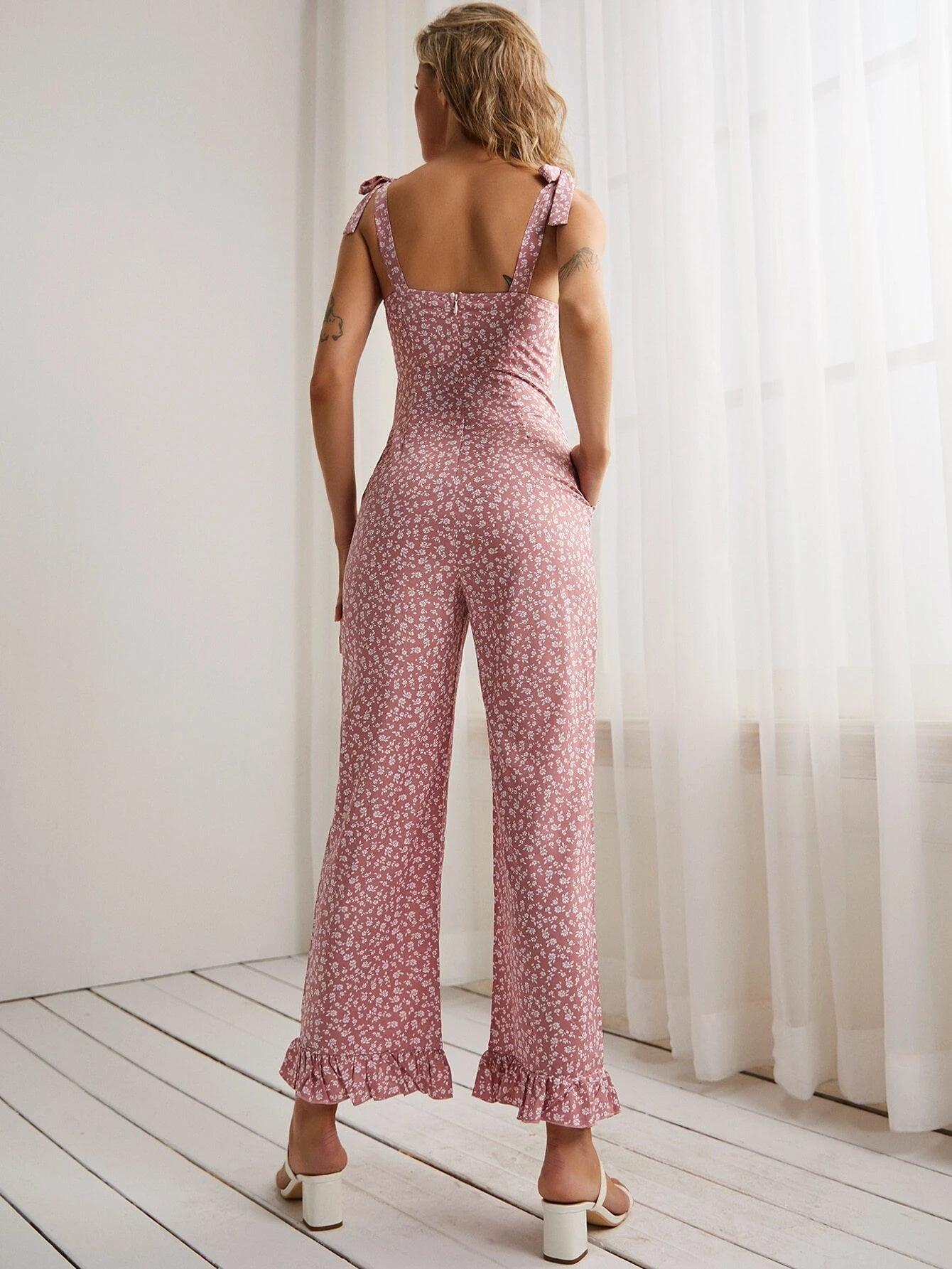The Floral Print Drawstring Ruffle Hem Cami Jumpsuit is a stylish and comfortable outfit that is perfect for any casual occasion. It features a ditsy floral pattern all over the fabric, giving it a charming and playful look. The cami top has knot details and a tie front, along with straps for support, making it easy to adjust to your liking. While the ruffle hem adds a touch of femininity. The jumpsuit is made of a slight stretch fabric that ensures comfort and ease of movement.