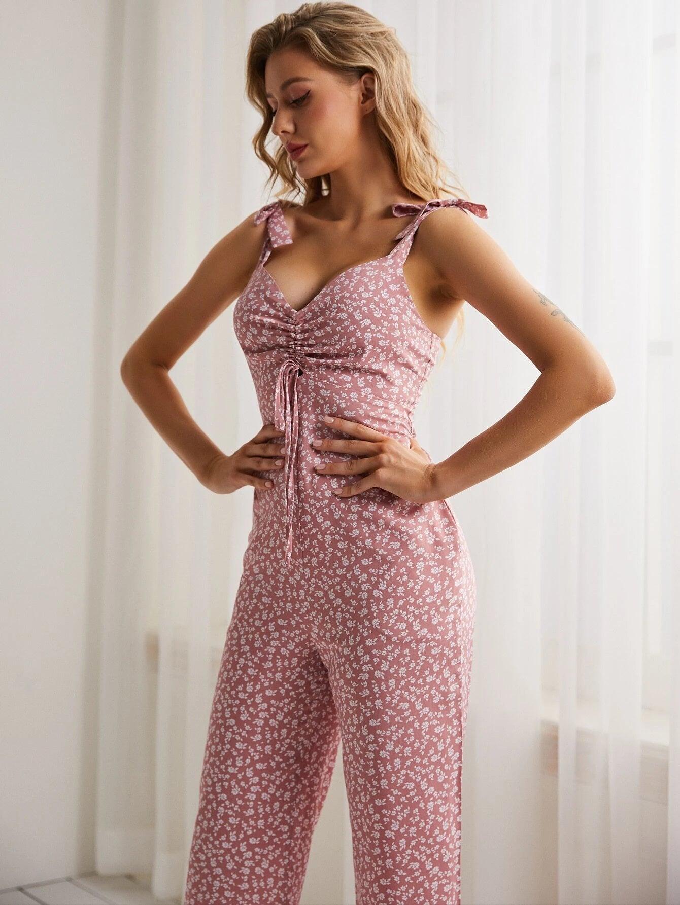 Floral Print Drawstring Ruffle Hem Cami Jumpsuit