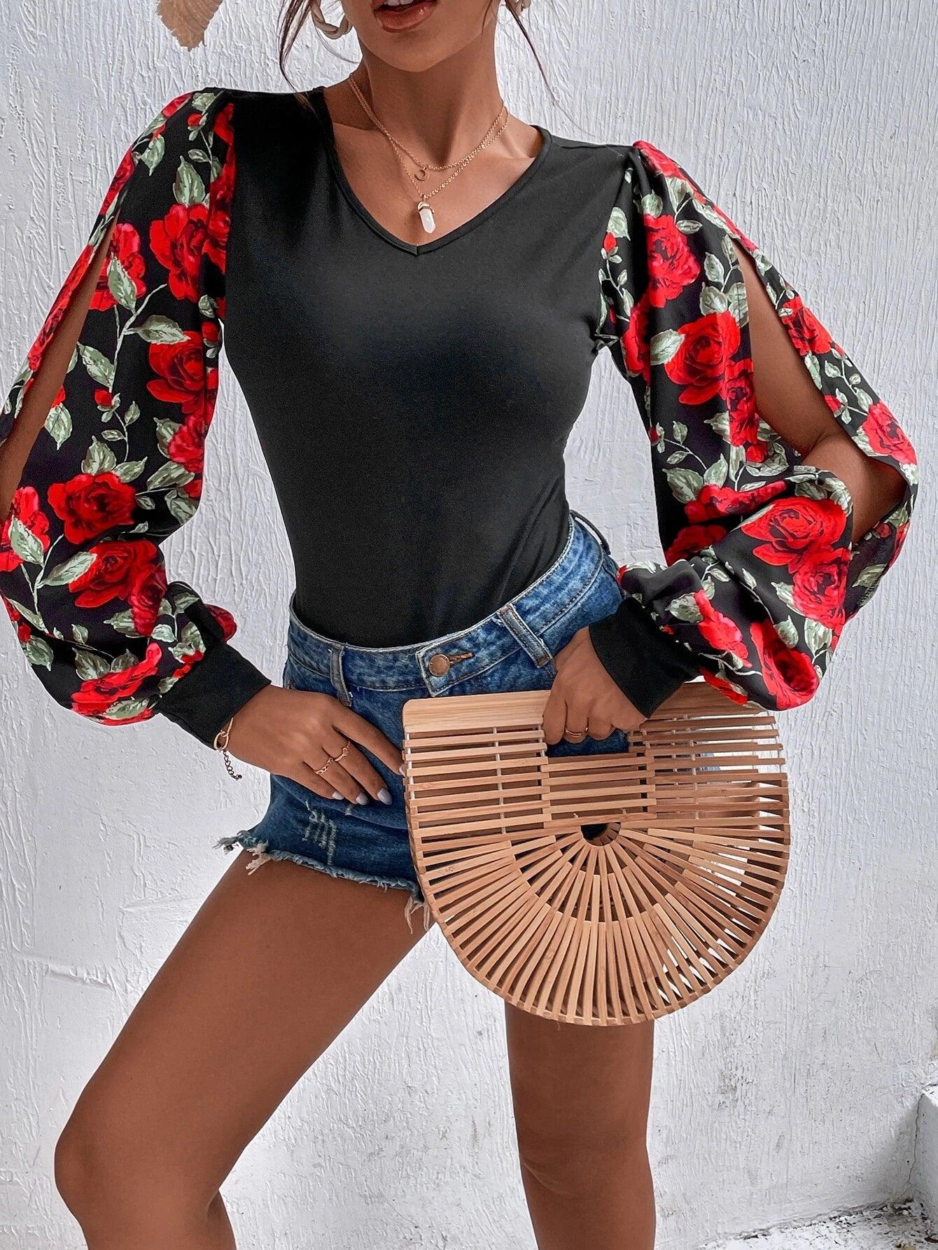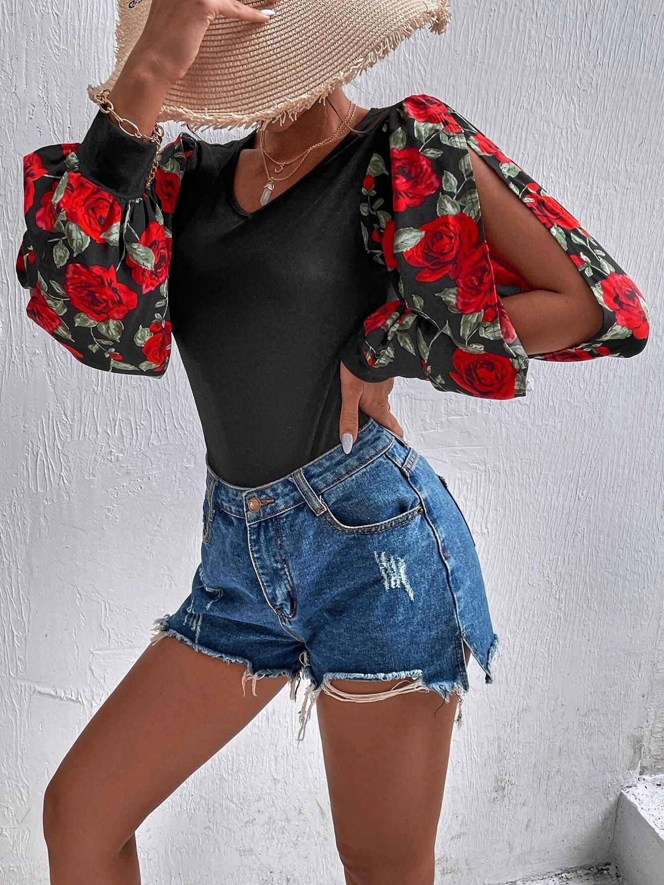 Floral Print Lantern Sleeve Bodysuit