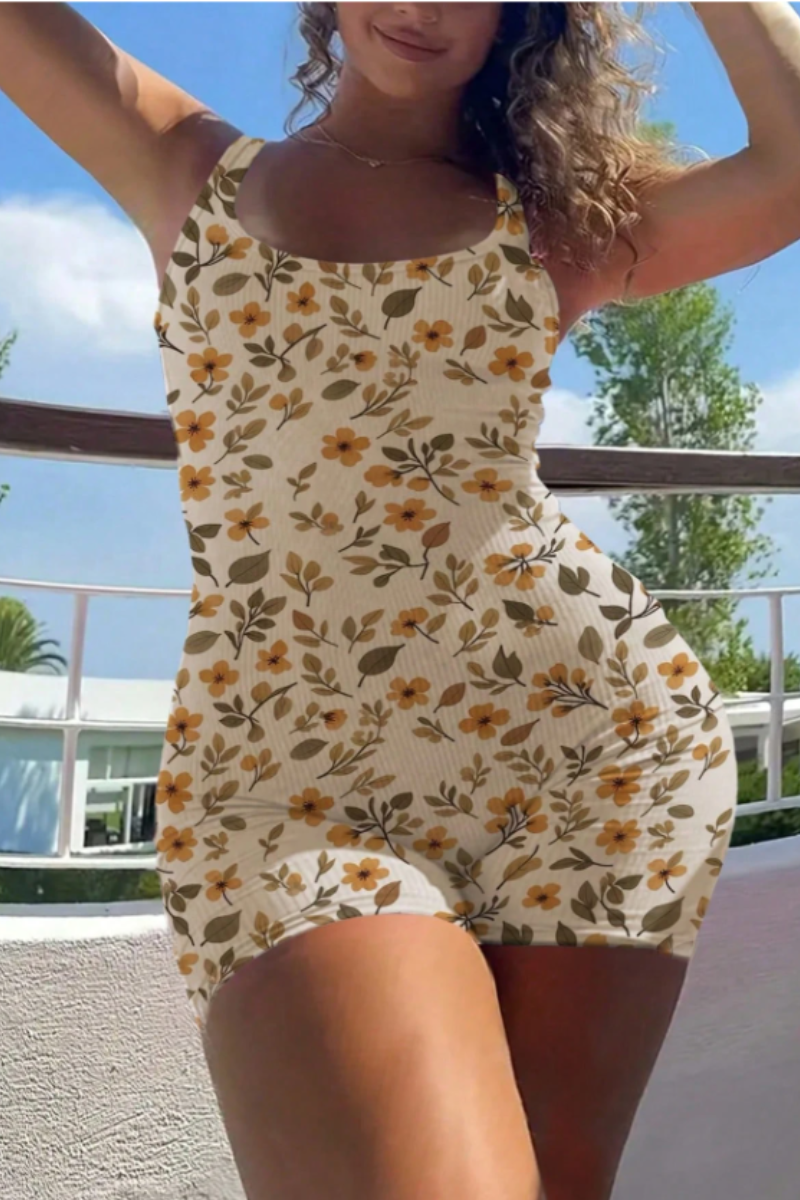 This Floral Print Ribbed Romper provides the perfect balance of comfort and style. The ribbed fabric gives it structure while still feeling soft. The floral print adds a fun touch to a minimalist design, making it versatile enough for any casual occasion. Its stretchy material provides a flattering fit while allowing you to move freely, and the scoop neck and sleeveless design ensure you stay cool during warmer days.
