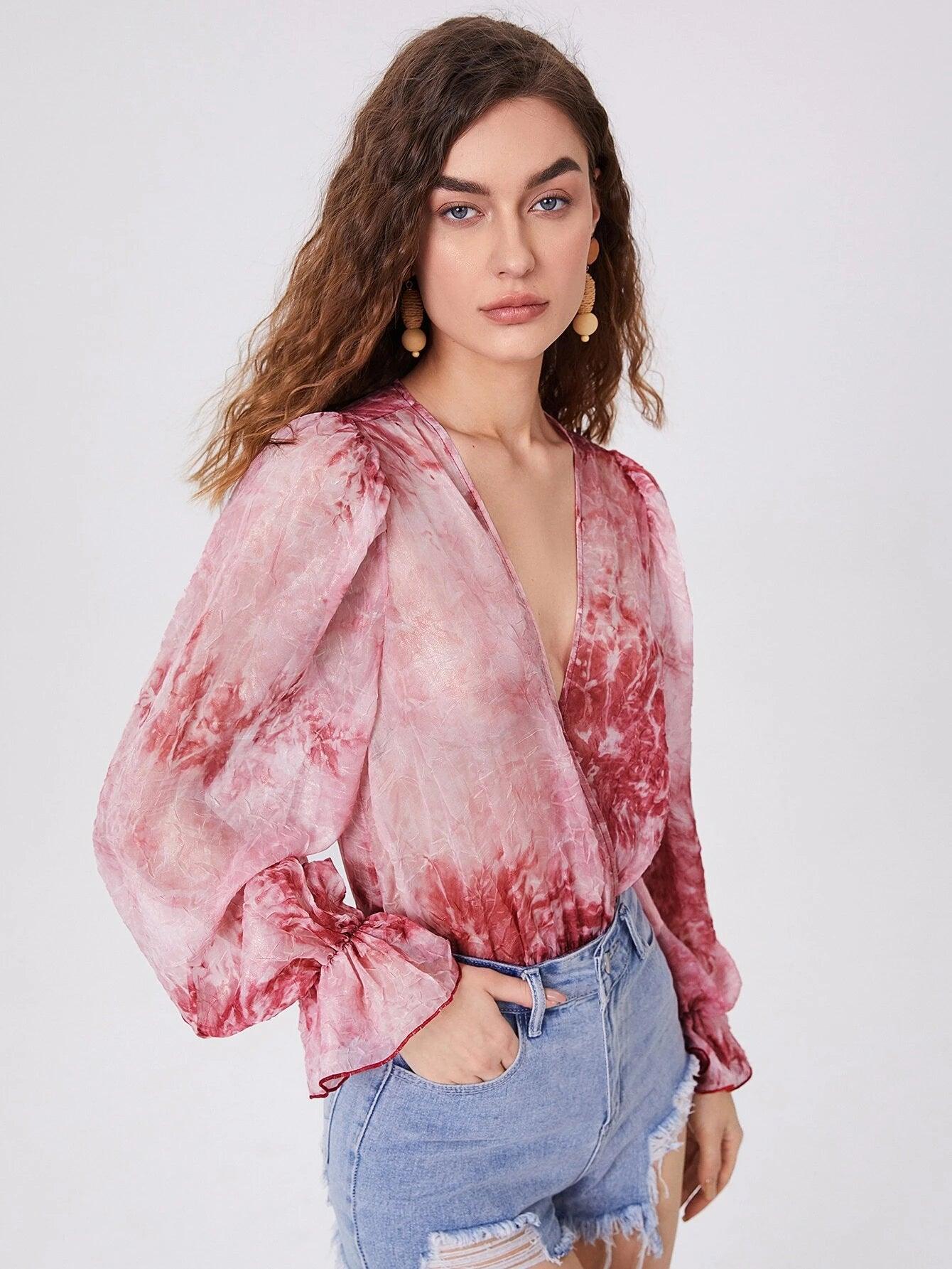 Introducing our Flounce Sleeve Bodysuit Without Panty - the epitome of elegance and style. Featuring a stunning tie-dye pattern, V-neckline, and gorgeous flounce sleeves, this bodysuit is perfect for any occasion. The high waist and regular fit ensure a flattering silhouette, while the ruffle details add a touch of femininity. Made with high-quality polyester and semi-sheer fabric, this bodysuit is both comfortable and stylish. Hand wash for best care. Perfect for an elegant and sophisticated look. Shop now on Comfy Jumpsuits.