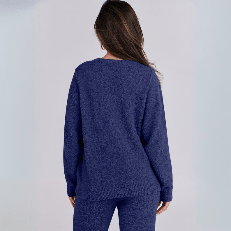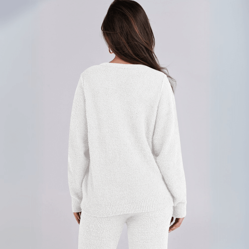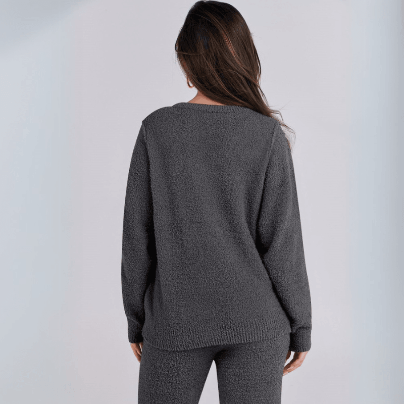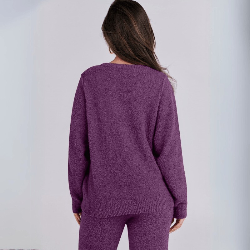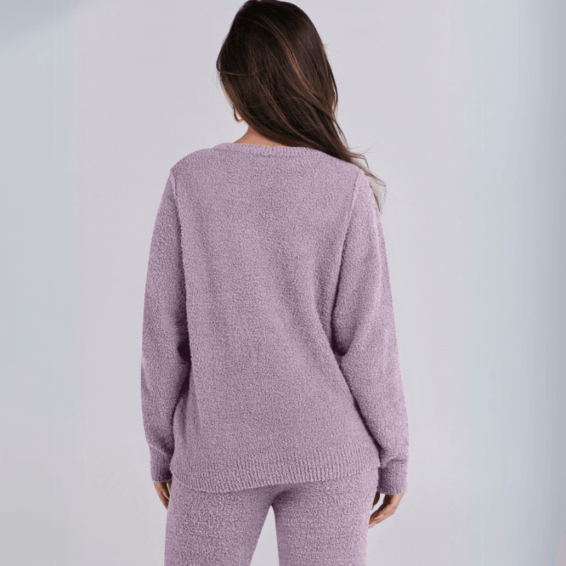 The top can be worn as a standalone fleece sweater set or styled under jackets for extra layering. The pants maintain their structure while still delivering a soft, lived-in feel. This comfort lounge set works well in colder seasons or simply for anyone who values softness in daily wear.