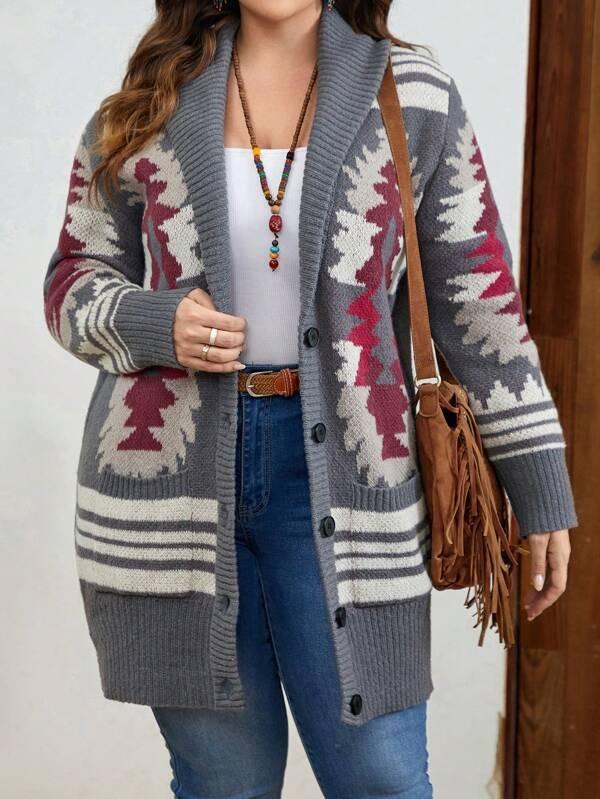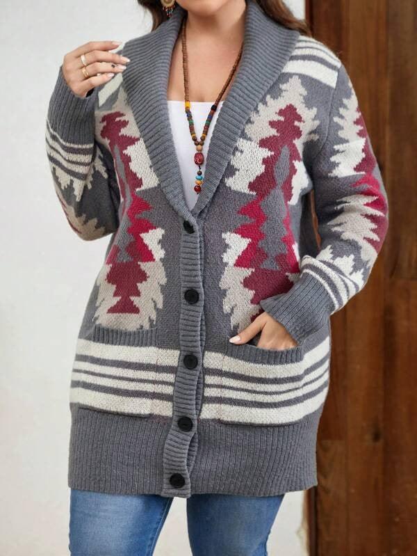 The Geo Pattern Shawl Cardigan provides a strong seasonal layering option. The bold geometric design adds texture and structure to even the simplest outfits. Its multicolor pattern allows you to pair it with a variety of tones while maintaining a cohesive look. The shawl collar knitwear frame supports layering across tops and light base layers.