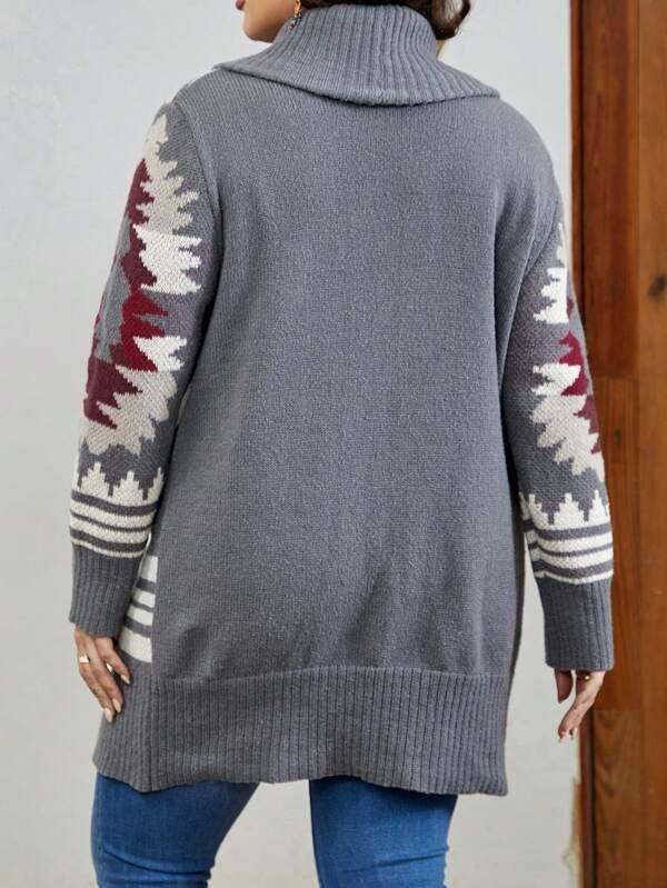 The Geo Pattern Shawl Cardigan delivers warmth, structure, and bold design in one effortless outer layer. Featuring a multicolor geometric pattern, this sweater adds visual depth to cold-season outfits. The cardigan’s tailored shape, combined with a thigh-length cut and open-front structure, supports everyday wear across a variety of settings. It’s a blend of statement style and practical layering.