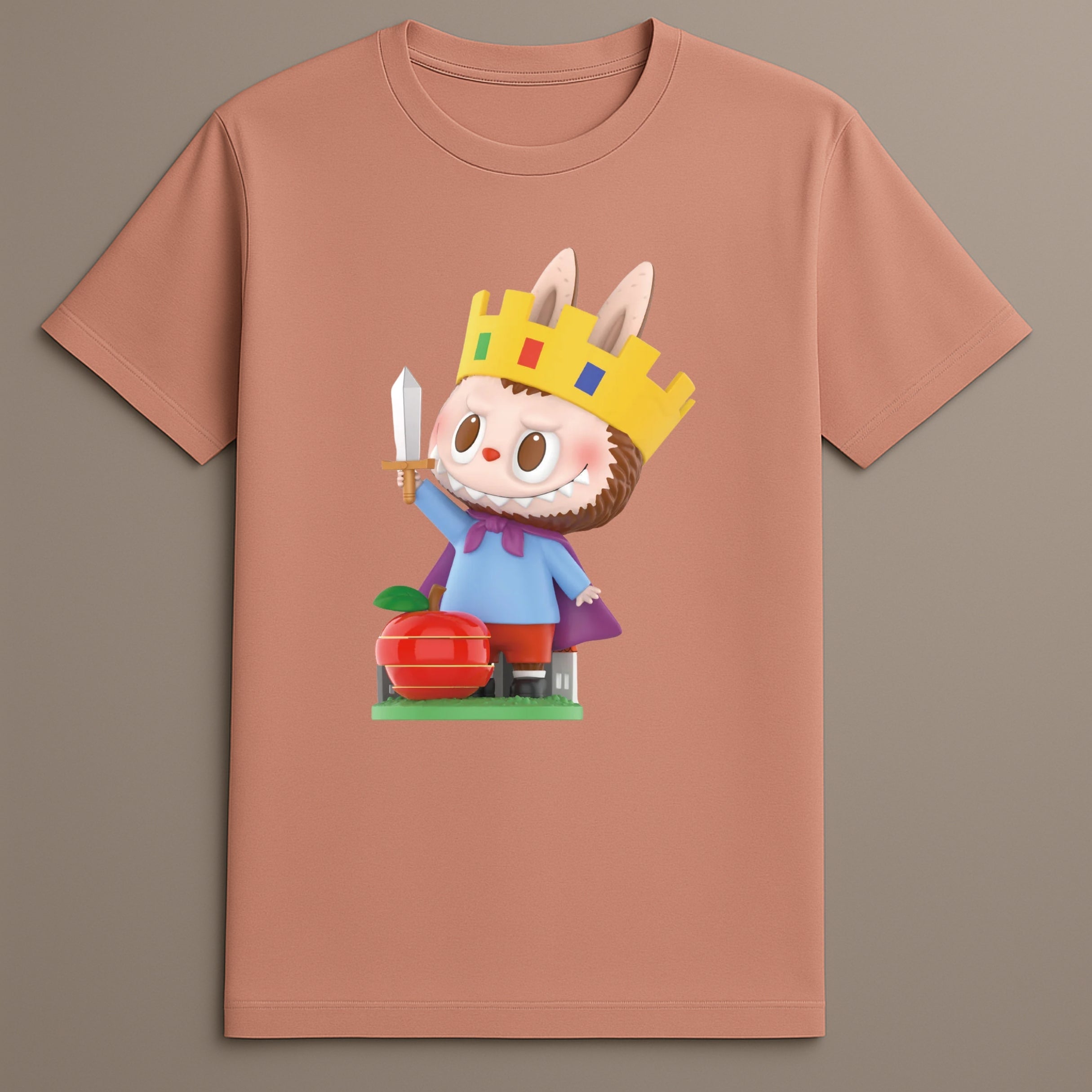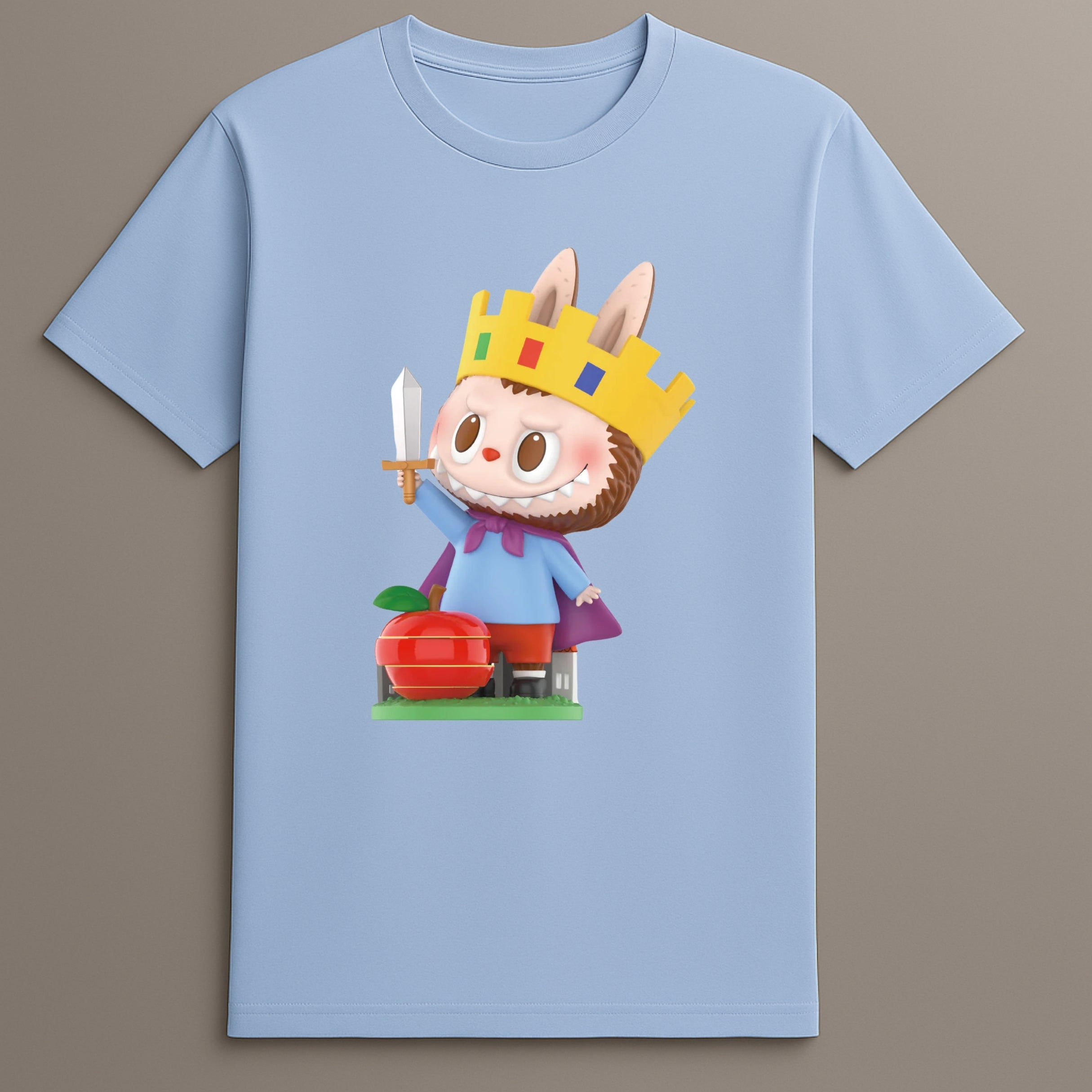 Apple Graphic Shirt Visual: The design shows Labubu holding a sword standing by a fruit. This apple graphic shirt mixes and light humor. The artwork stays sharp and detailed after regular washing. The placement sits centered to highlight the design clearly. This layout supports visual interest without loud patterns.