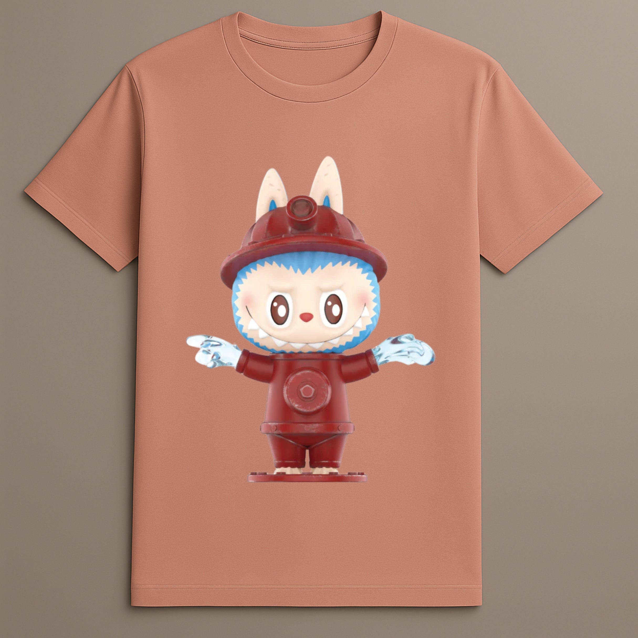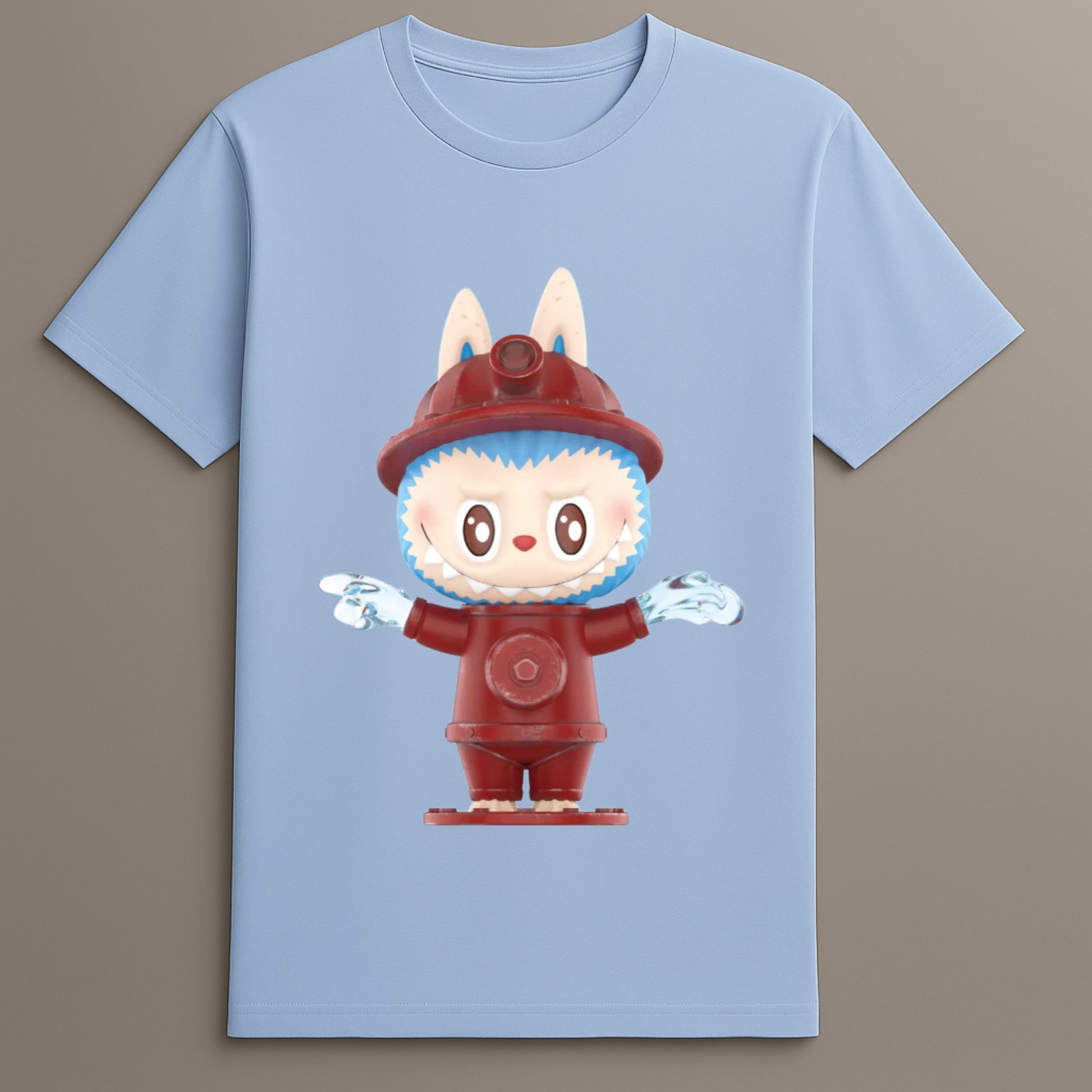 Graphic Art Print: The shirt features a digitally rendered print of Labubu dressed in a red fire hydrant outfit. The image is centered for focus and clarity, showcasing playful expression with comic styling.